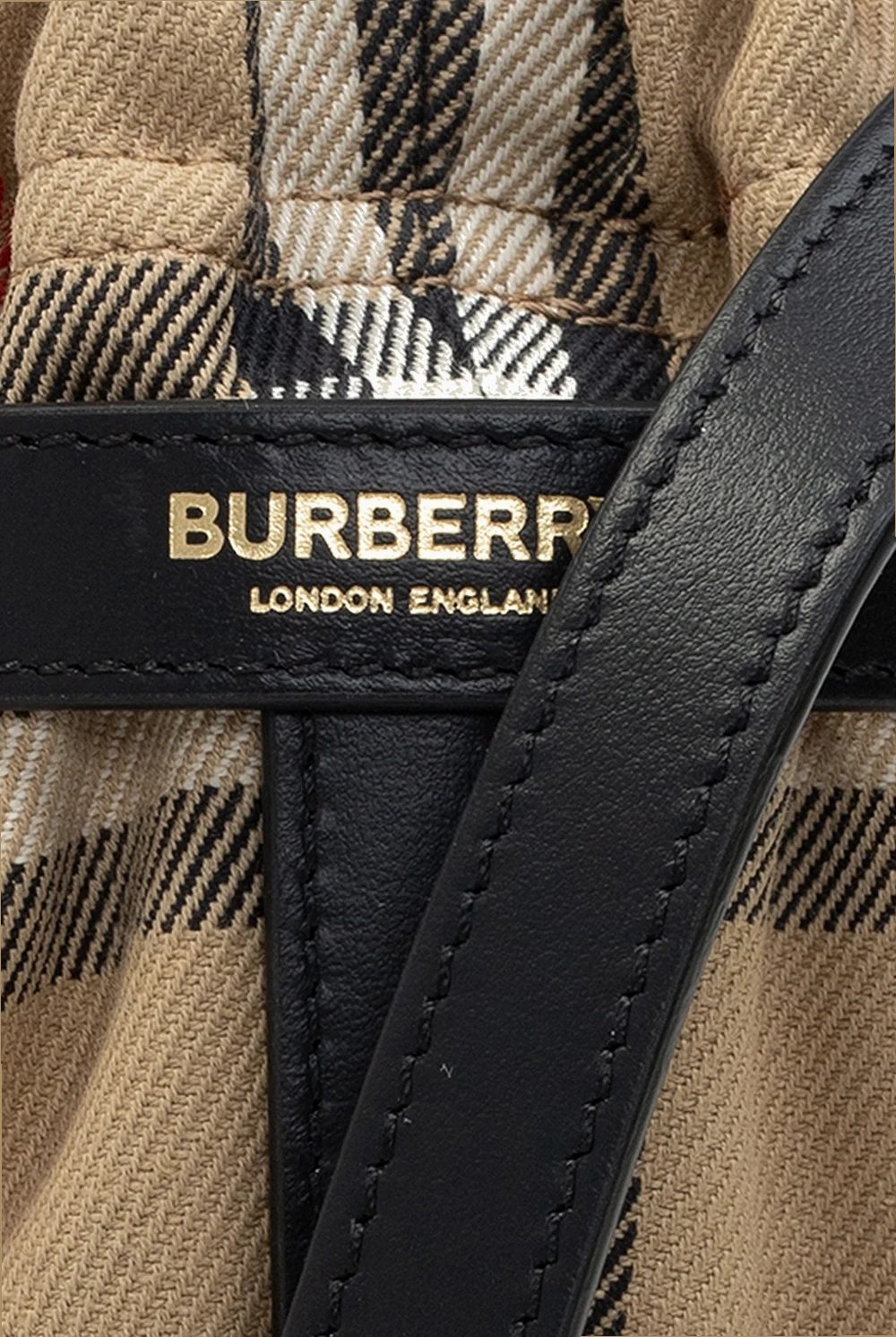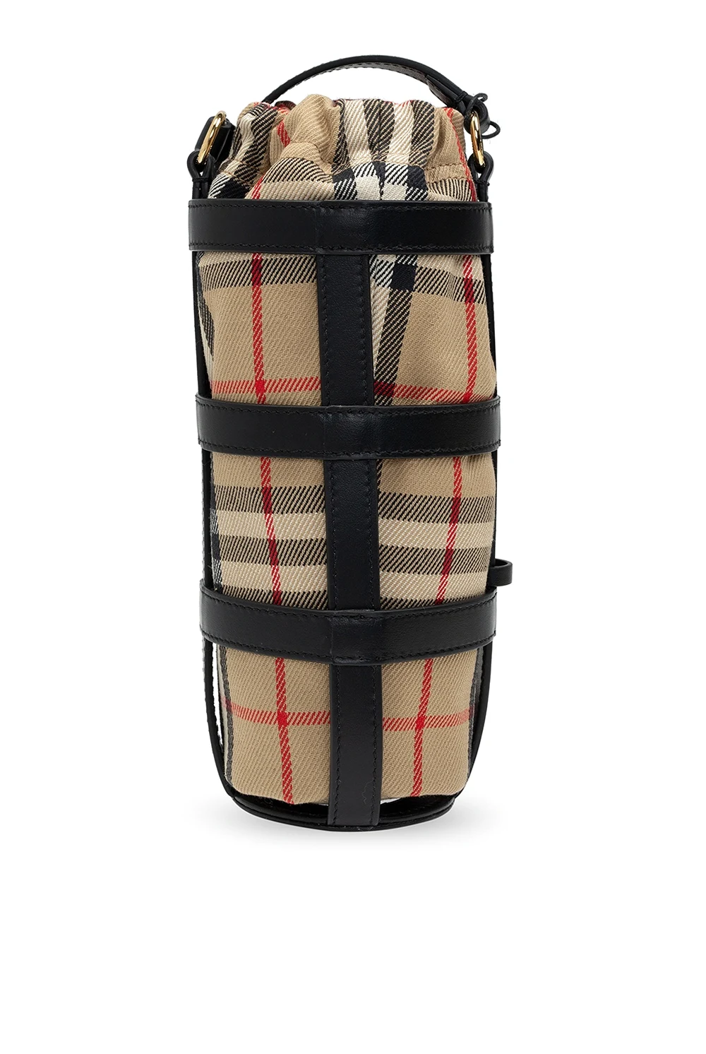 Beżowe etui na butelkę Burberry. Ozdobione charakterystyczną dla marki kratą w kolorze czarno-biało-czerwoną. Na górze ściągana trokami. Wytłoczone logo w kolorze złotym. Dołączony pas na ramię z możliwością regulacji długości. Wewnątrz komora. Skórzane wykończenie.