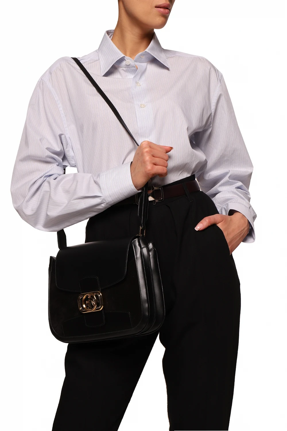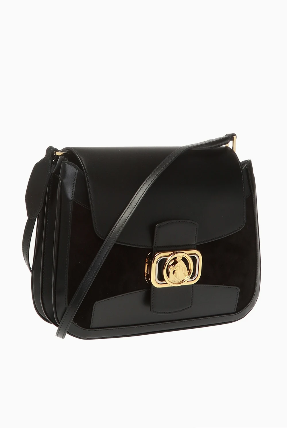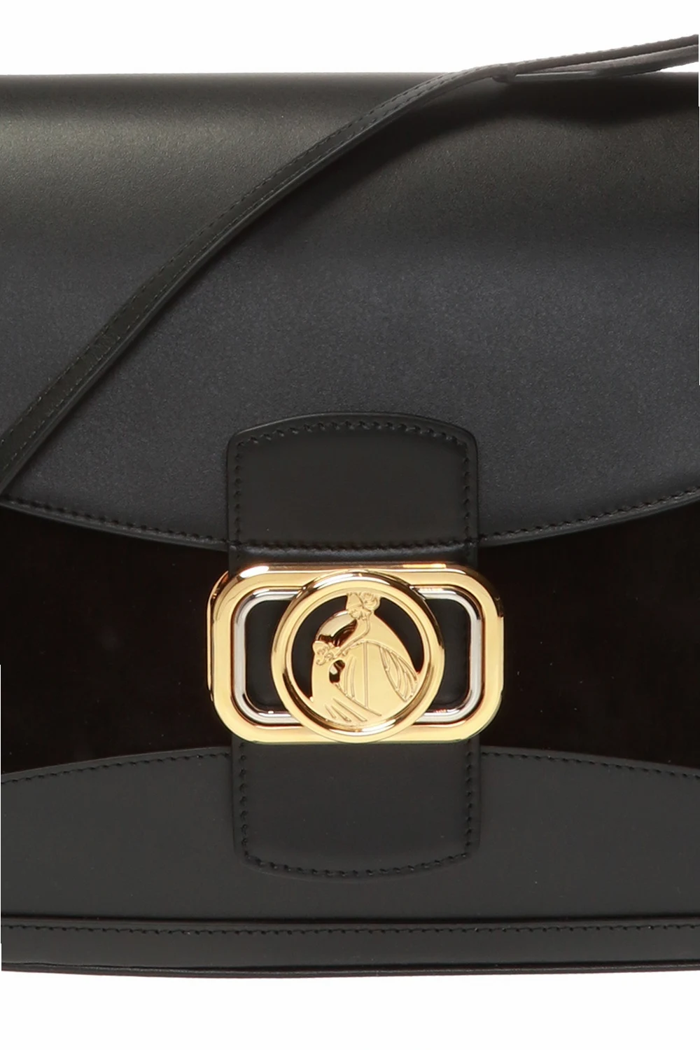 Czarna, skórzana torba na ramię, model 'Swan' Lanvin. Zamykana na dekoracyjny zatrzask z logo. Regulowany pasek na ramię. Wewnątrz trzy komory oraz jedna wsuwana kieszeń.