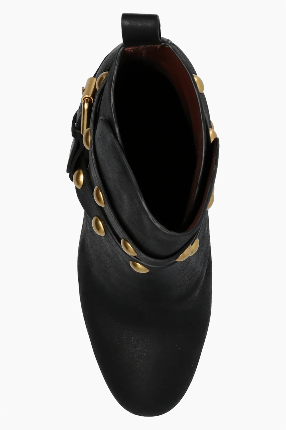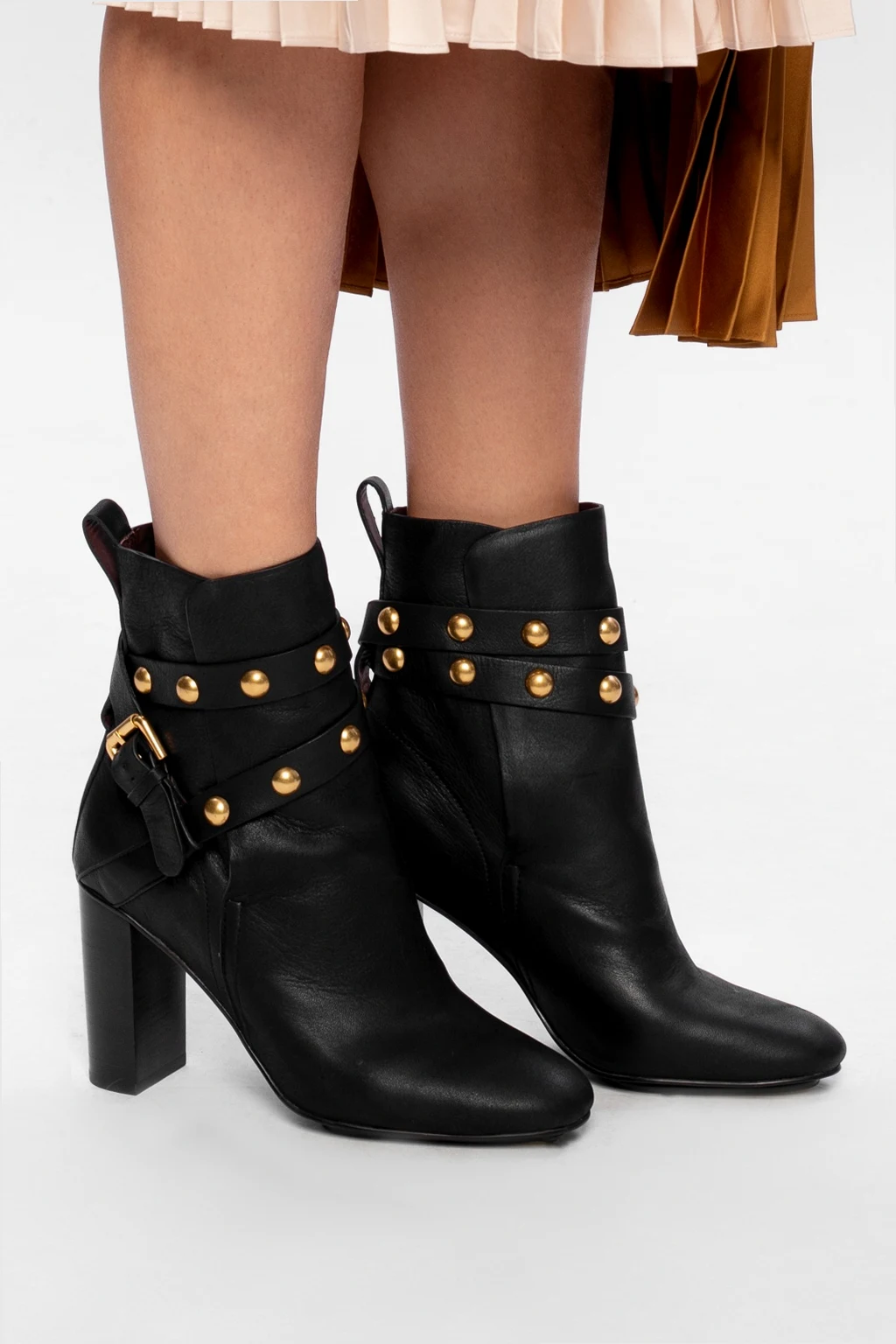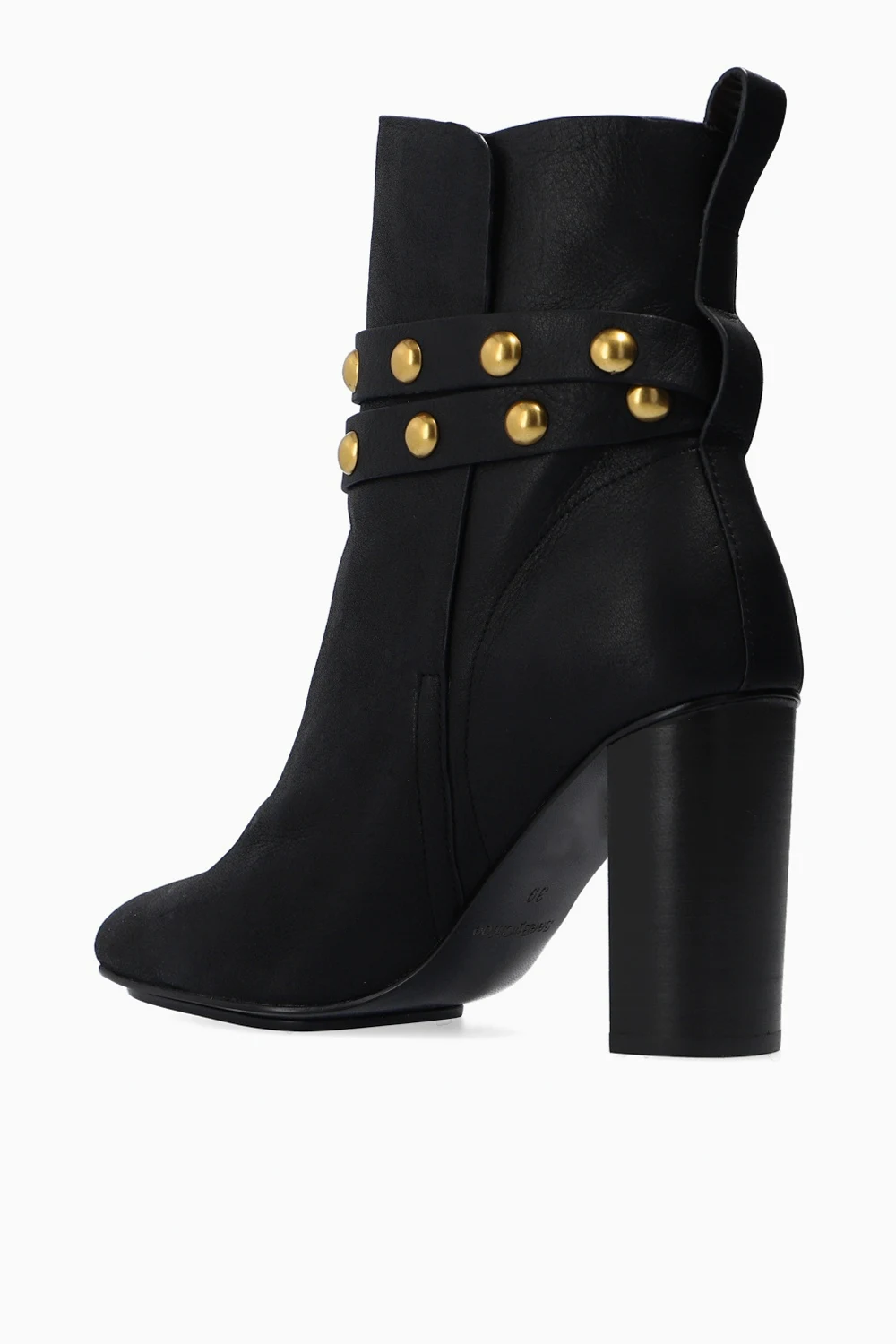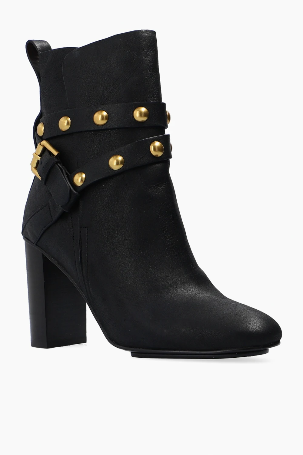 Czarne botki na obcasie, model ‘Janis’ See By Chloé. Wykonane ze skóry o specjalnej fakturze. Zapinane na pasek z klamrą. Dekoracyjne aplikacje w kolorze złotym. Ciemnobrązowa, gumowa podeszwa.