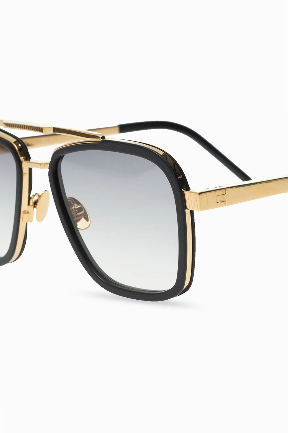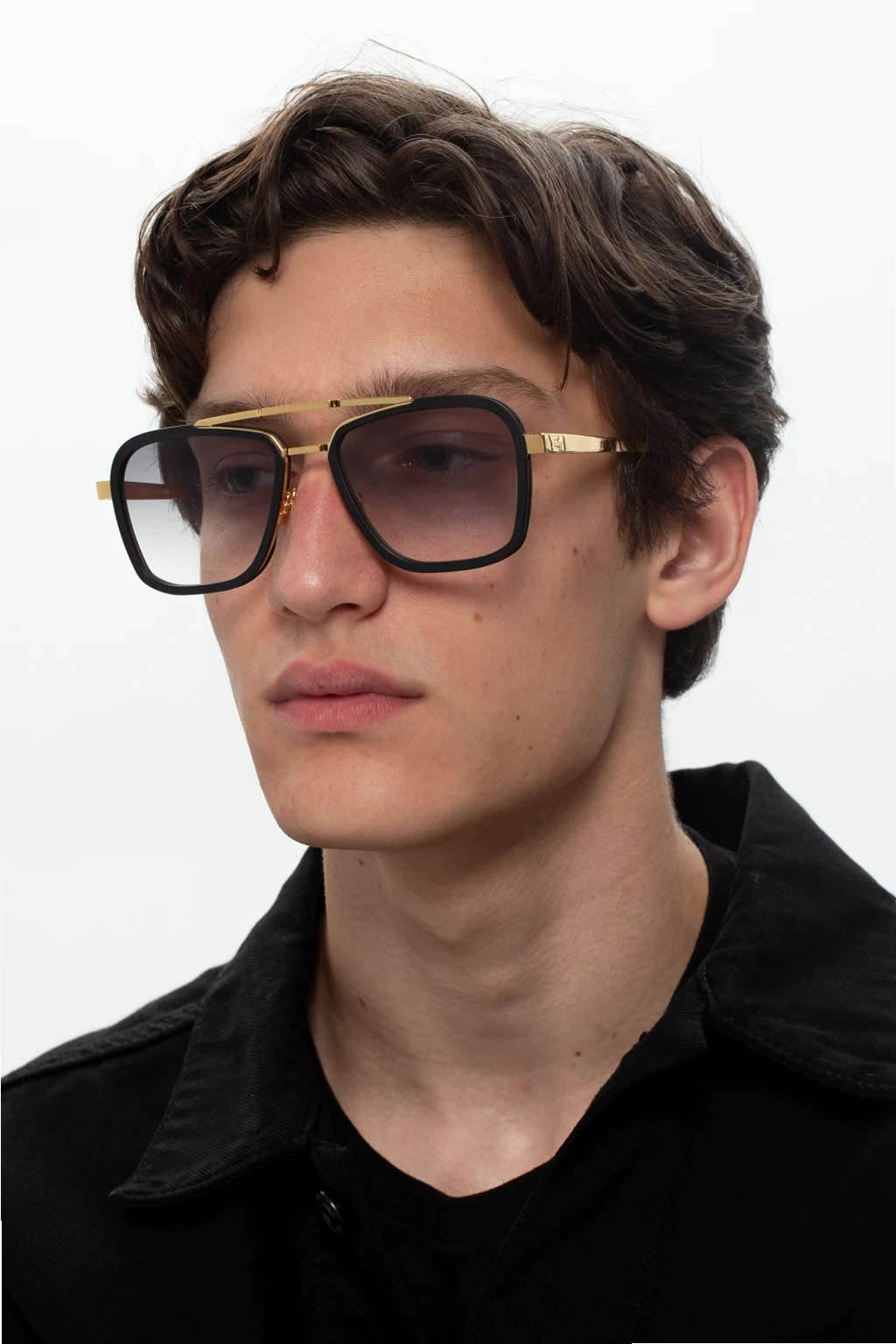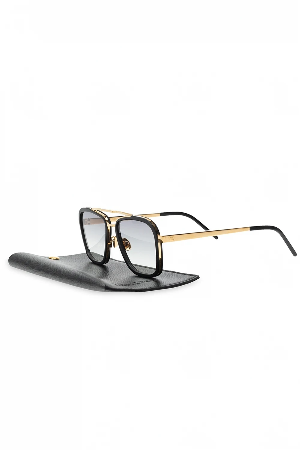 Okulary przeciwsłoneczne w kolorze złoto-czarnym, model ‘Marvin G’ John Dalia. Wewnątrz nauszników wytłoczone logo oraz nazwa modelu. Podwójny mostek. Czarne, certyfikowane soczewki UVA/UVB. Dołączone etui.