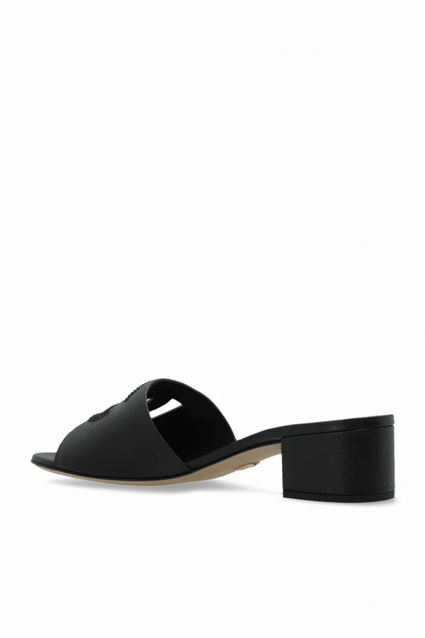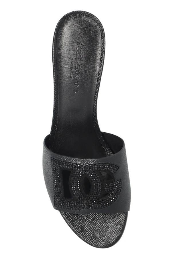 Klapki na obcasie z logo od Dolce & Gabbana to kwintesencja włoskiego wyrafinowania. Projekt utrzymany w głębokim, czarnym kolorze urzeka minimalistyczną formą typu mule na stabilnym, prostokątnym obcasie. Otwarte przody oraz odkryte pięty subtelnie odsłaniają stopę, zapewniając swobodę i wyszukany wygląd.