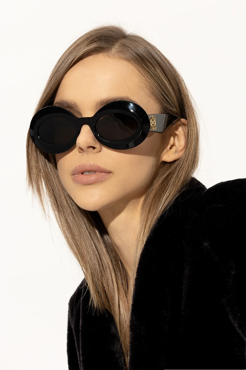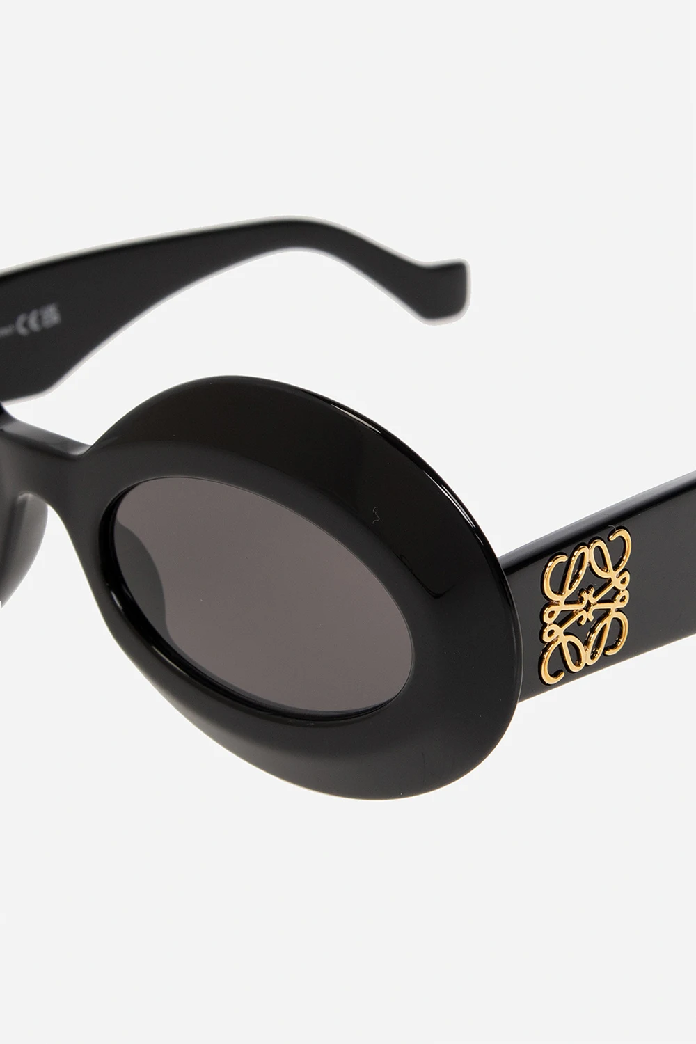 Czarne okulary przeciwsłoneczne Loewe. Dekoracyjne oprawki. Zauszniki ozdobione metalową aplikacją w kształcie logo w kolorze złotym. Szare soczewki ze 100% ochroną przed promieniowaniem UVA/UVB. Dołączone etui.