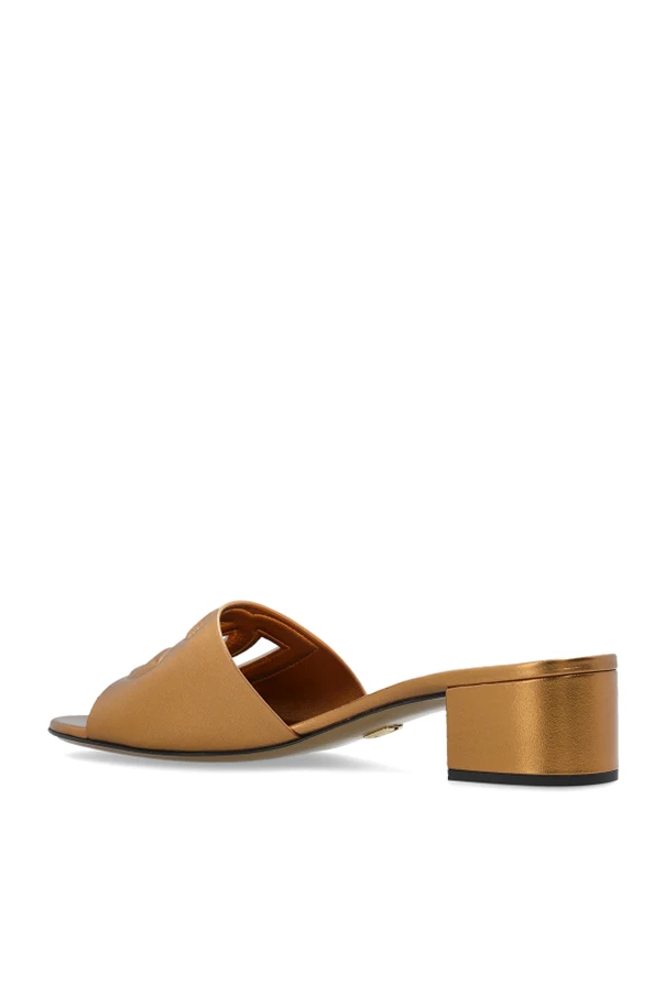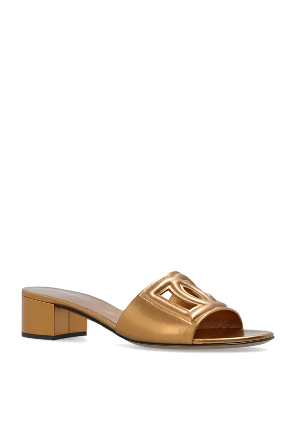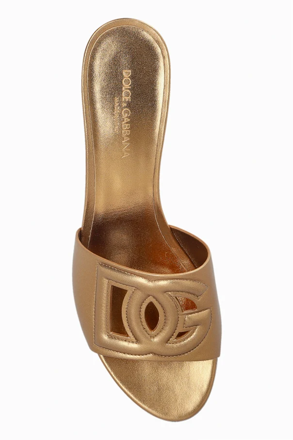 Klapki na obcasie z logo marki Dolce & Gabbana to wyrafinowany manifest nowoczesnej elegancji. Utrzymane w szlachetnym, złotym odcieniu, zachwycają luksusowym wykończeniem oraz subtelnym blaskiem metalizowanej skóry.