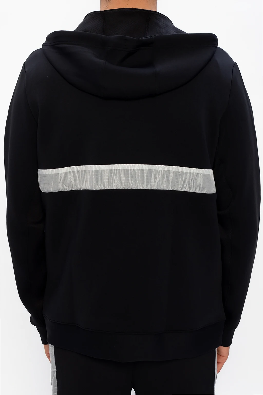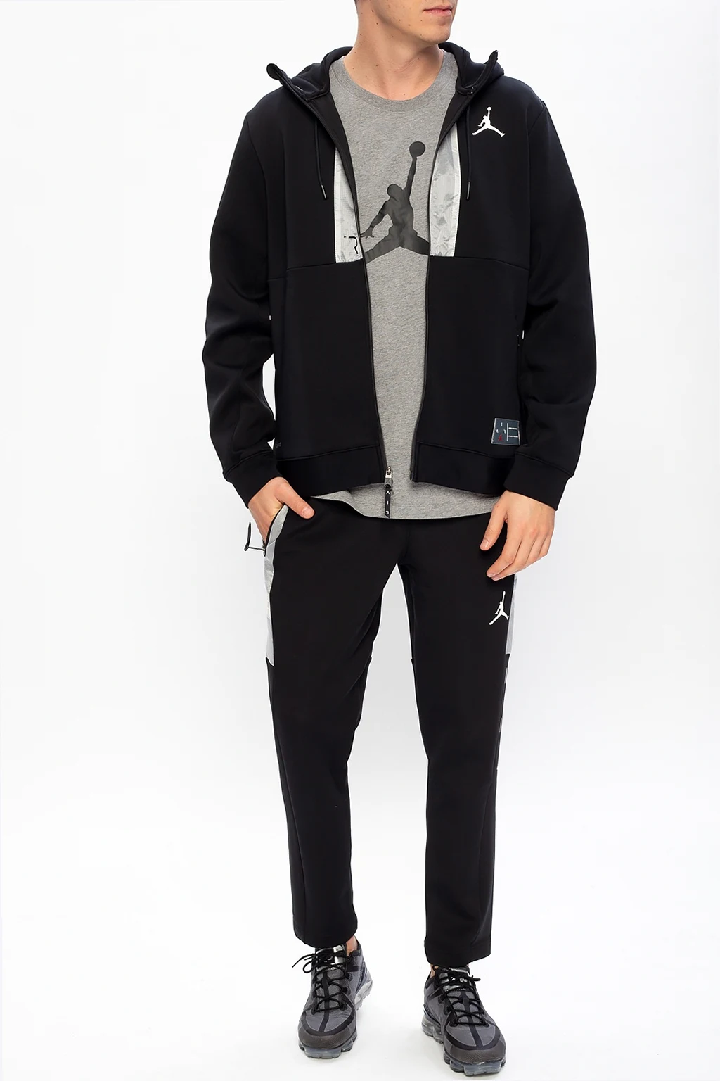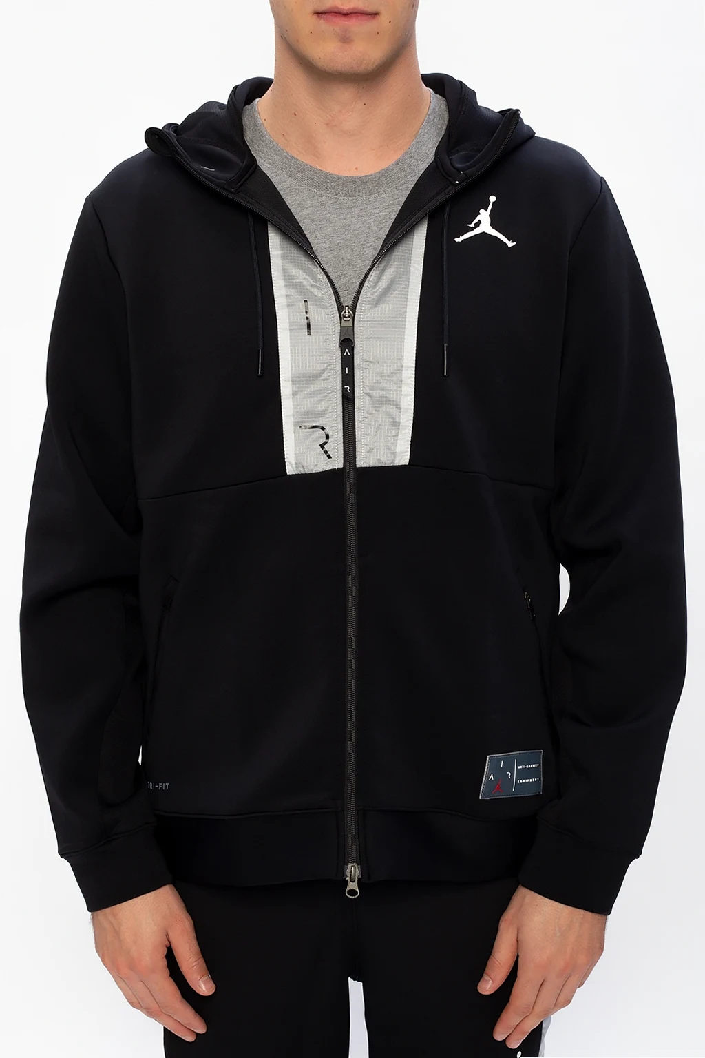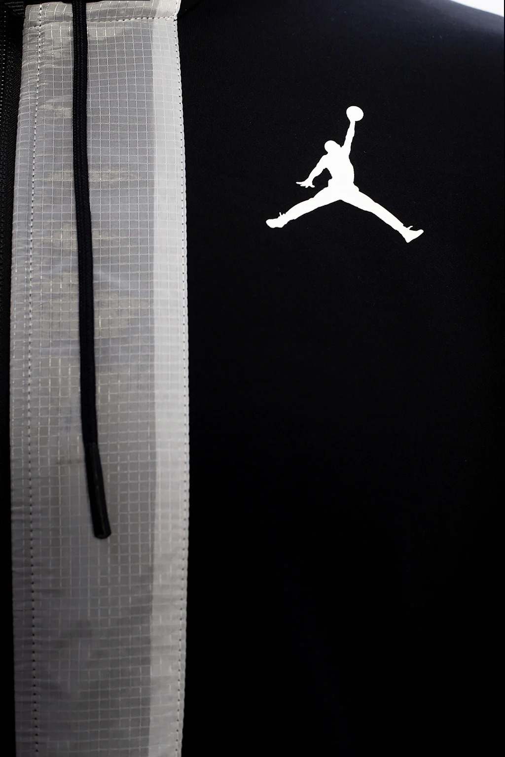 Czarna bluza Nike, linia ‘Air Jordan’. Wykonana z wytrzymałego, elastycznego materiału z technologią odprowadzania wilgoci. Białe, transparentne wstawki z materiału ‘rip-stop’. Zapinana na dwubiegunowy zamek. Kaptur ściągany trokami. Gumowa naszywka z logo. Dwie kieszenie zapinane na zamek. Rękawy zakończone ściągaczami.