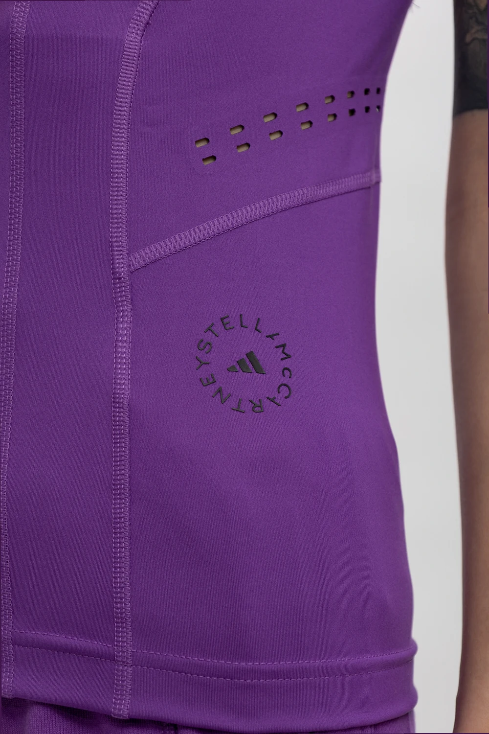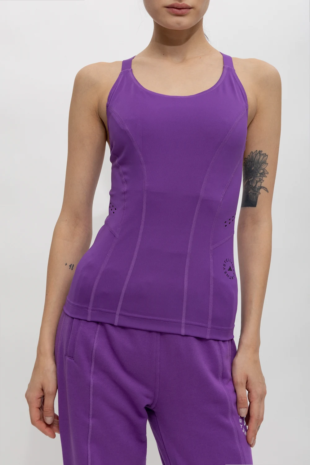 Fioletowy top treningowy bez rękawów ADIDAS by Stella McCartney. Wykonany z Primeblue - materiału z recyklingu, zawierającego Parley Ocean Plastic™. Dopasowany krój w technologii AEROREADY pochłaniającej wilgoć. Z przodu oraz z tyłu nadrukowane czarne logo oraz laserowo wycięte detale podkreślające sylwetkę i zapewniające dodatkową wentylację.