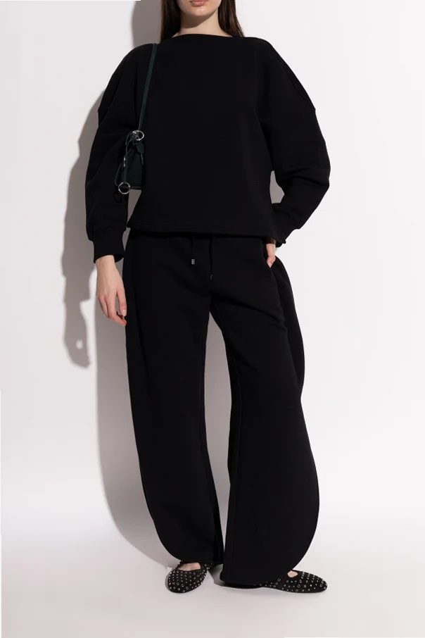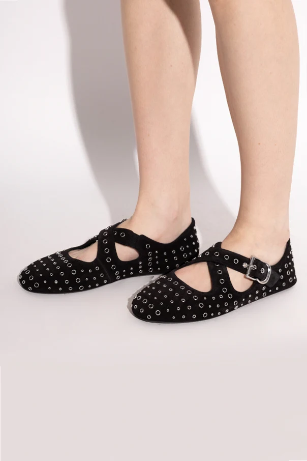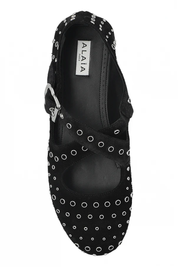 Zamszowe baleriny Criss autorstwa Alaïa to szykowny wybór dla koneserek ponadczasowej elegancji. Wykonane z miękkiego, matowego zamszu w głębokim czarnym odcieniu, ujmują klasyczną linią z zaokrąglonym noskiem oraz płaską, wygodną podeszwą. Wyrafinowany charakter nadaje im pasek zapinany na srebrną klamrę, krzyżujący się w stylu „Mary Jane” oraz efektownie rozmieszczone metalowe oczka, które wprowadzają nowoczesny, modowy akcent. Precyzja wykończenia oraz dyskretnie umieszczone logo projektanta dopełniają całości, czyniąc z balerin wyjątkowy symbol luksusu i nieprzemijającej klasy.