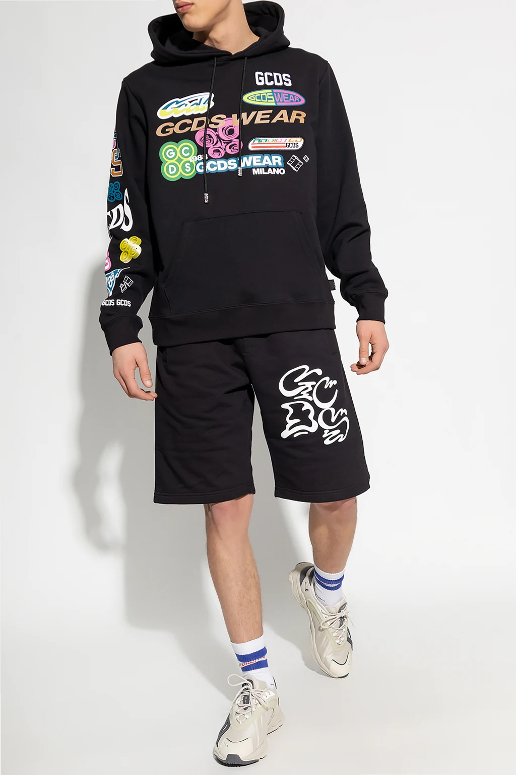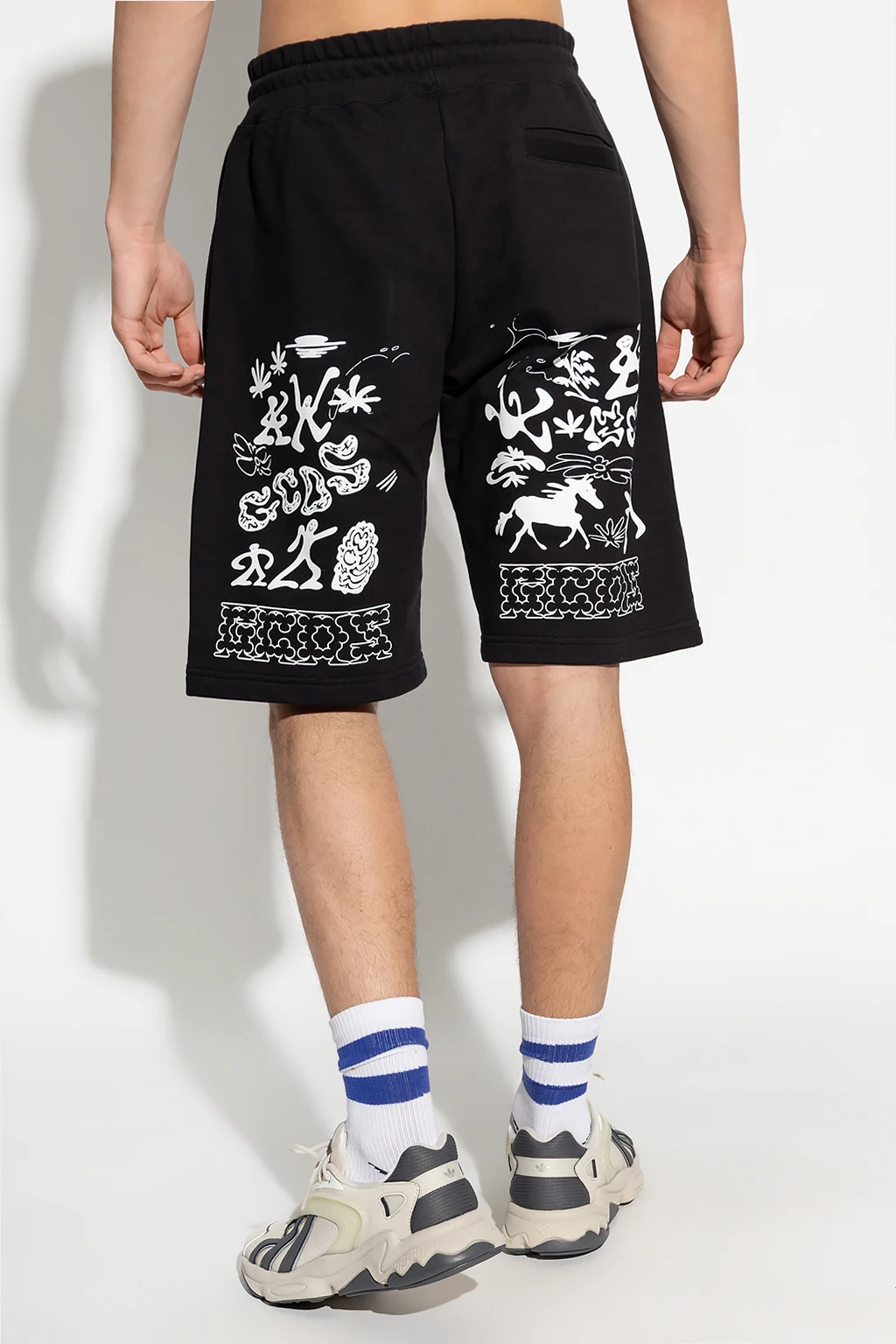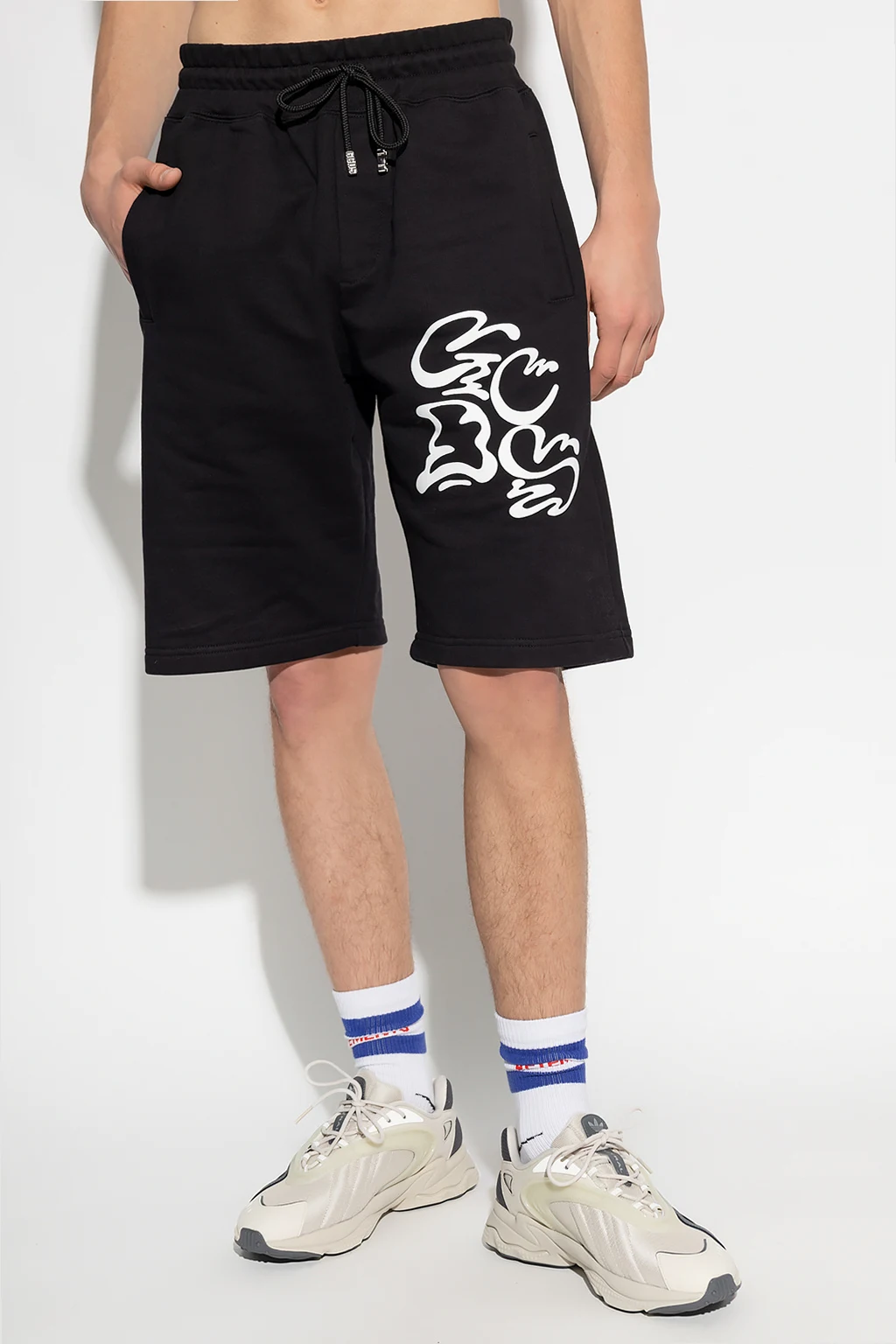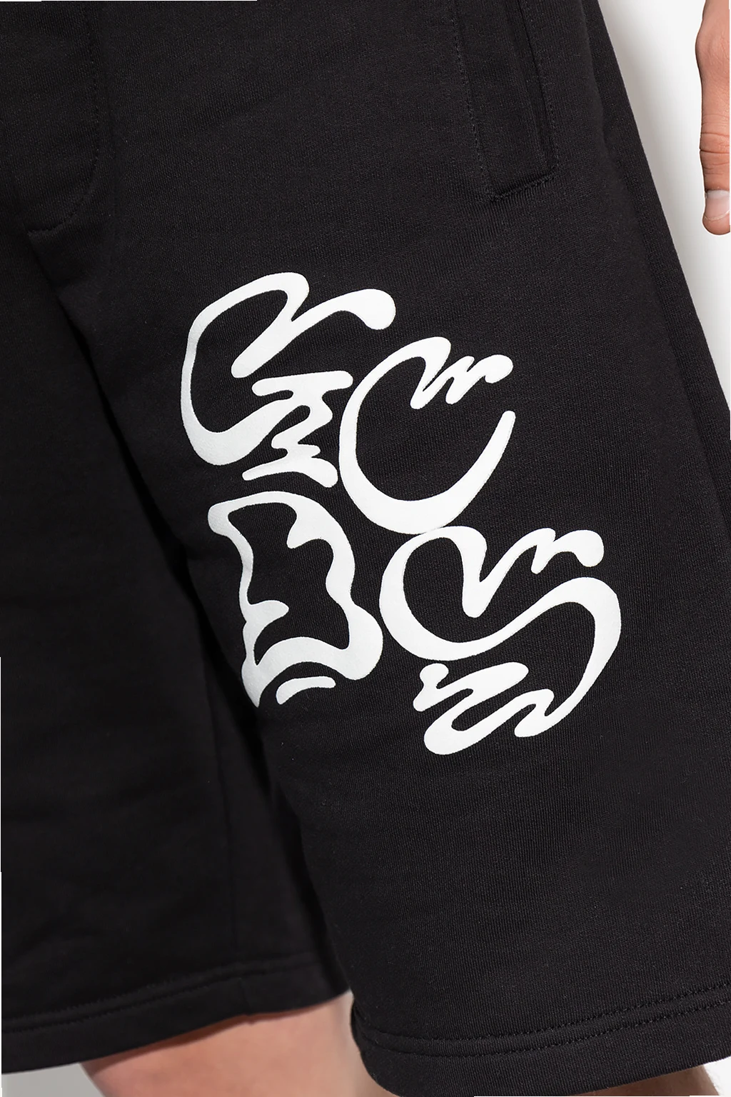 Czarne, bawełniane szorty GCDS. W pasie wszyta guma ściągana trokami. Z przodu nadrukowane logo, z tyłu wzór w kolorze białym. Trzy wsuwane kieszenie: dwie z przodu oraz jedna z tyłu.