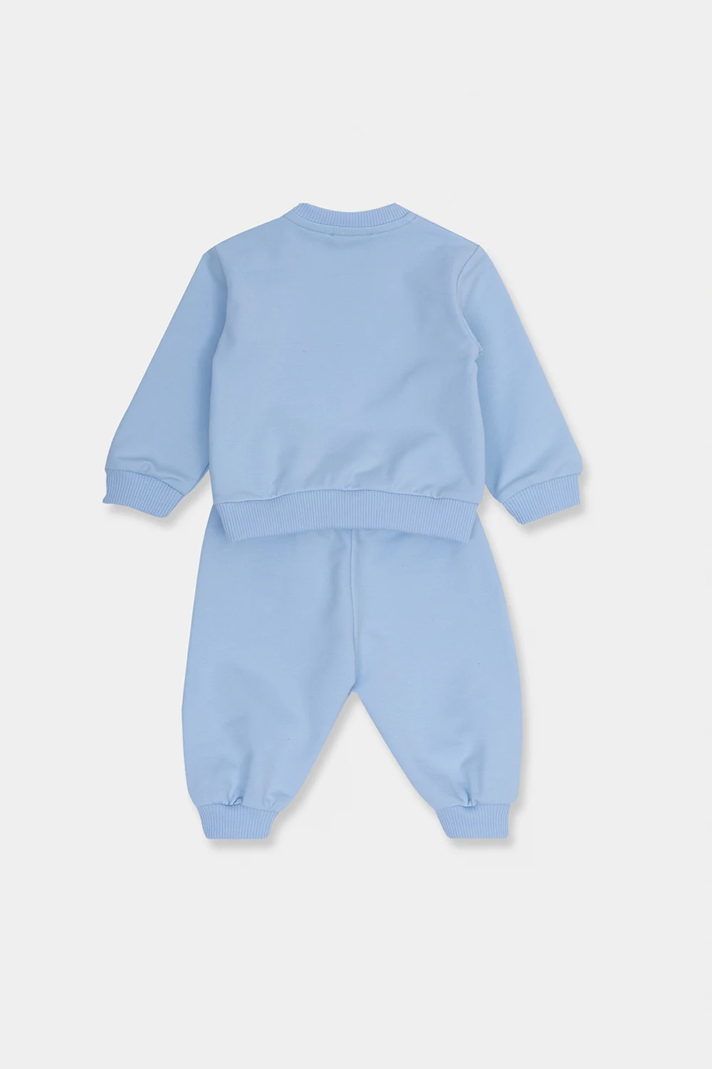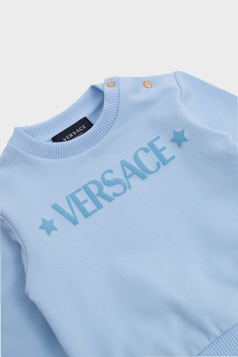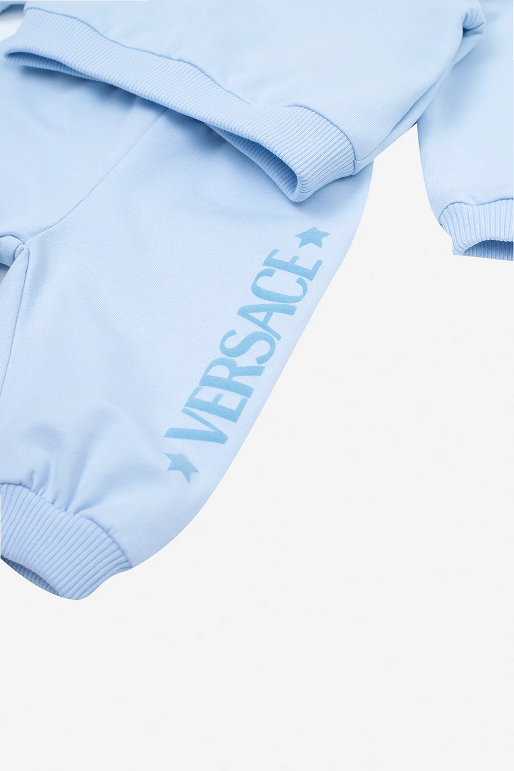 Jasnoniebieski, bawełniany zestaw: bluza i spodnie Versace Kids. Ozdobiony logo. Bluza zapinana na ramieniu na zatrzaski w kolorze złotym. Okrągły dekolt. Długie rękawy i dół bluzy zakończone ściągaczem. Spodnie z gumą w pasie. Nogawki zakończone ściągaczem.
