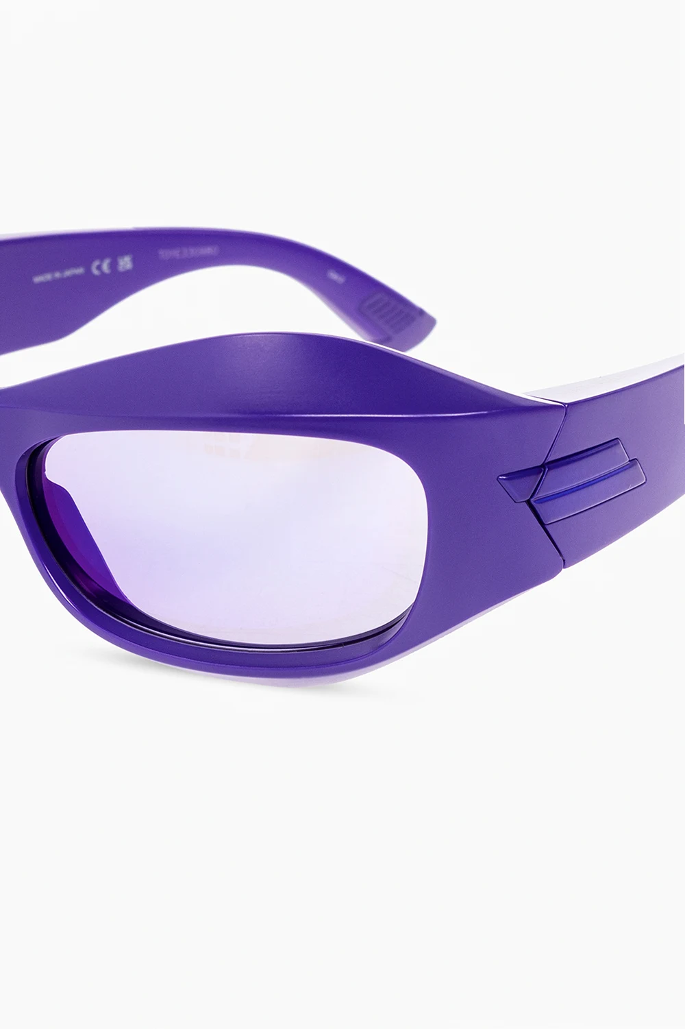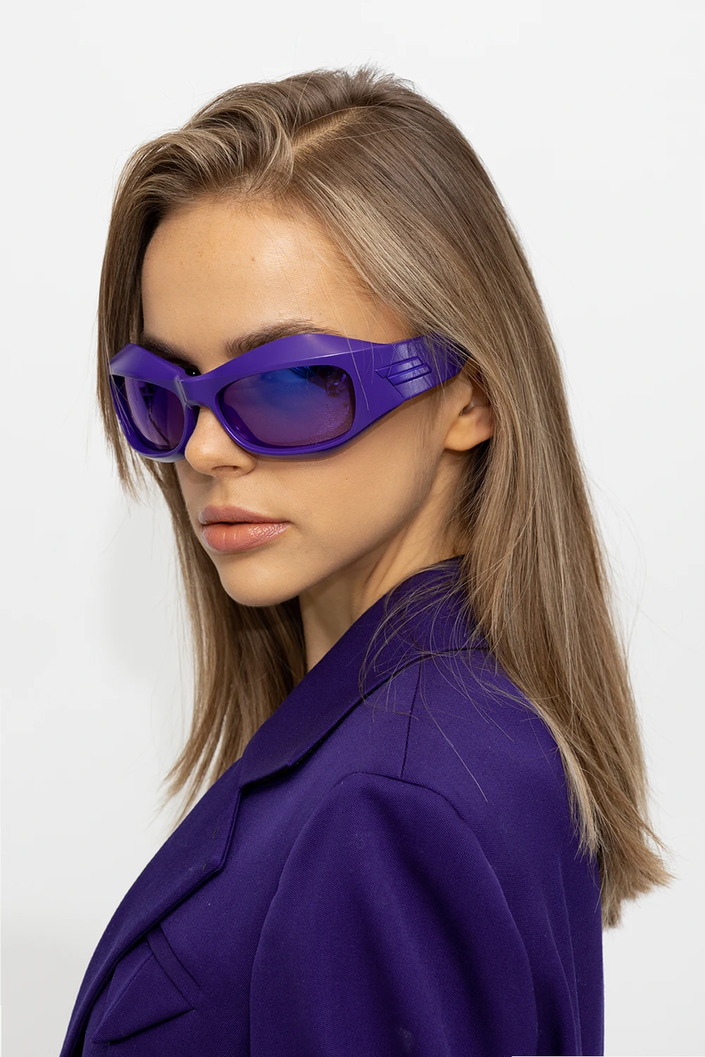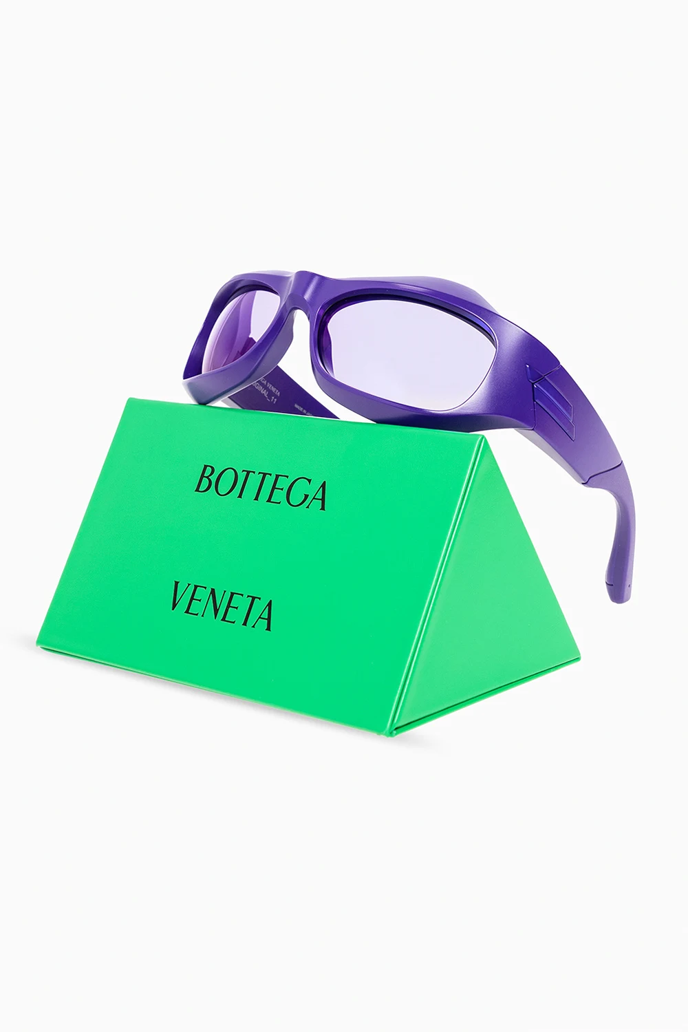 Fioletowe okulary przeciwsłoneczne Bottega Veneta. Zauszniki z gumowym wykończeniem, ozdobione charakterystyczną aplikacją. Jasnofioletowe szkła ze 100% ochroną przed promieniowaniem UV. Dołączone etui.