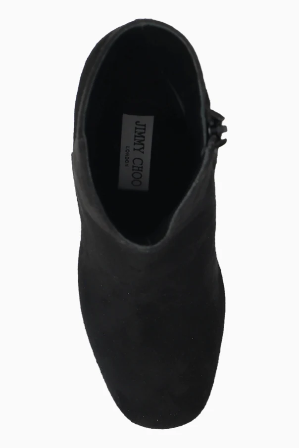 Cholewka tych ekskluzywnych botków wykonana jest z czarnej, luksusowej skóry z zamszowym wykończeniem , co nadaje im niezwykle szlachetny wygląd oraz aksamitną strukturę. Precyzyjne wykończenie i wykorzystanie najwyższej jakości materiałów – zarówno na zewnątrz, jak i wewnątrz – świadczy o niepowtarzalnym charakterze produktu zaprojektowanego przez Jimmy Choo .