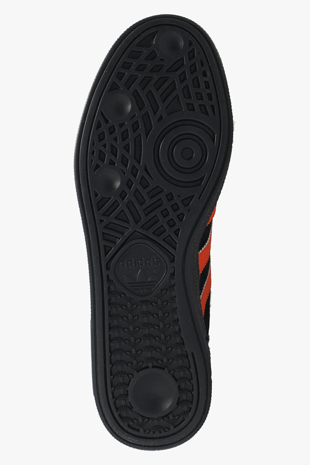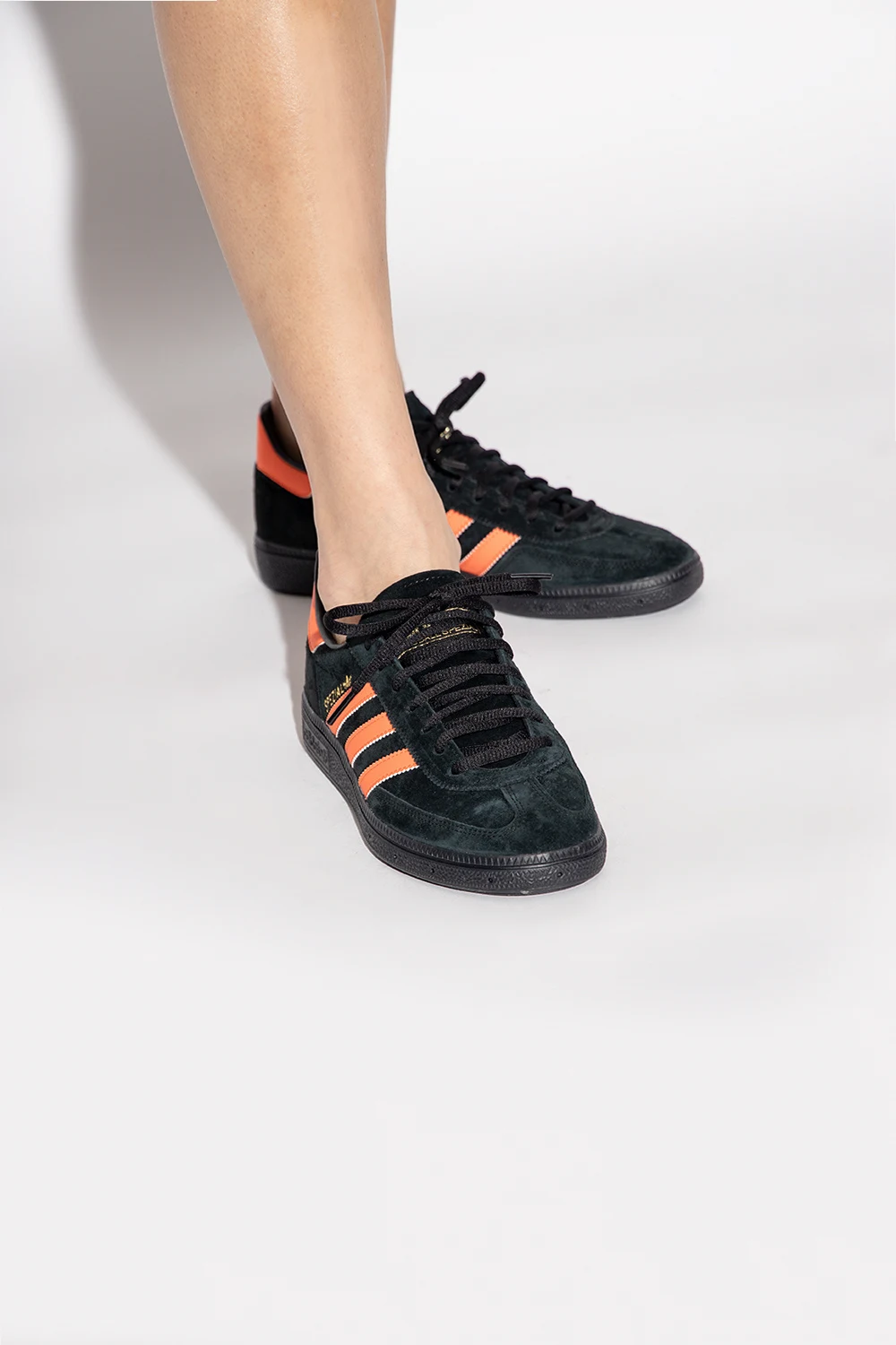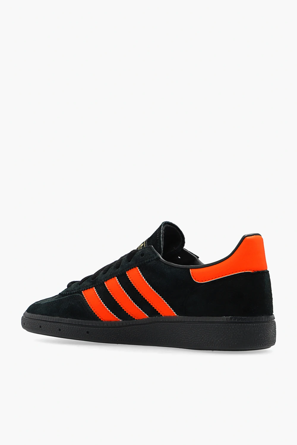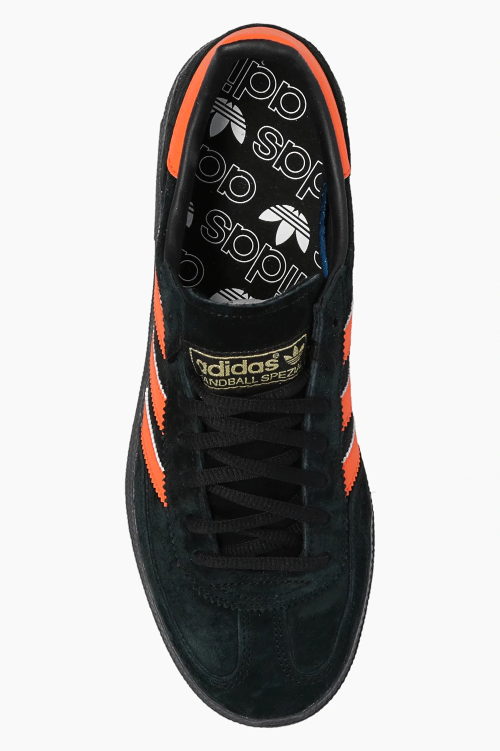 Czarno-pomarańczowe, sznurowane buty sportowe, model ‘Handball Spezial’ ADIDAS Originals. Wykonane ze skóry i wykończone gumą. Ozdobione charakterystycznymi trzema pasami na cholewce oraz aplikacją z logo na języku. Czarna, gumowa podeszwa.