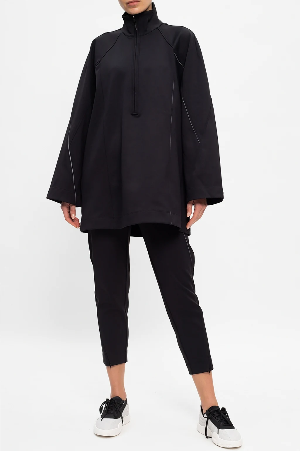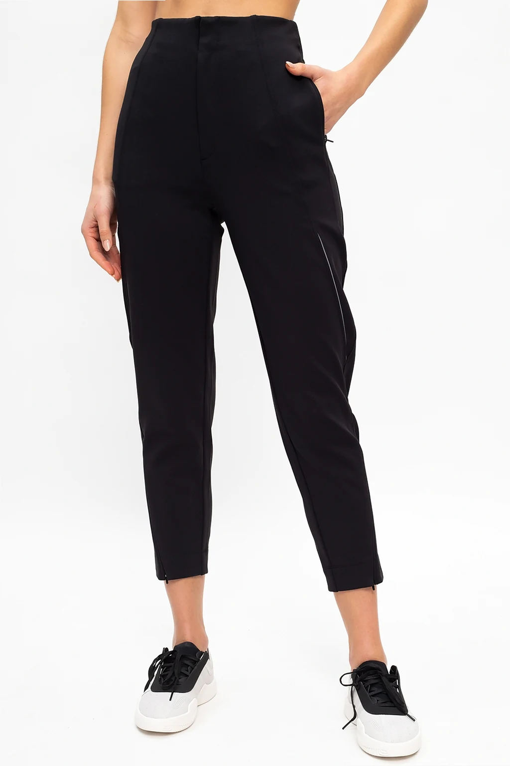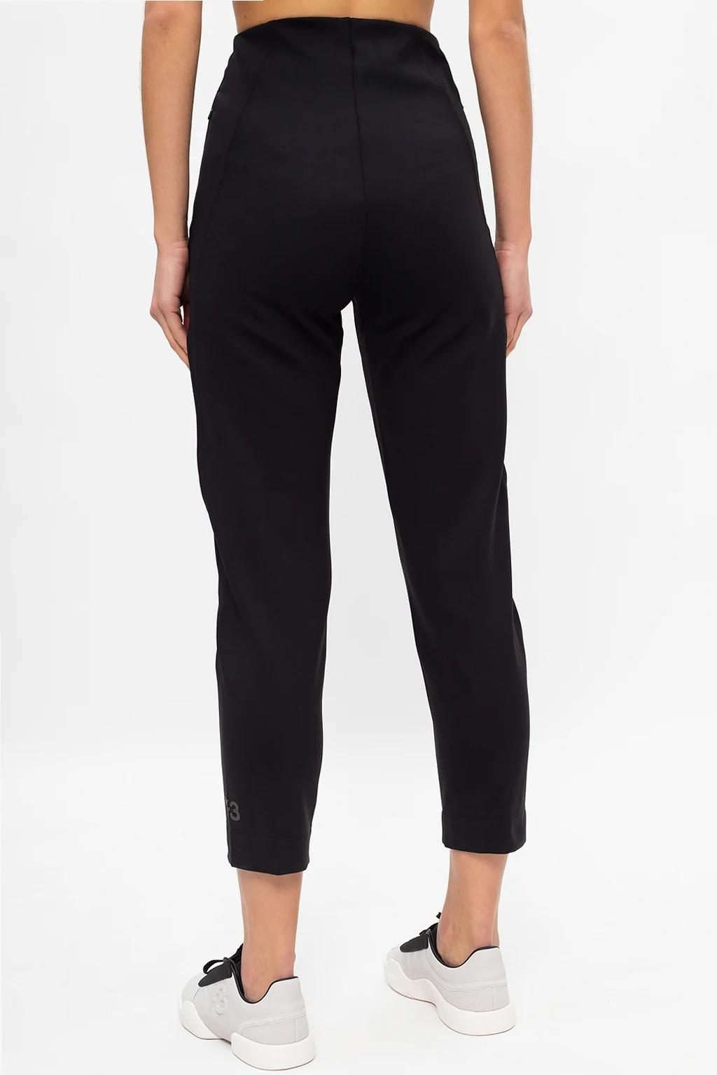 Czarne spodnie Y-3 Yohji Yamamoto. Zapinane na zamek oraz haftki. U dołu nadrukowane logo w kolorze srebrnym z efektem odblaskowym. Dwie kieszenie zapinane na zamki. Wysoki stan. Zwężane nogawki z zamkami u dołu.