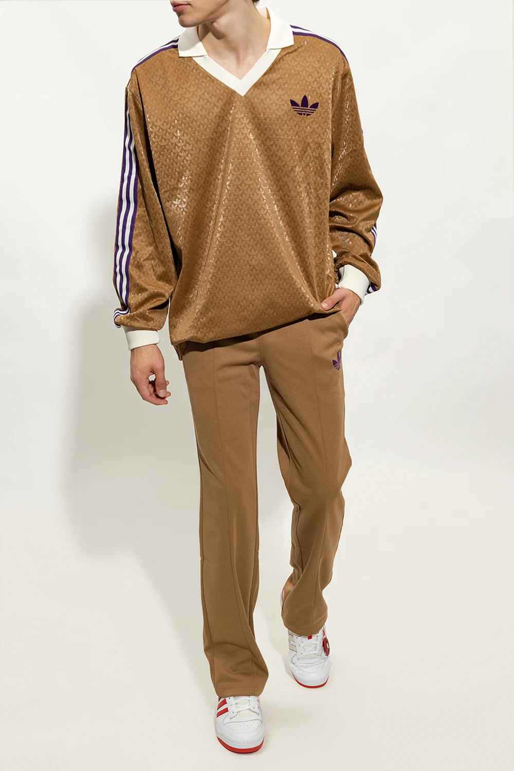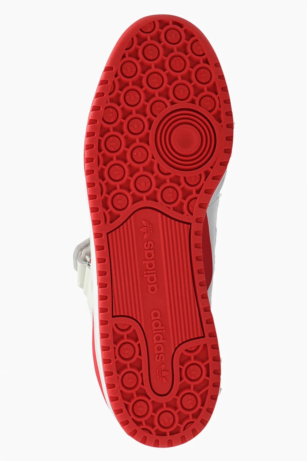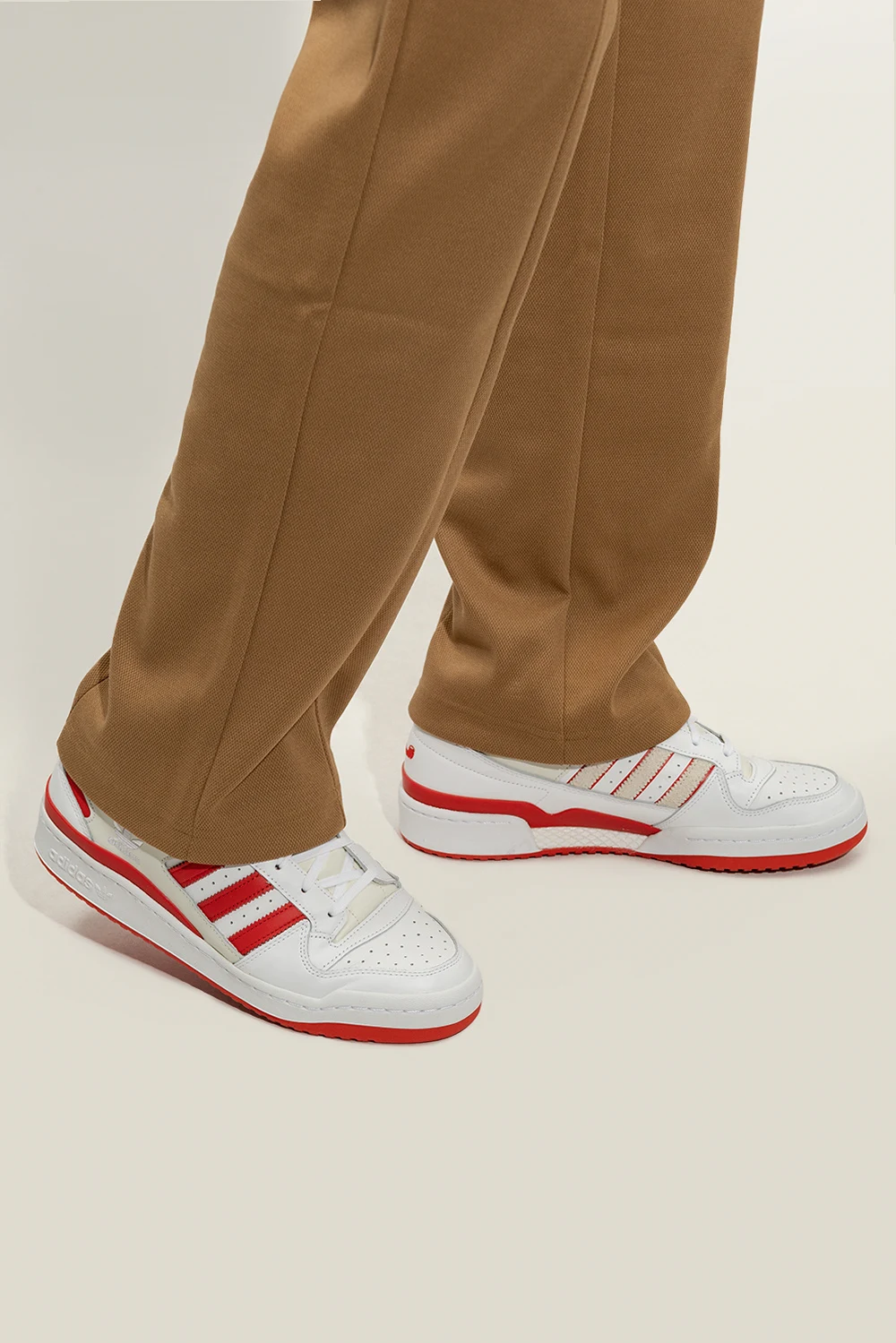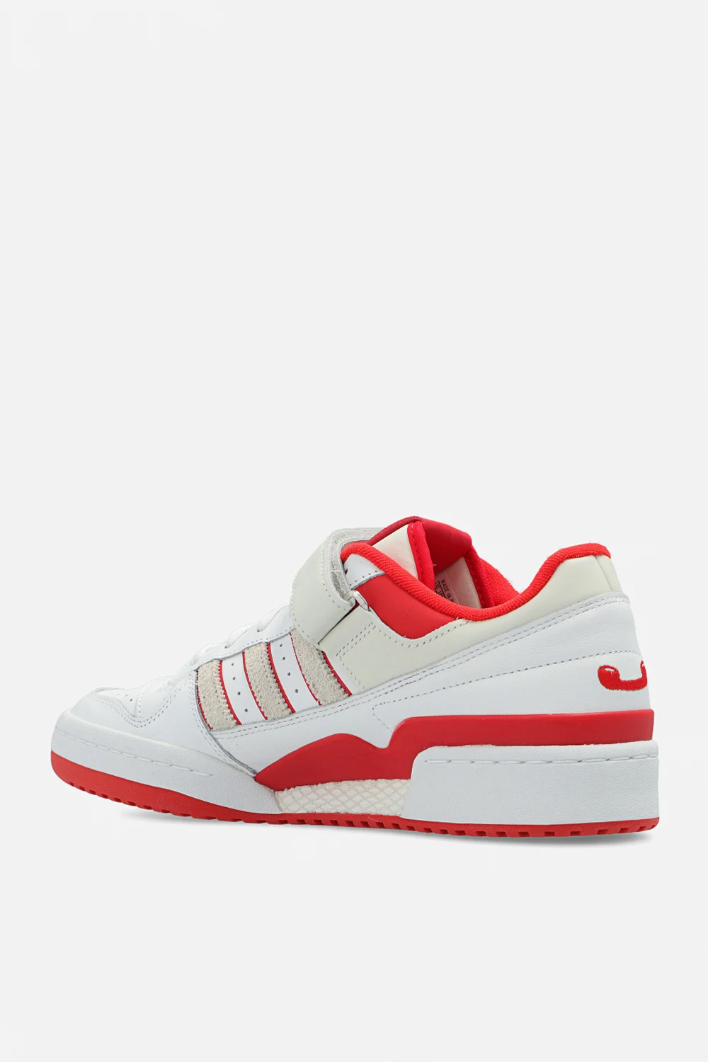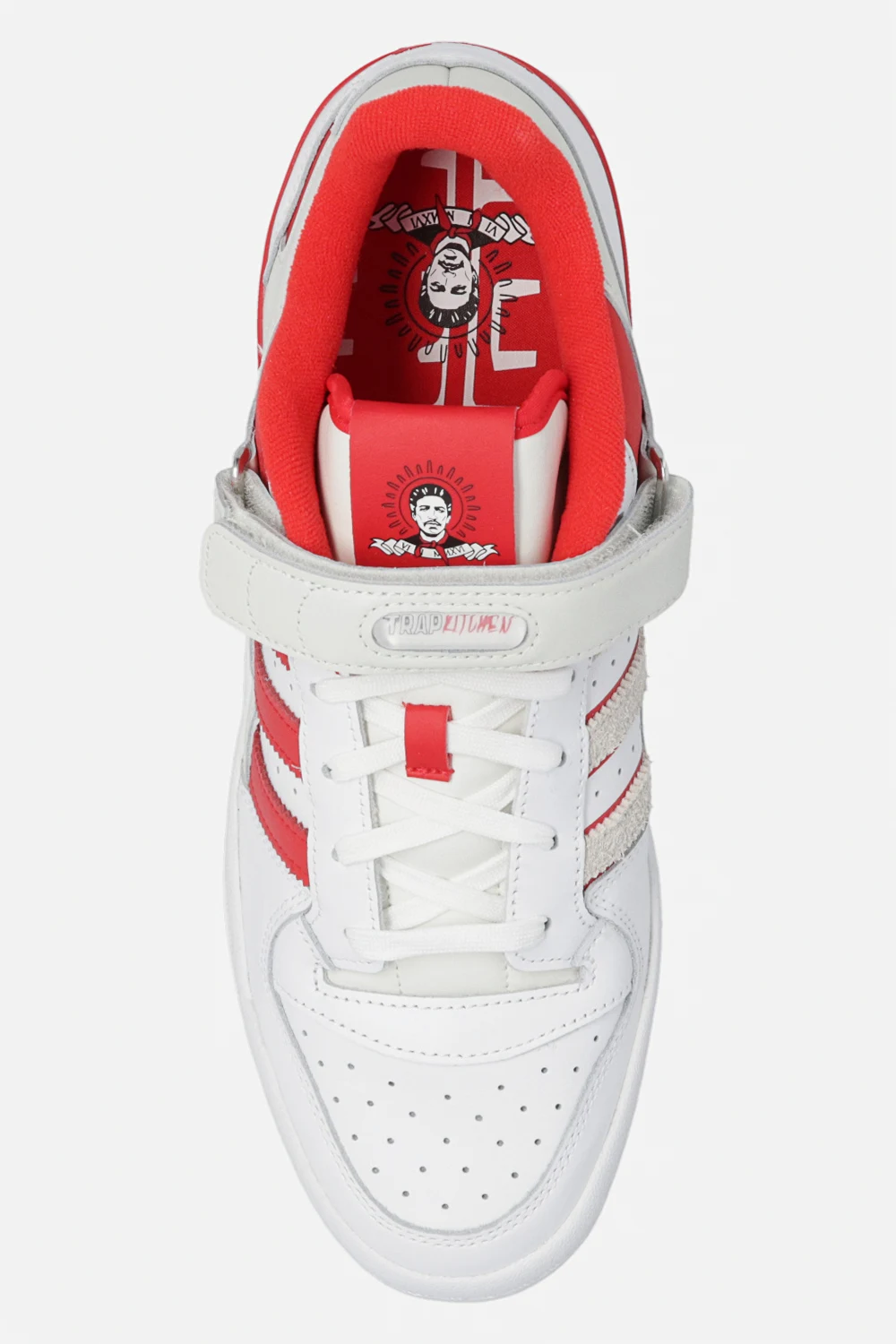 Biało-kremowo-czerwone, sznurowane buty sportowe, model ‘Forum Low’ ADIDAS Originals x Trap Kitchen. Wykonane ze skóry. Zapinane na rzep z logo na przodzie- w opakowaniu dołączone dwa wymienne. Perforowany przód i boki. Profil ozdobiony trzema charakterystycznymi dla marki paskami i wyszytym logo ‘Trefoil’. Na języku oraz z tyłu logo Trap Kitchen. Biało-czerwona, gumowa podeszwa. Dołączone dodatkowe sznurowadła oraz brelok upamiętniający współpracę.
