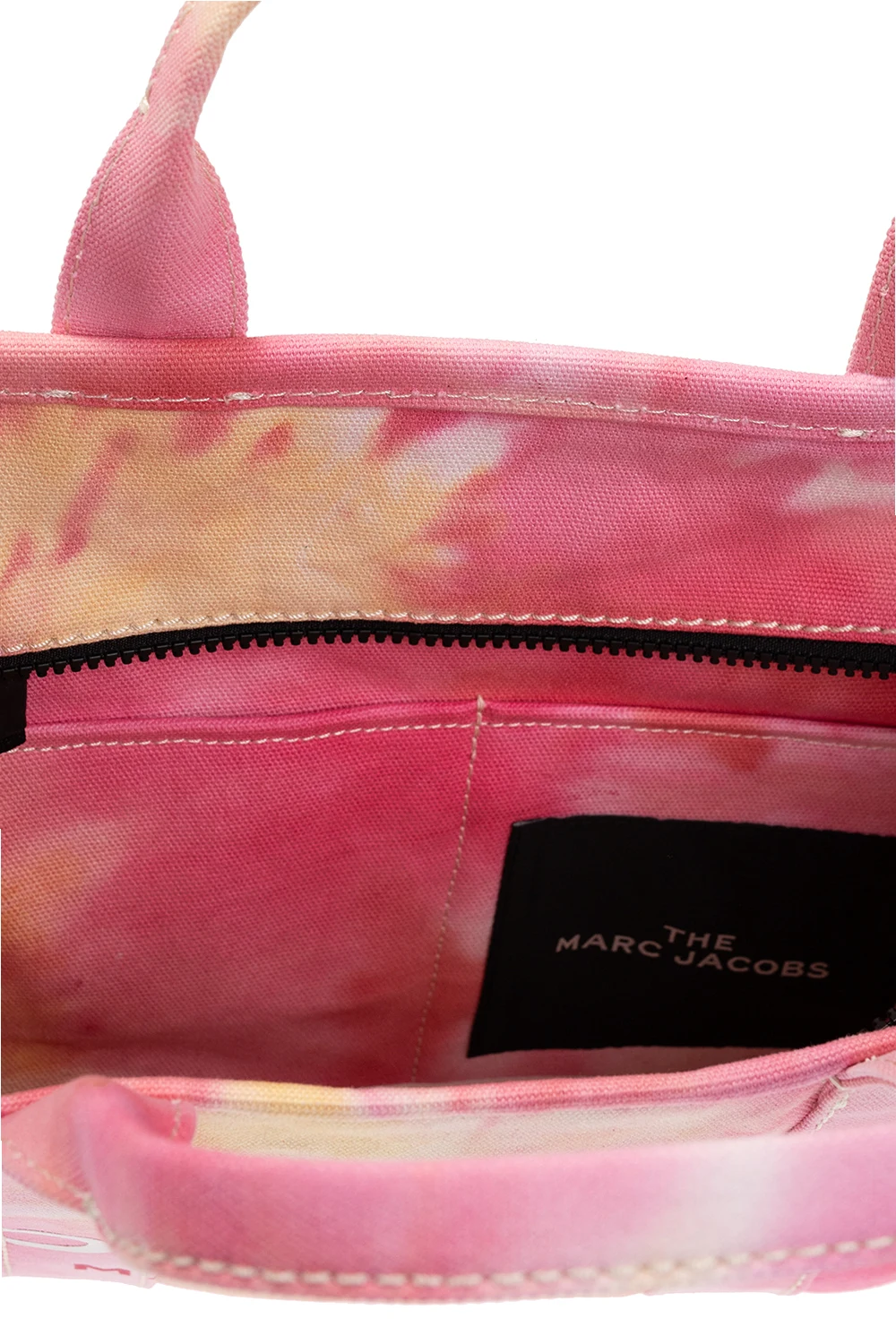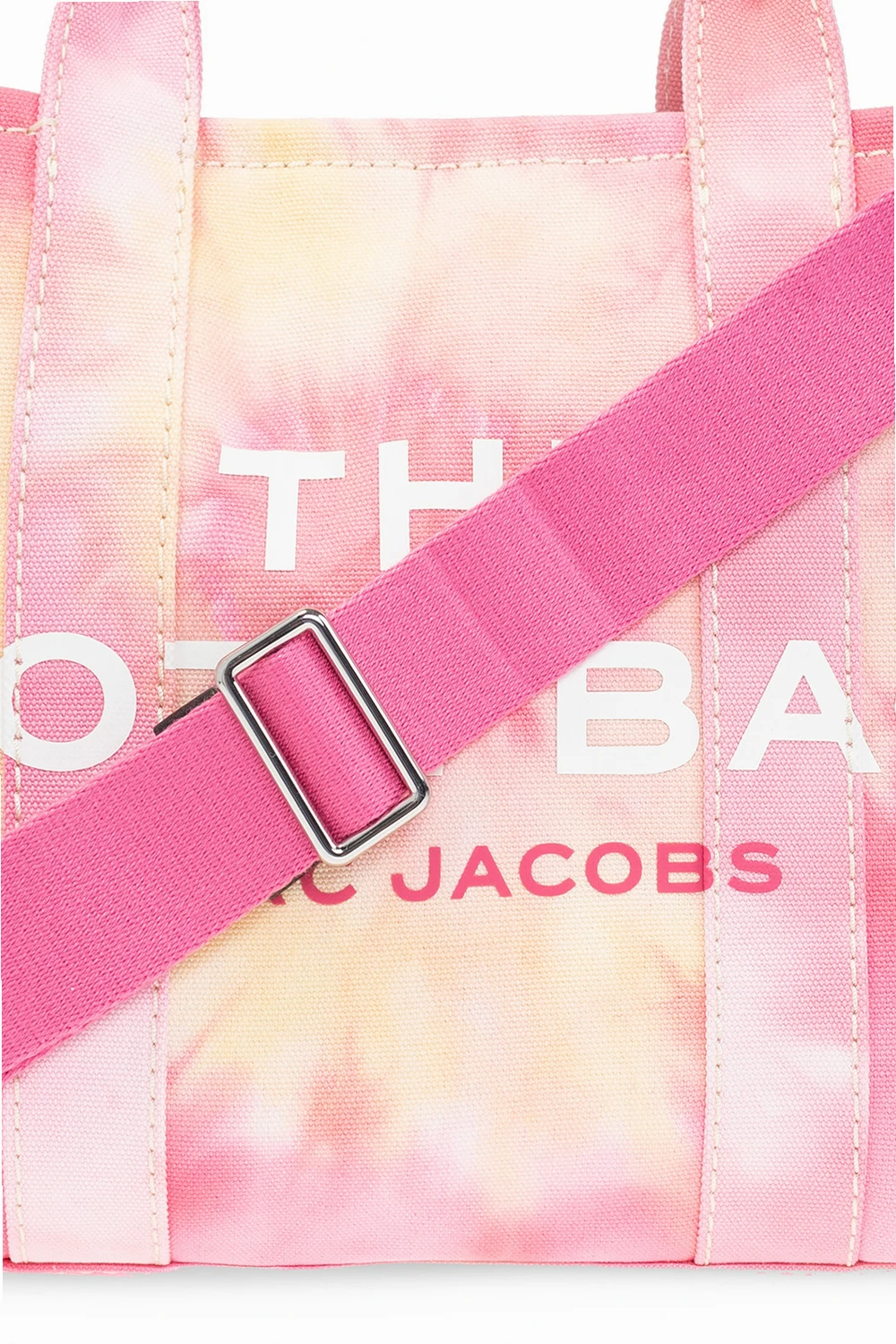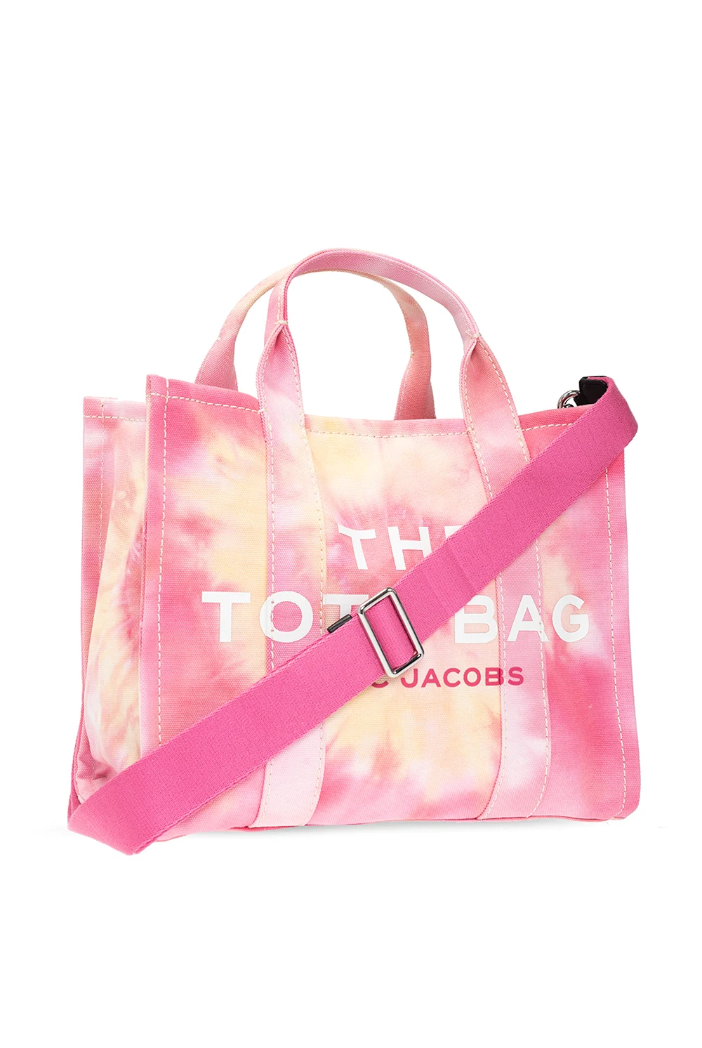 Różowa torba na ramię, model ‘The Medium Tote’ Marc Jacobs (The). Wykonana z bawełny. Ozdobiona białym logo oraz naszywką w kolorze czarno-białym. Dwie półokrągłe rączki. Pas na ramię z możliwością regulacji długości. Wewnątrz komora oraz dwie wsuwane kieszenie. Metalowe wykończenie w kolorze srebrnym.