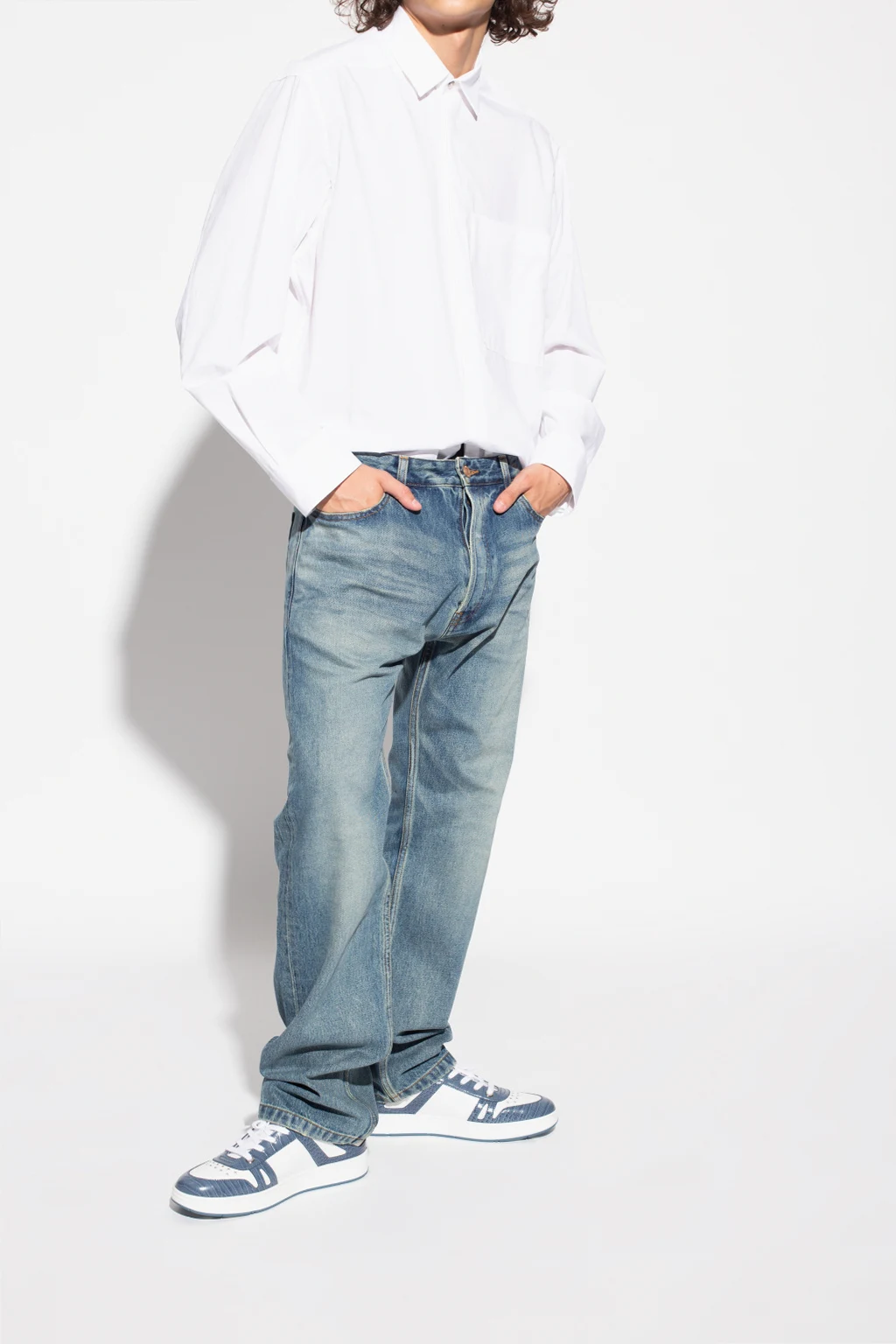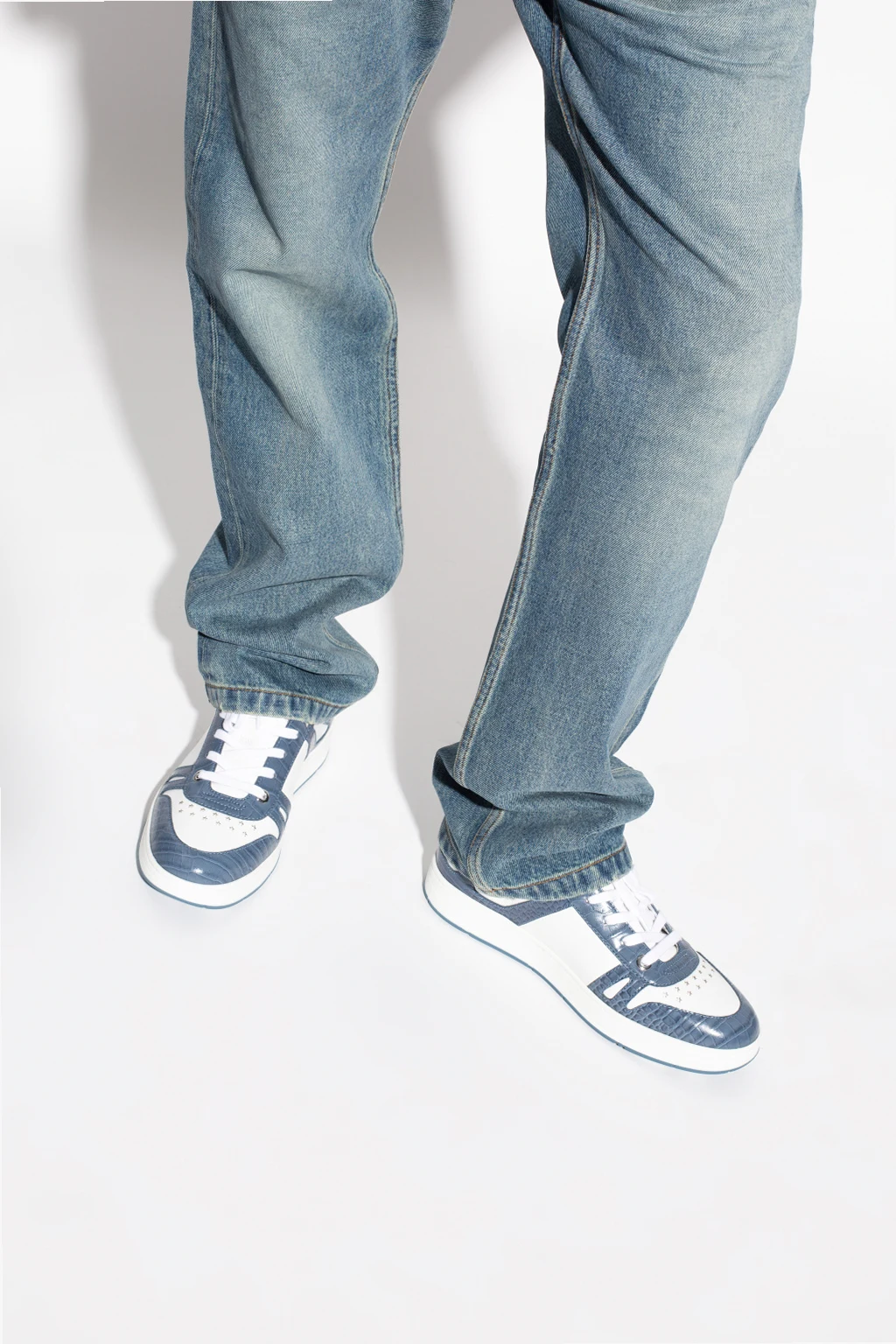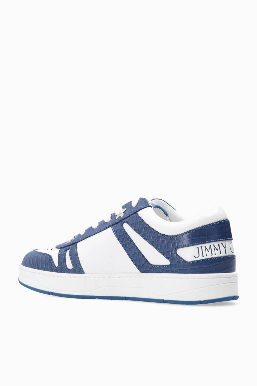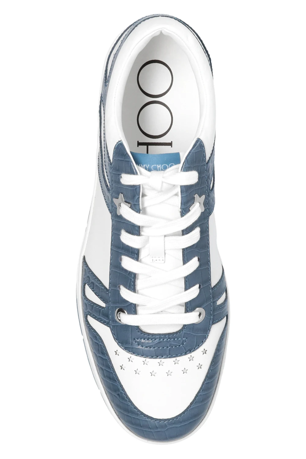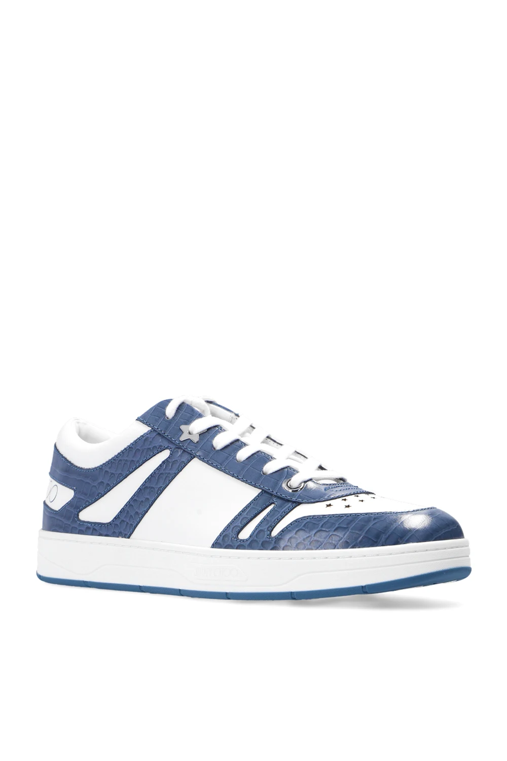 Biało-niebieskie, sznurowane buty sportowe, model ‘Hawaii’ Jimmy Choo. Wykonane ze skóry. Ozdobione wyszytym i wytłoczonym logo. Z przodu dekoracyjna perforacja w kształcie gwiazd. Niebiesko-biała, gumowa podeszwa. Metalowe aplikacje w kolorze srebrnym. Wymienne sznurówki w kolorze niebieskim.