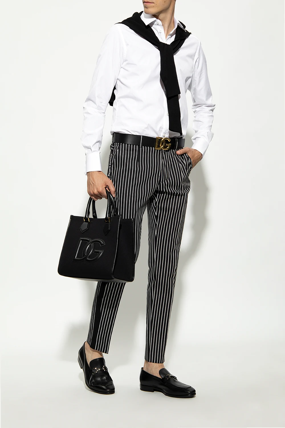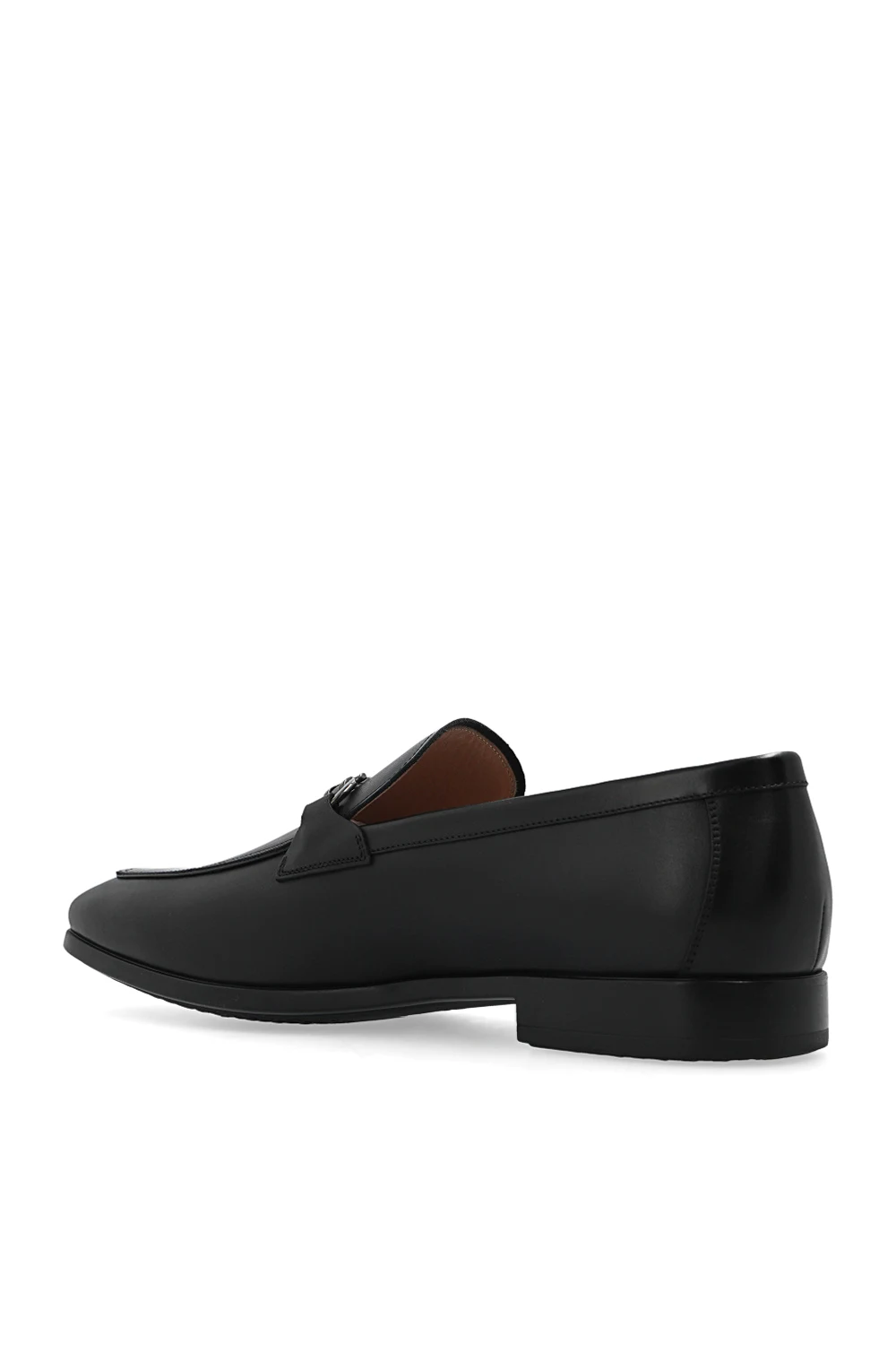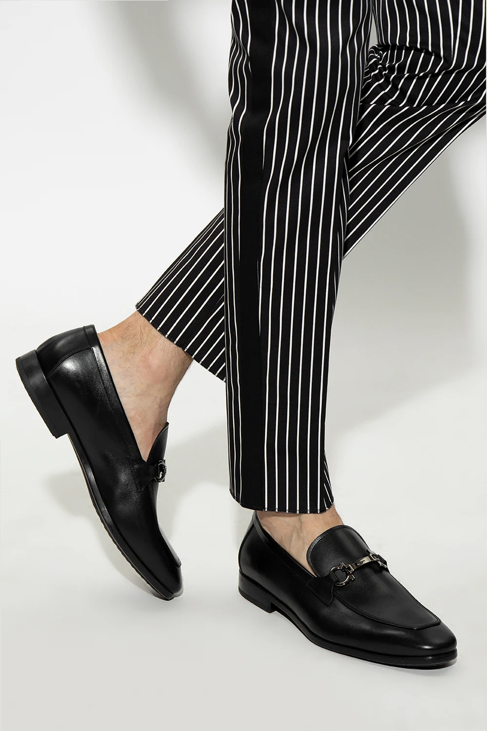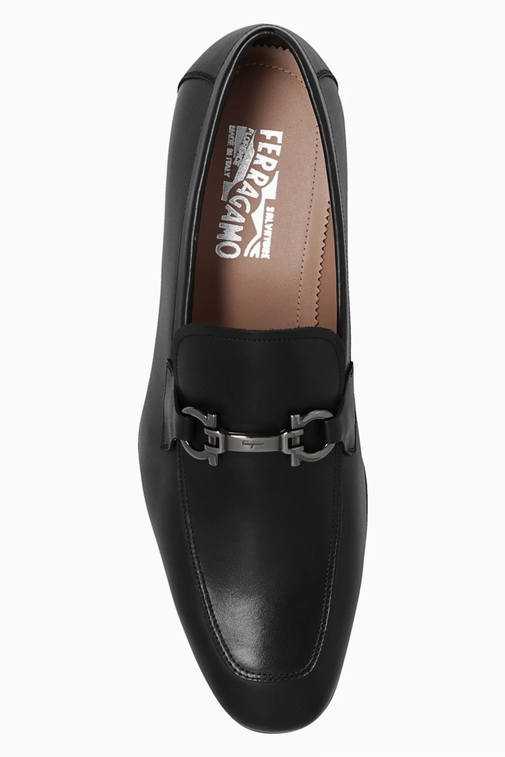 Czarne mokasyny, model ‘Ree’ Salvatore Ferragamo. Wykonane z cielęcej skóry. Dekoracyjne przeszycia. Z przodu charakterystyczna klamra ‘Gancini’. Czarna, gumowa podeszwa.