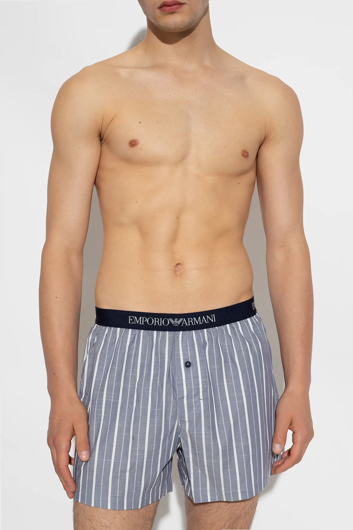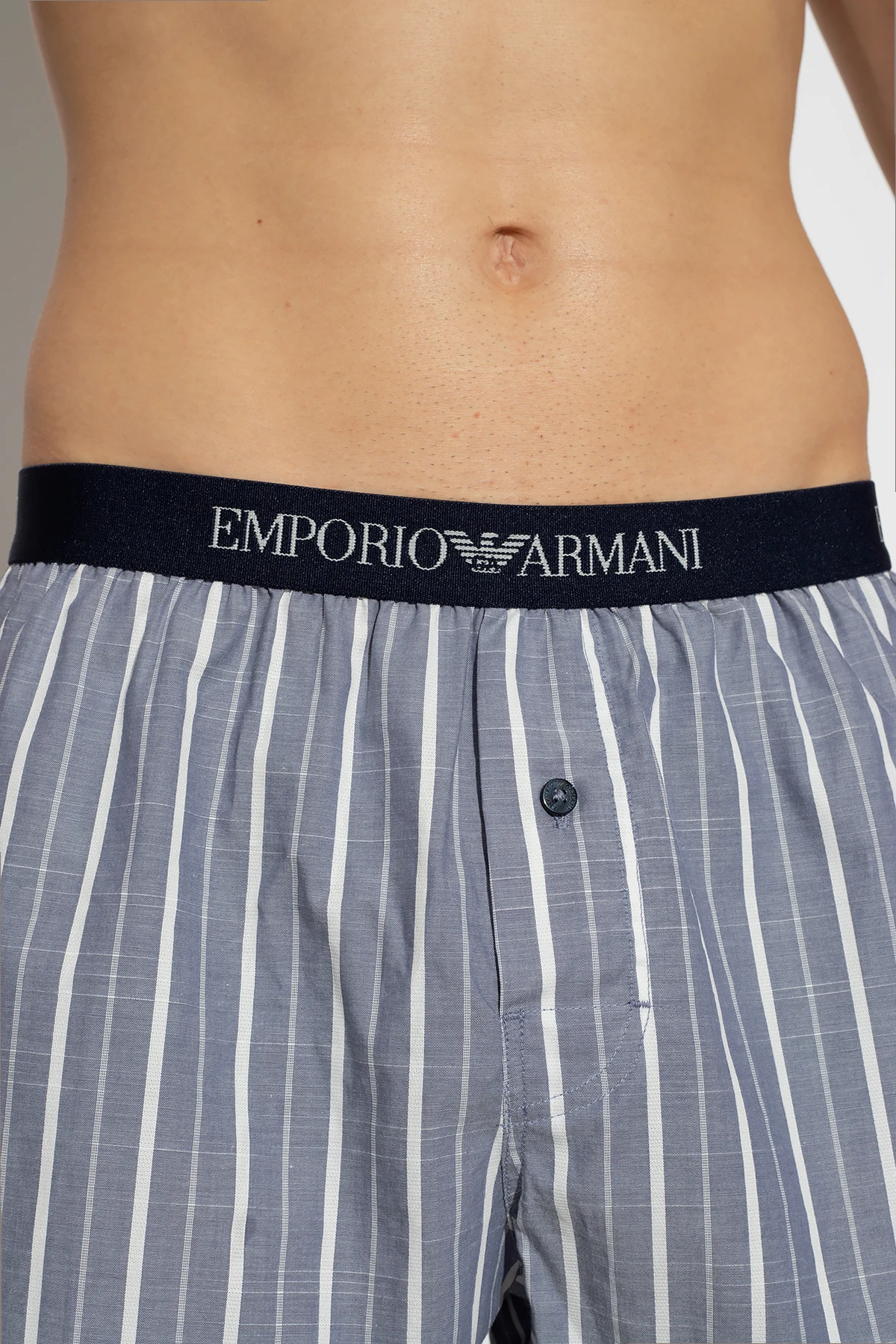 Szaro-białe, bawełniane bokserki Emporio Armani. W pasie wszyta guma z wyszytym białym logo. Ozdobione wzorem w pasy.
