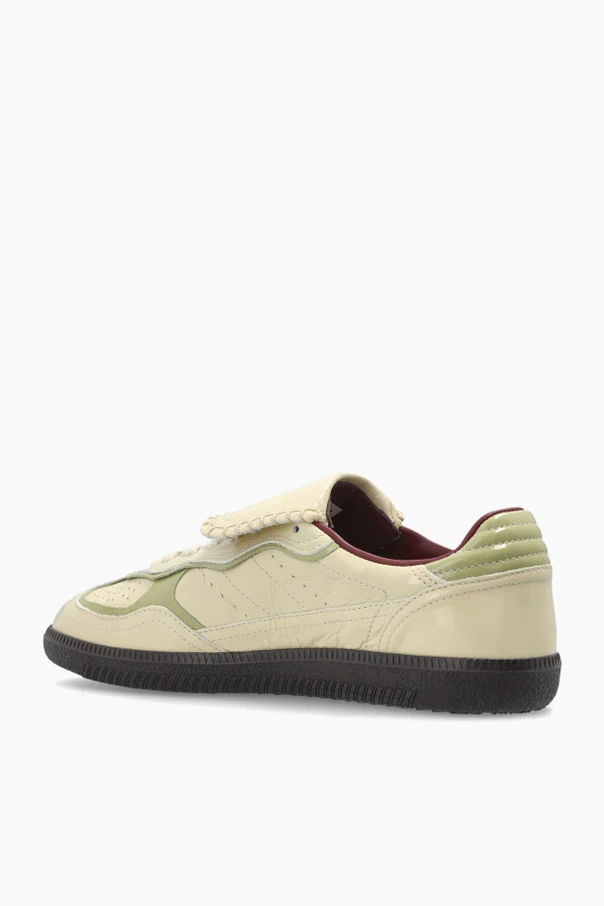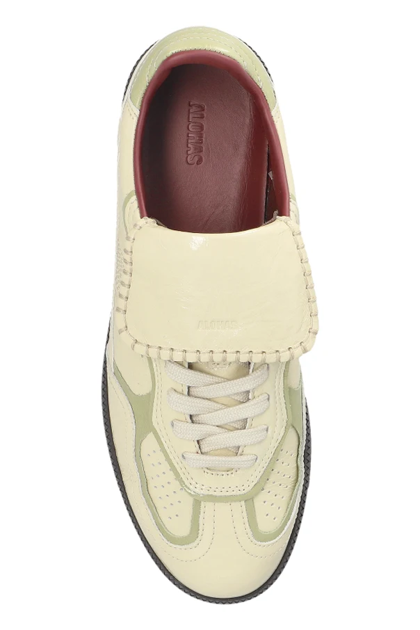 Buty sportowe Tb.490 to kwintesencja wyrafinowanego stylu w codziennym wydaniu. Oferują niski profil z elegancką, smukłą linią oraz lekko zaokrąglonym czubkiem, co doskonale podkreśla nowoczesną sylwetkę obuwia. Zewnętrzna warstwa z delikatnie połyskującej, kremowej skóry licowej emanuje luksusem, a subtelne wstawki w jasnozielonym odcieniu harmonijnie współgrają z całością projektu. Bordowe wnętrze zapewnia niepowtarzalny kontrast i prestiż.
