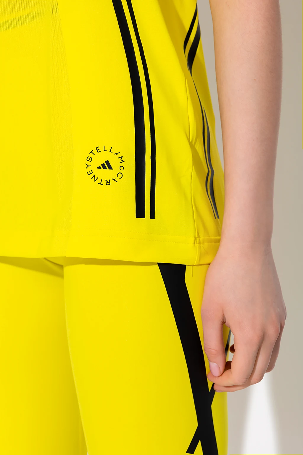 Żółty top treningowy bez rękawów ADIDAS by Stella McCartney. Wykonany z materiału pochodzącego z recyklingu. Ozdobiony nadrukiem i logo w kolorze czarnym. Wykończony lekko transparentną siatką. Okrągły dekolt.