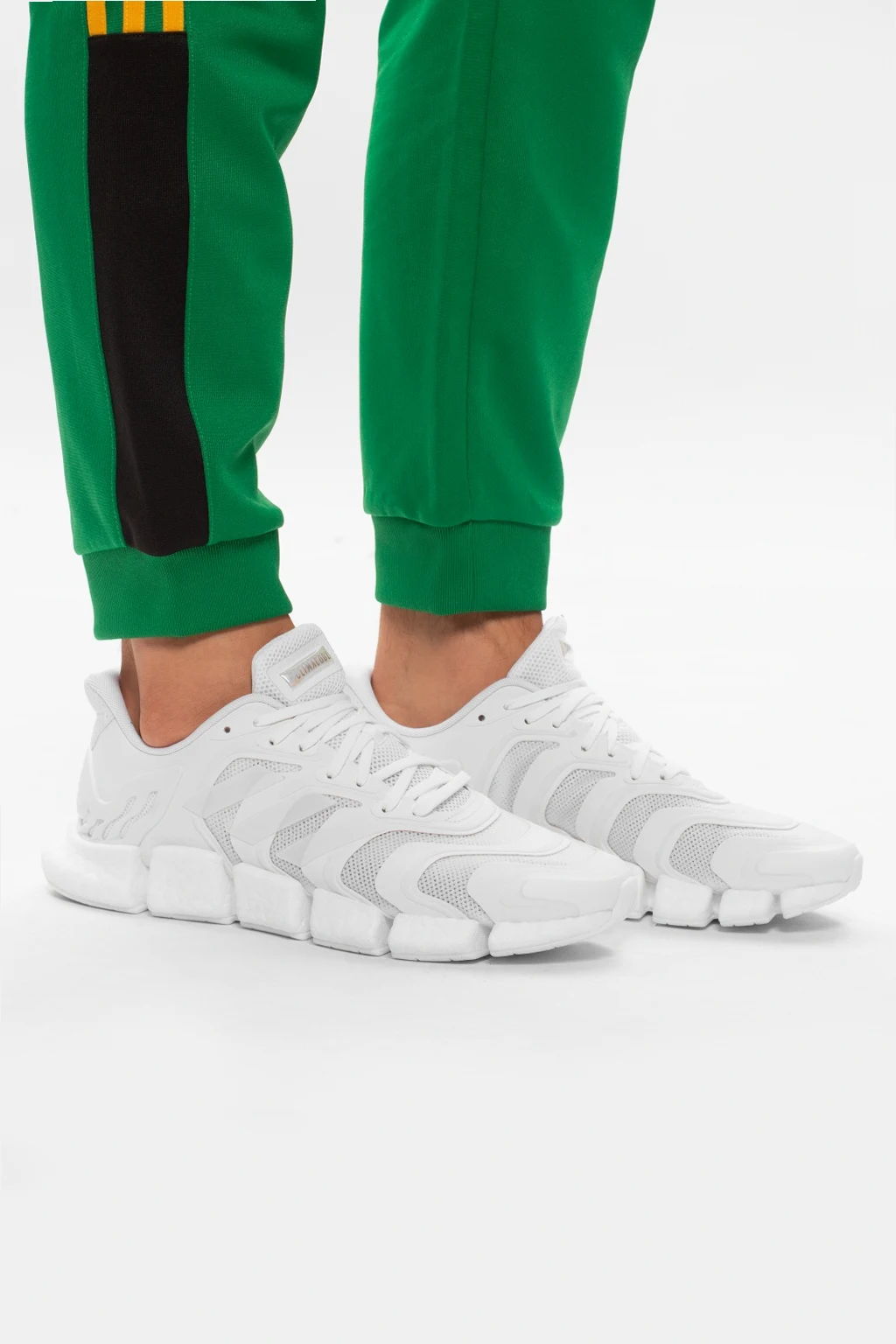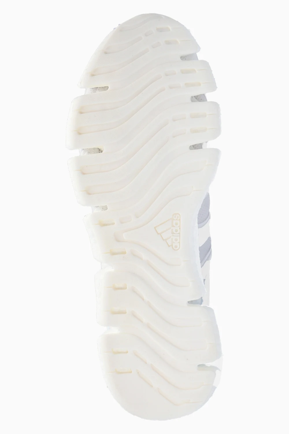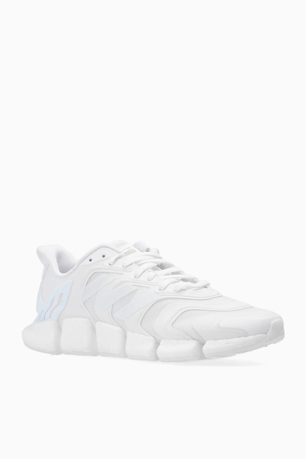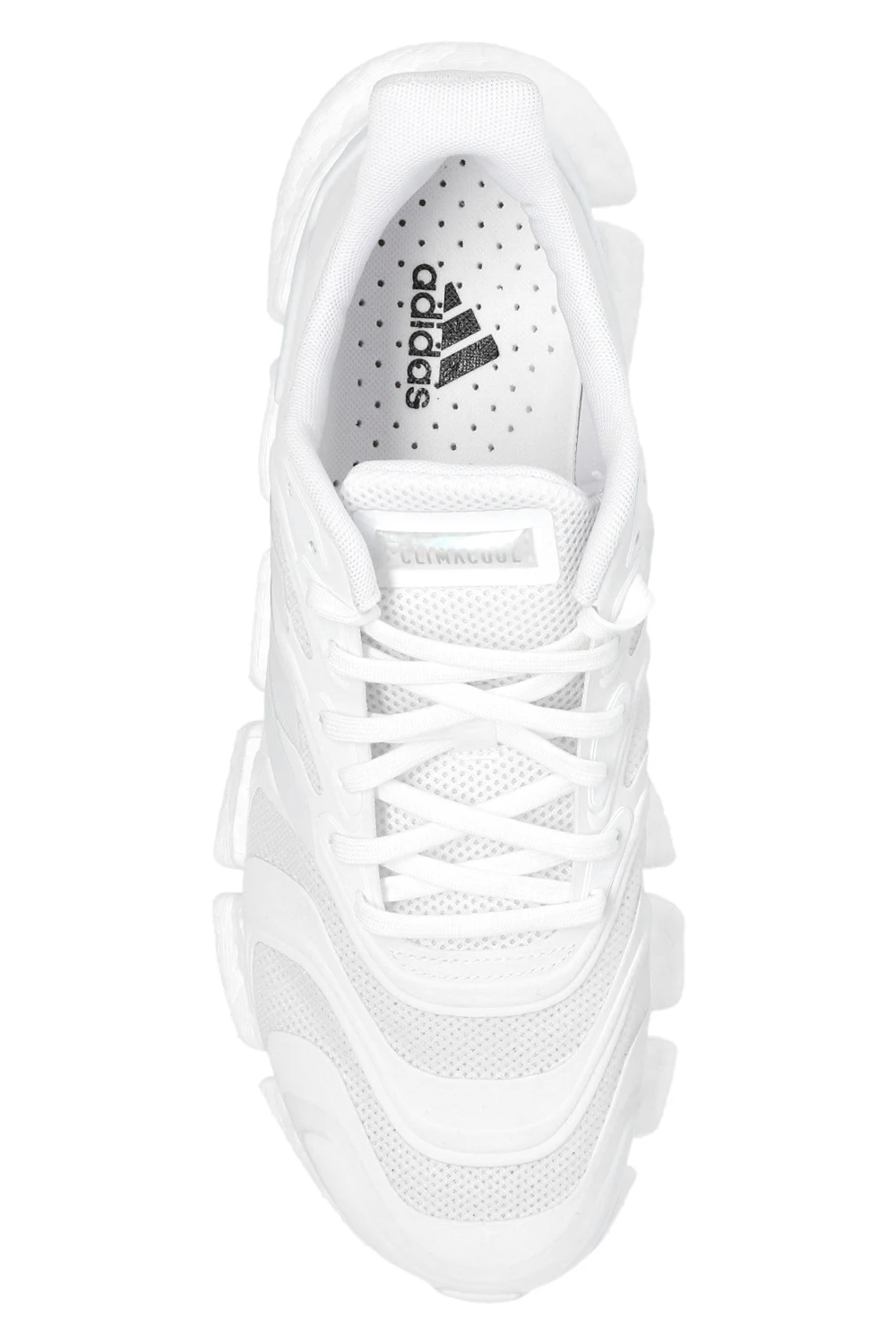 Białe, sznurowane buty, model ‘Climacool Vento’ ADIDAS Performance. Wykonane z oddychającego, plecionego materiału SUMMER.RDY – stworzonego z myślą o komforcie stopy nawet w najbardziej upalne, letnie dni. Z boku charakterystyczne dla marki trzy paski w kolorze jasnoniebieskim. Na języku wypukła aplikacja z nadrukiem w kolorze srebrnym. Podeszwa środkowa z amortyzacją BOOST. Biała, gumowa podeszwa wzbogacona o system wentylacji.