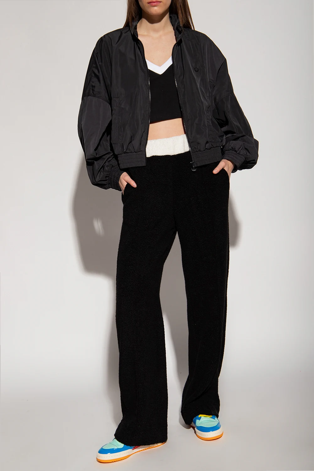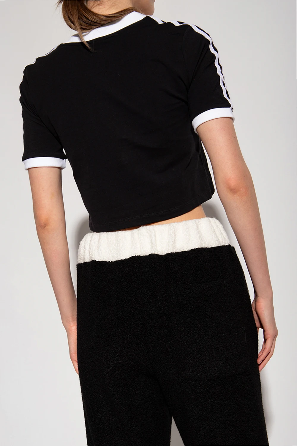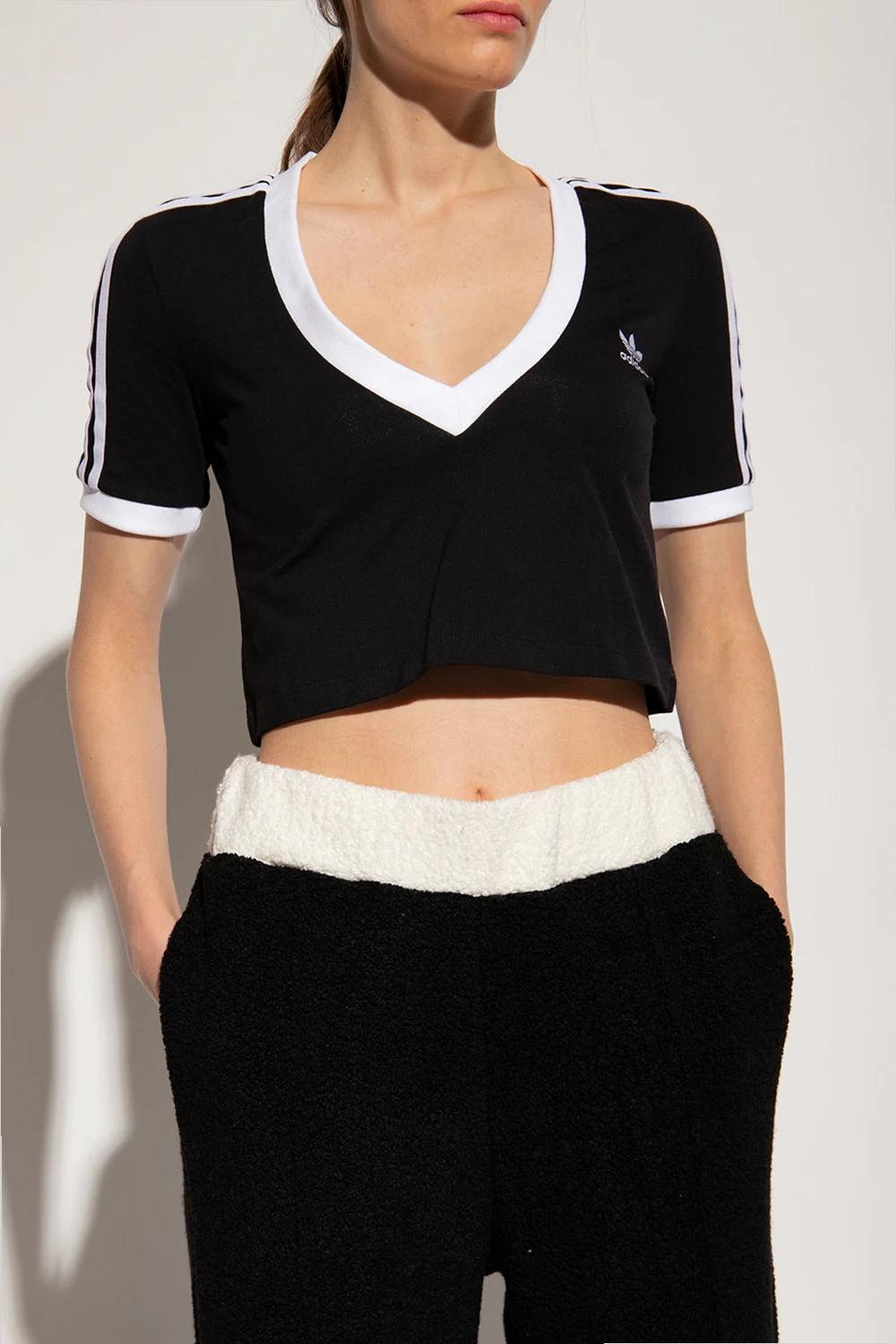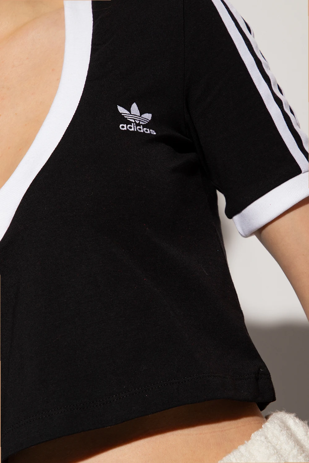 Czarny, krótki top ADIDAS Originals. Wykonany z bawełny. Ozdobiony naszywką z logo oraz charakterystycznymi dla marki pasami w kolorze białym. Dekolt w serek wykończony ściągaczem. Krótkie rękawy.