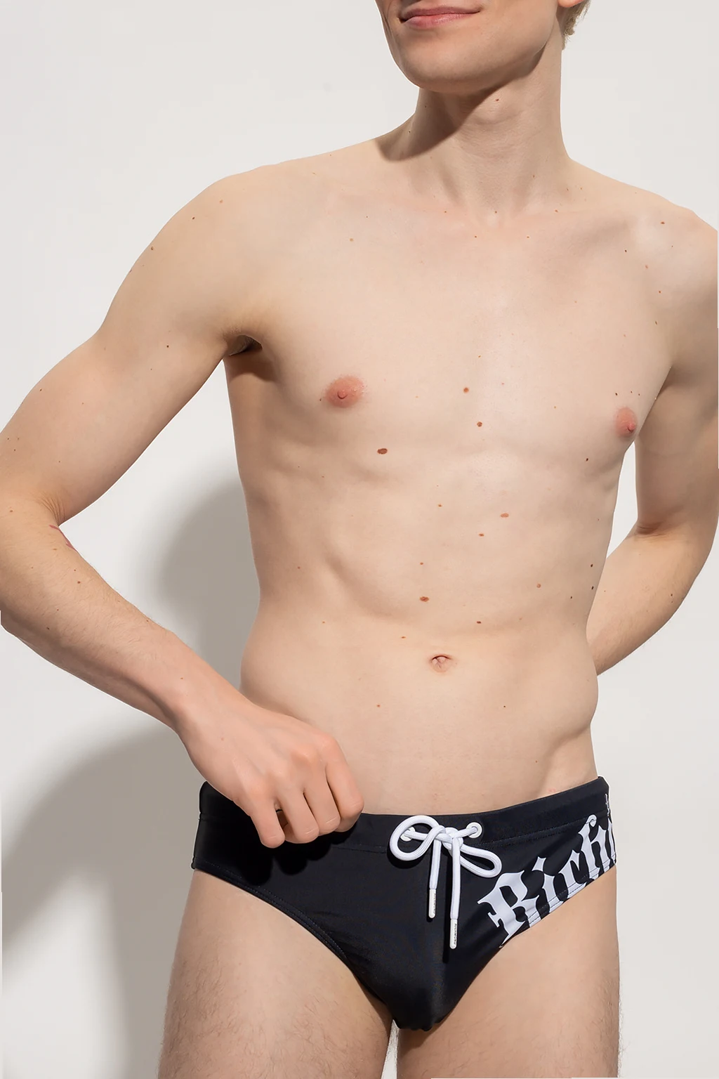 Czarne slipy kąpielowe John Richmond. W pasie wszyta guma ściągana trokami. Ozdobione wzorem z logo w kolorze białym.