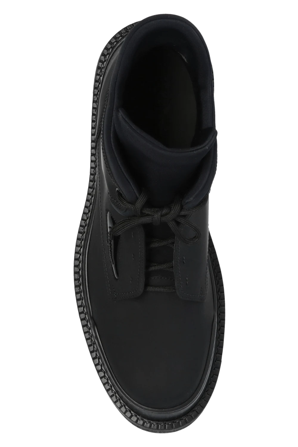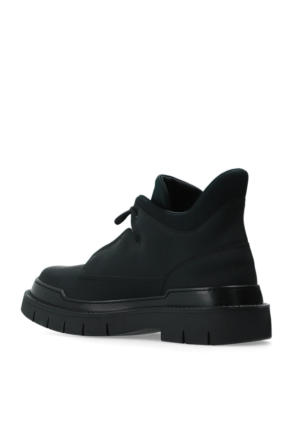 Czarne, wiązane buty za kostkę, model ‘Neji’ Salvatore Ferragamo. Wykonane ze skóry i materiału. Ozdobione wstawką z logo. Czarna, gumowa podeszwa.