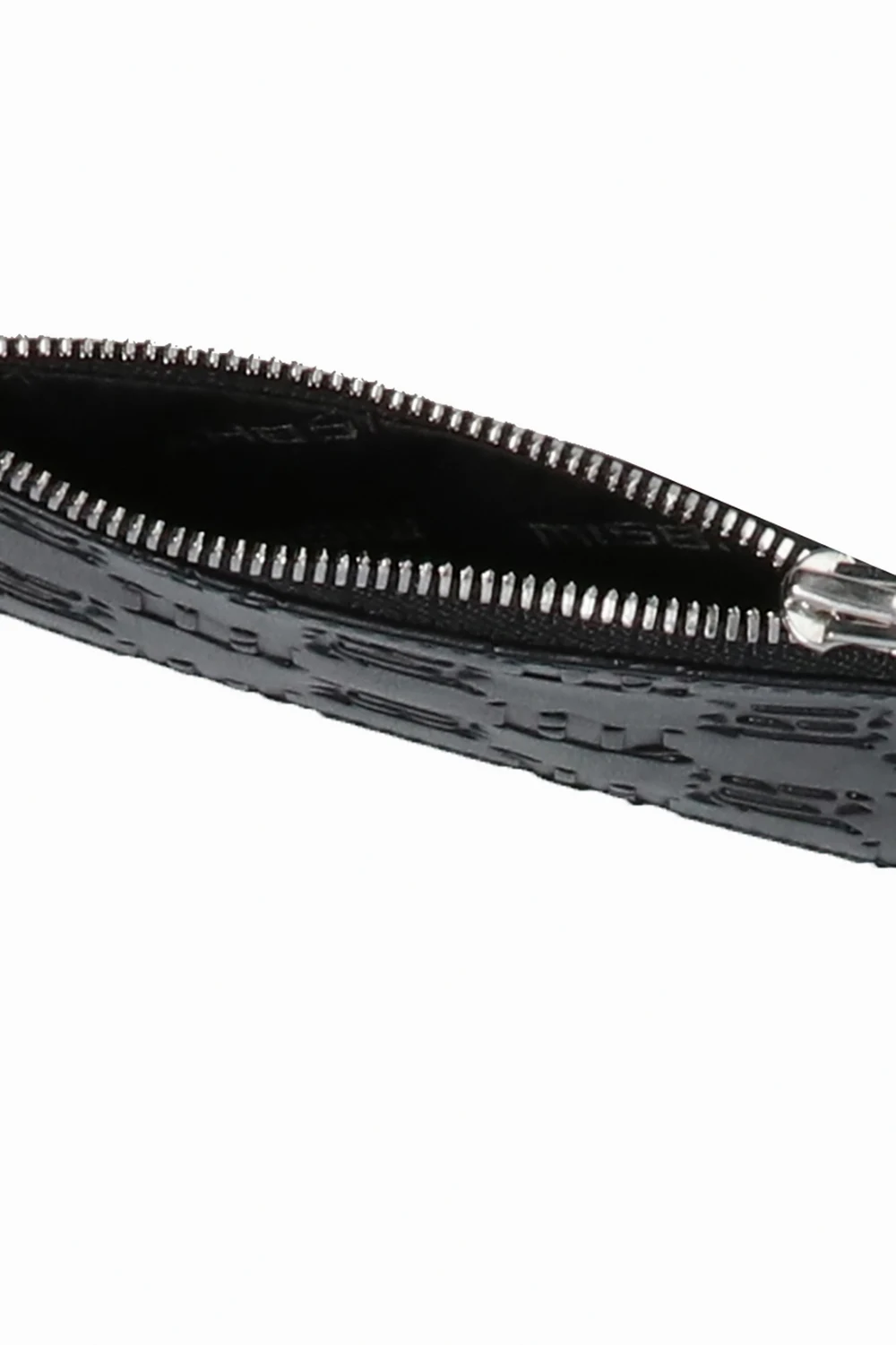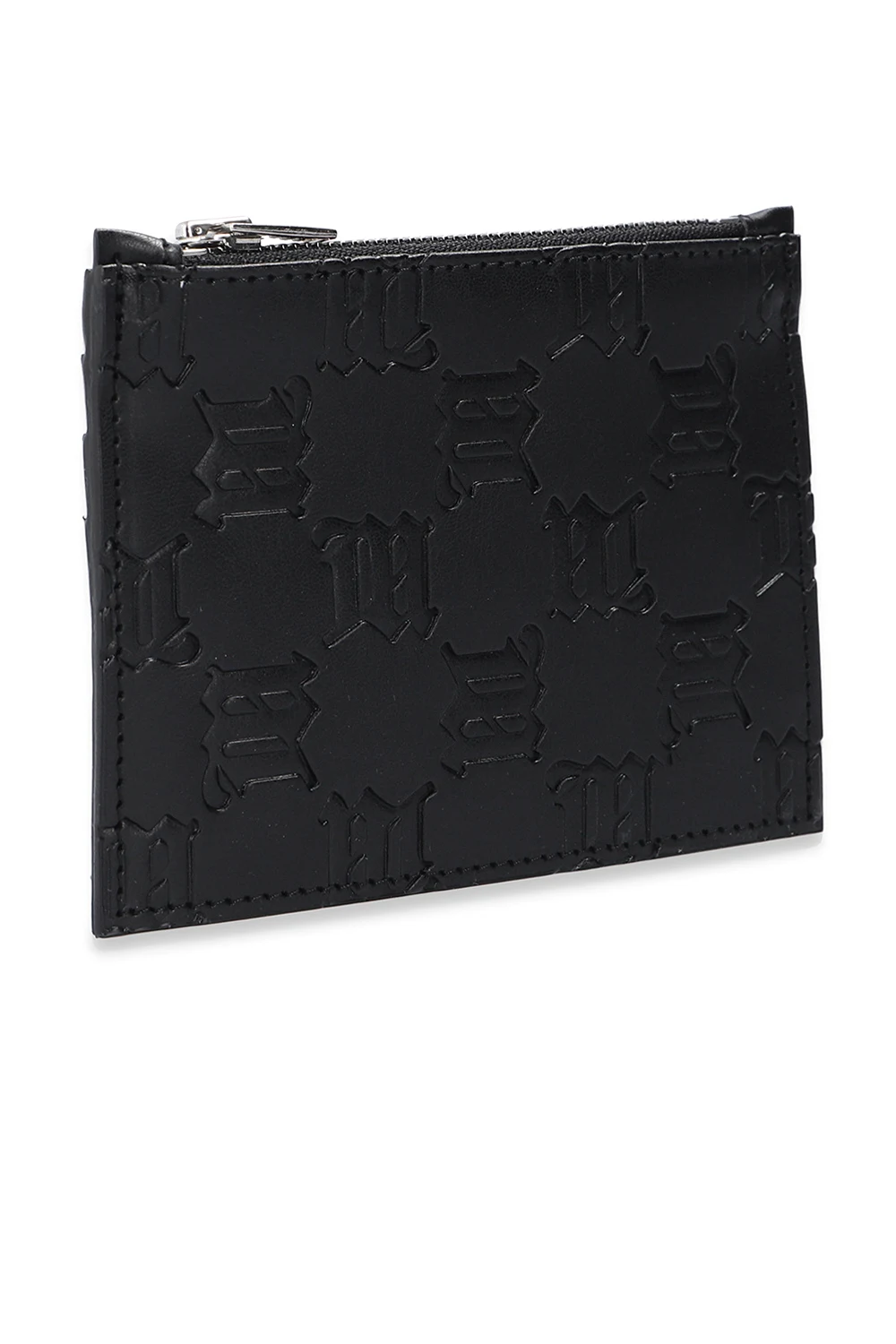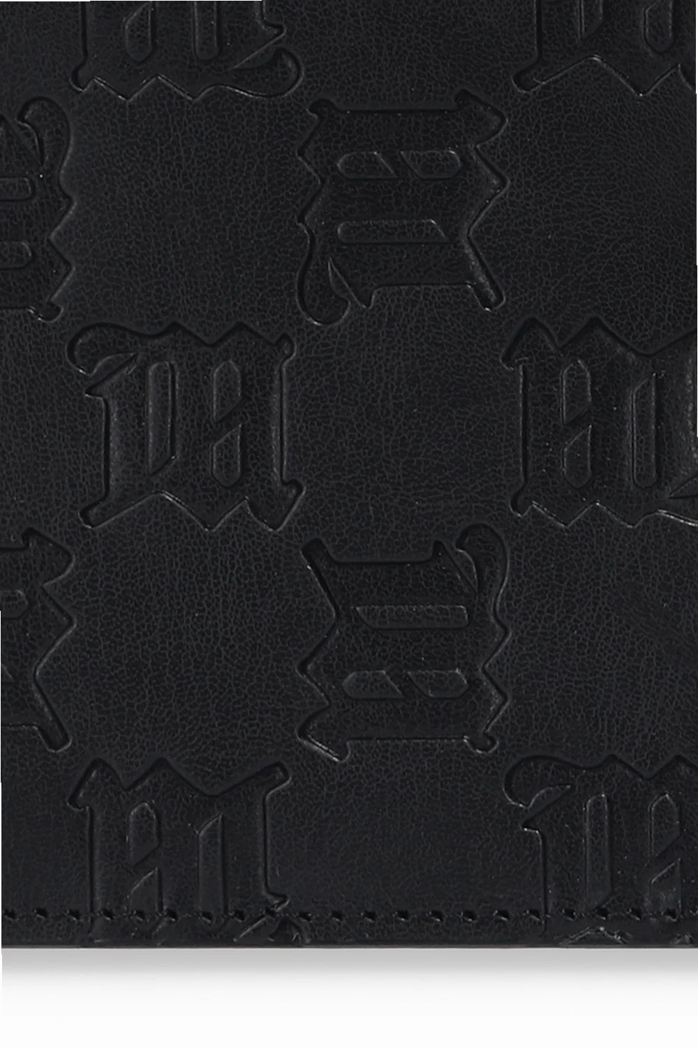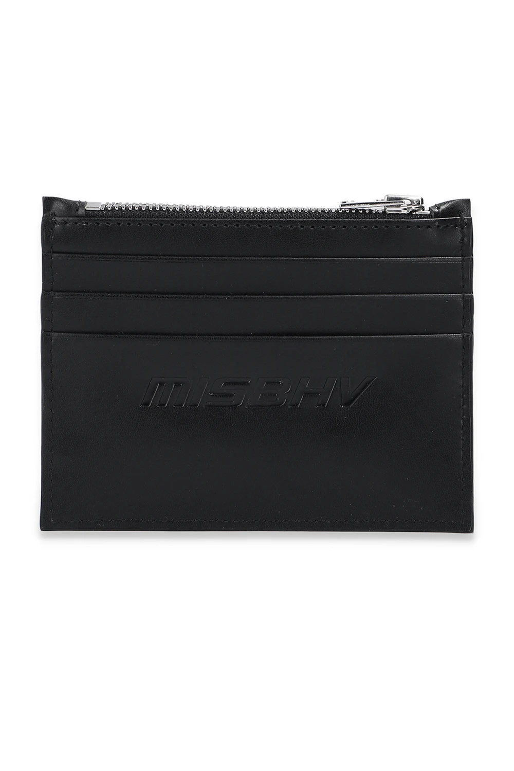 Czarne etui na karty MISBHV. Wykonane ze skóry. Zamykane na zamek. Ozdobione wytłoczonym wzorem z monogramem ‘M’. Z tyłu trzy miejsca na karty. Wewnątrz komora.