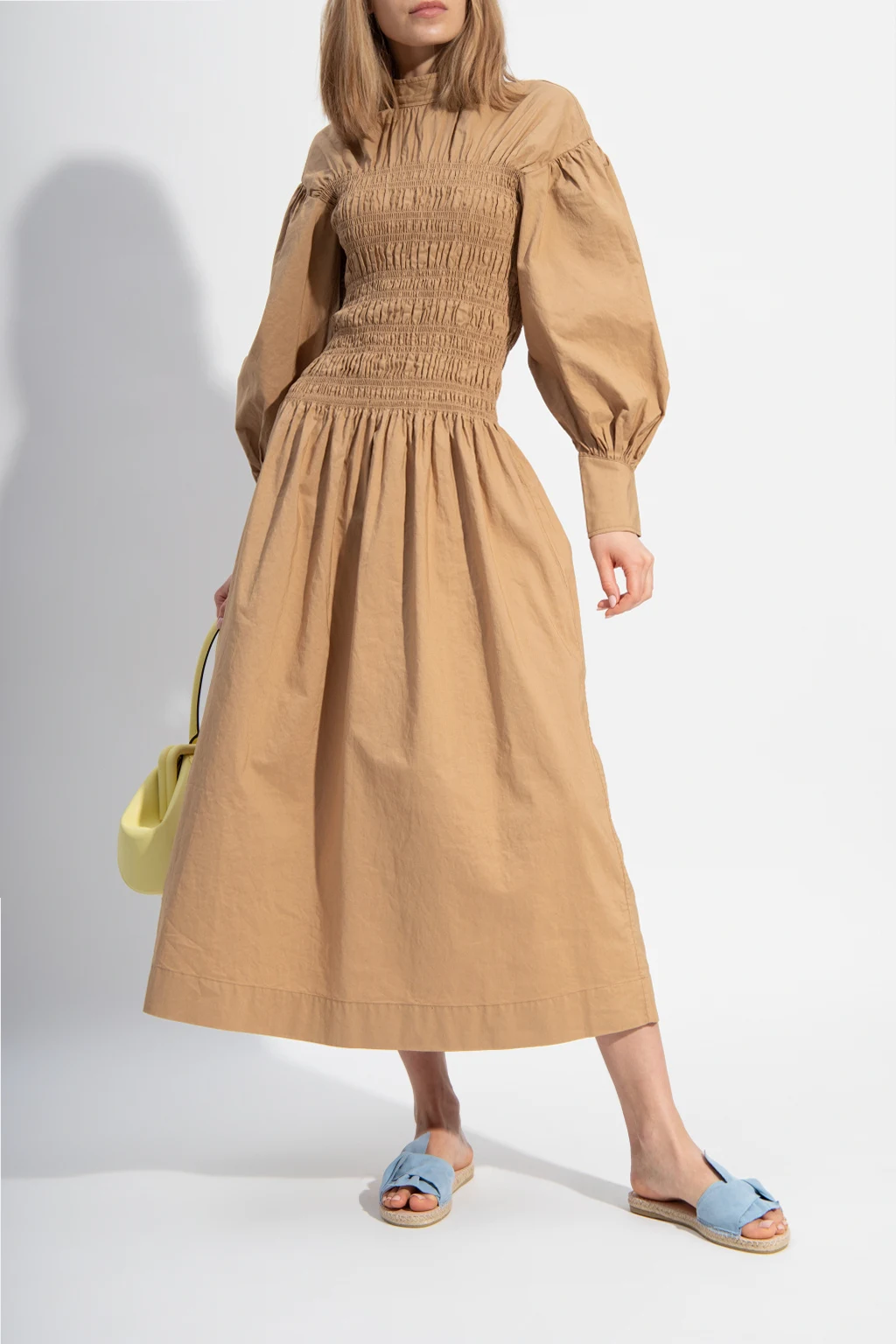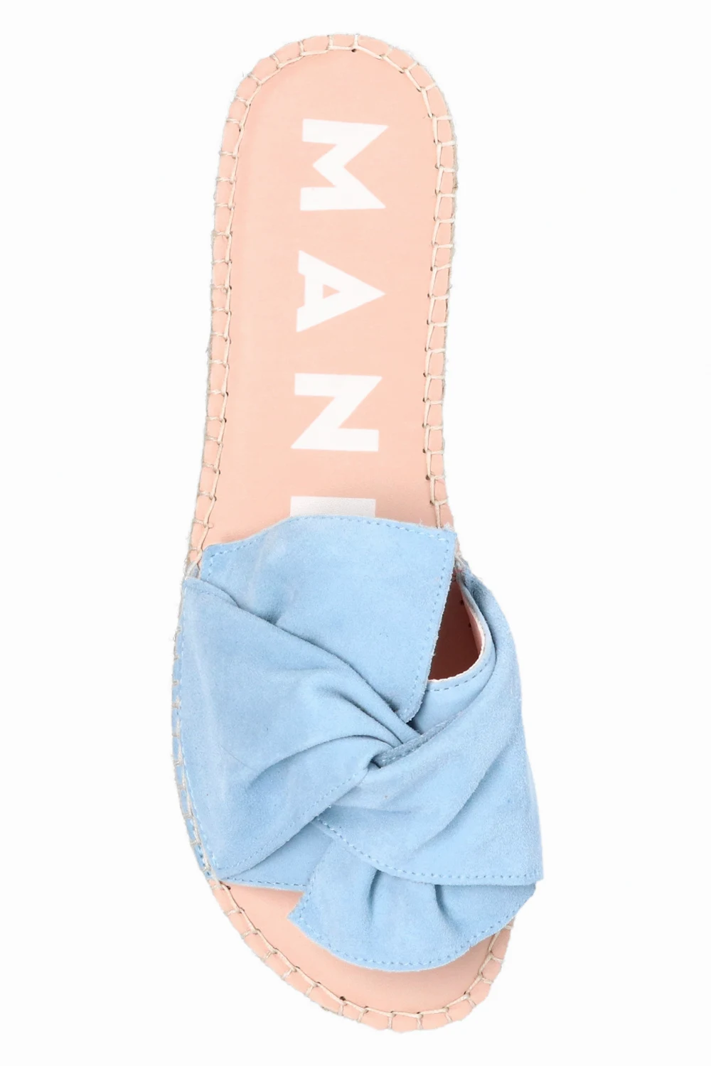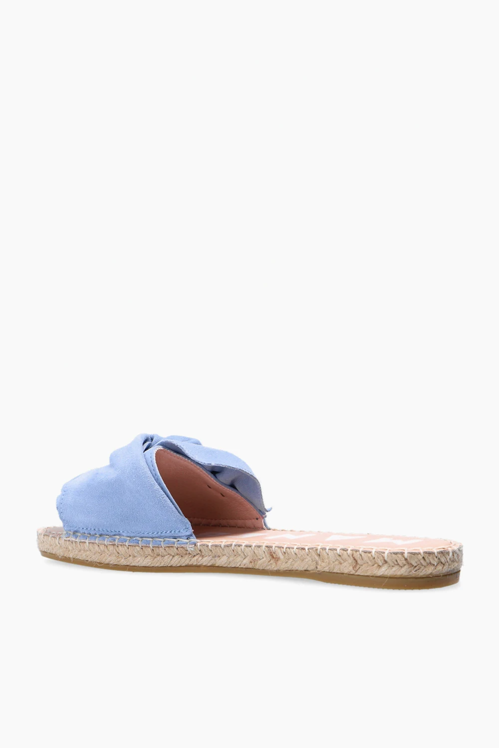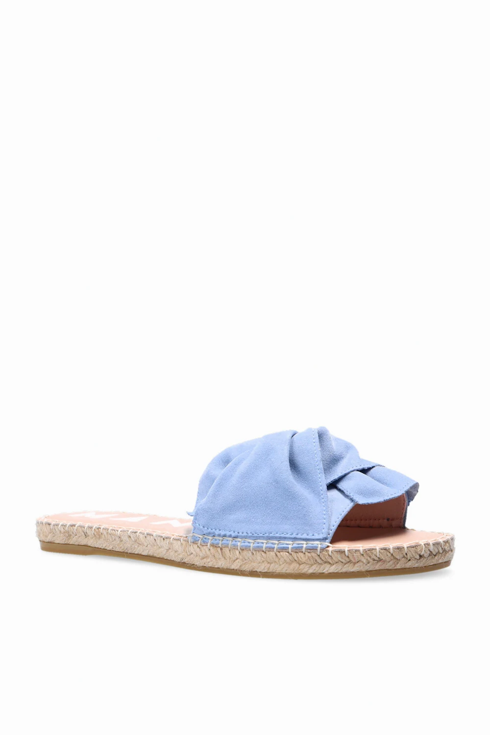 Niebieskie klapki, model ‘Hamptons’ Manebi. Wykonane z zamszu. Ozdobione kokardą. Platforma wykończona naturalną jutą w kolorze beżowym. Beżowa, gumowa podeszwa.