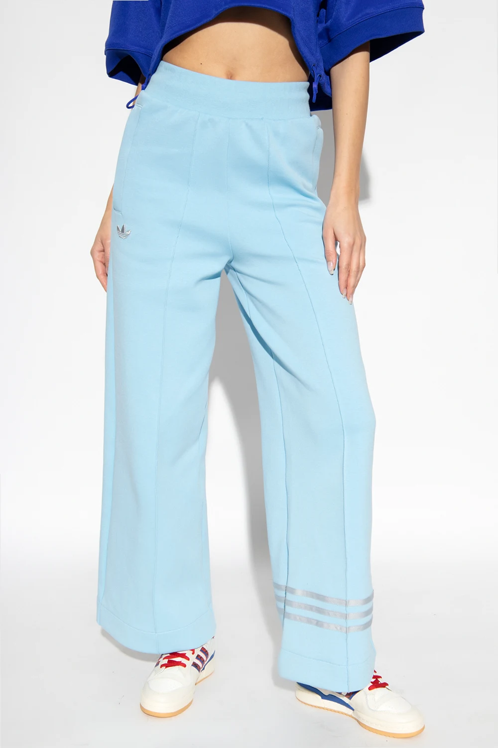Jasnoniebieskie spodnie dresowe ADIDAS Originals. Częściowo wykonane z materiałów pochodzących z recyklingu. Wysoki stan. W pasie ściągane trokami. Ozdobione wyszytym szarym logo i naszytymi trzema szarymi charakterystycznymi paskami. Z przodu dwie kieszenie. Szerokie nogawki o prostym kroju z przeszyciem.