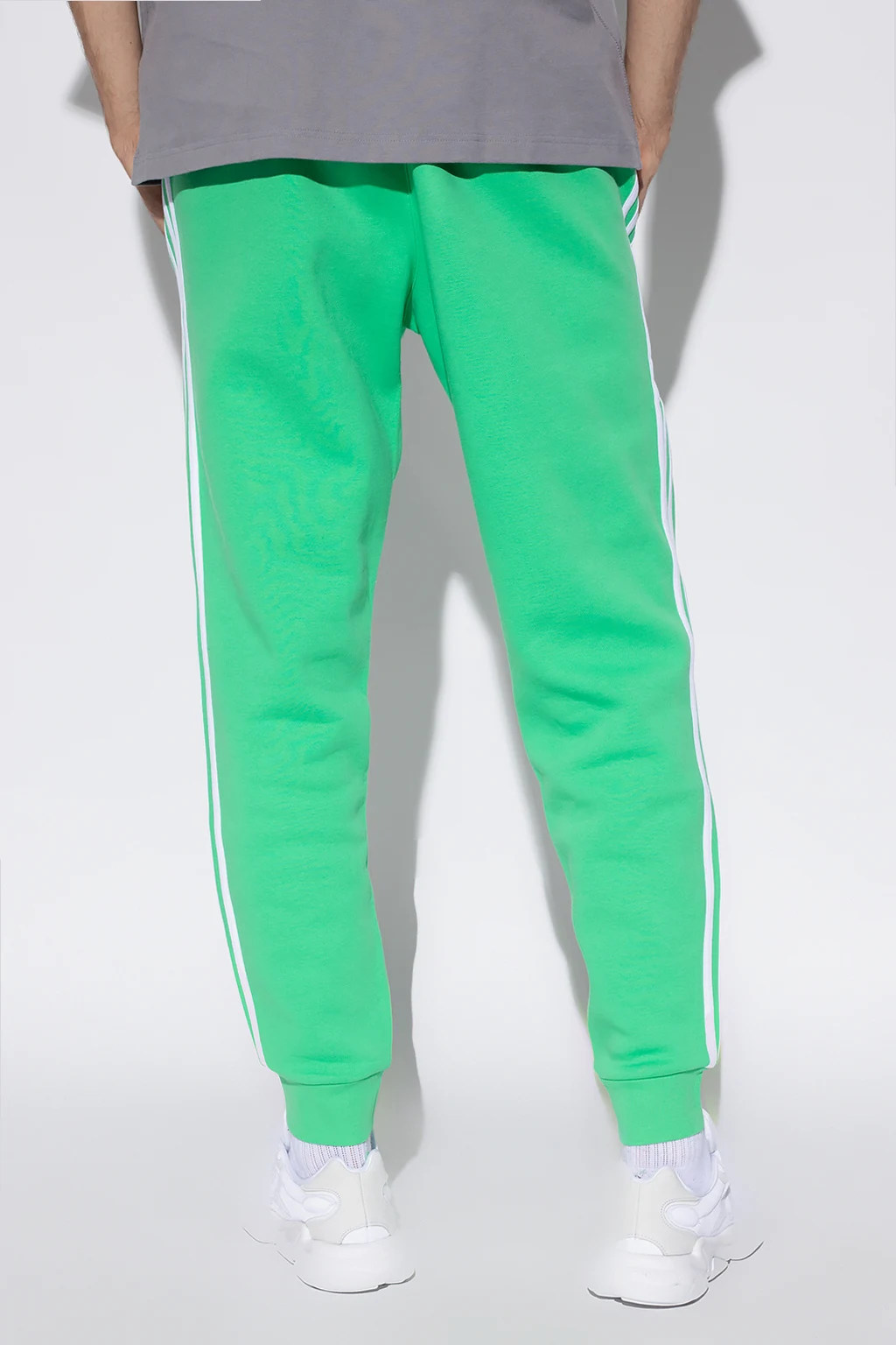 Zielone spodnie dresowe ADIDAS Originals. Wykonane z bawełny. W pasie wszyta guma. Wyszyte logo w kolorze białym. Po bokach charakterystyczne dla marki trzy paski. Dwie kieszenie zapinane na zamki. Zwężane nogawki.