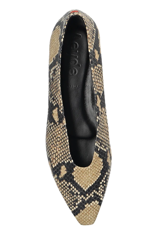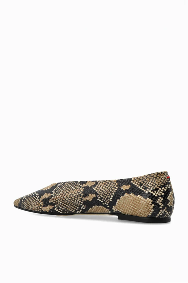 Baleriny "Betty" marki Aeyde to wykwintna propozycja dla wielbicielek wysublimowanego stylu. Ich klasyczna linia została subtelnie unowocześniona poprzez lekko migdałowy nosek oraz nisko wyciętą cholewkę, delikatnie eksponującą stopę. Całość przykuwa wzrok niepowtarzalnym wzorem naśladującym strukturę skóry węża, z artystycznym rozmieszczeniem beżowych i czarnych plam, co tworzy elegancki, wyrazisty akcent.