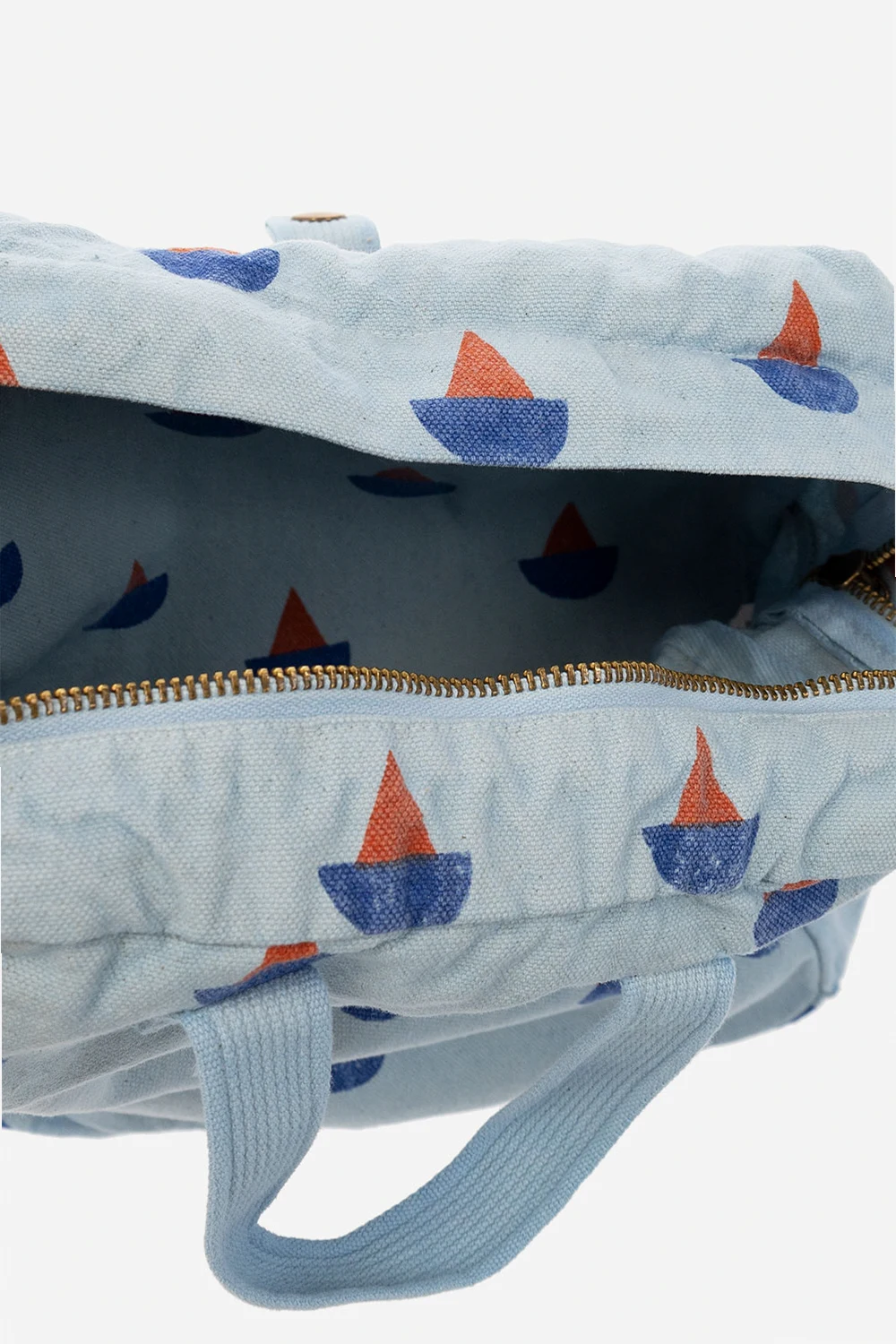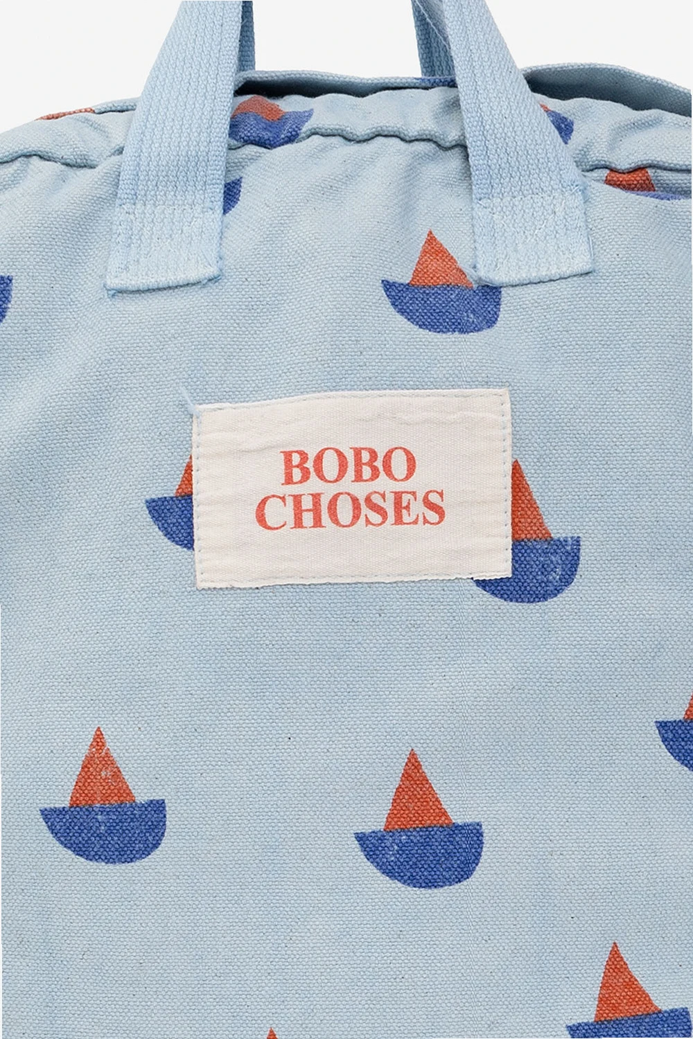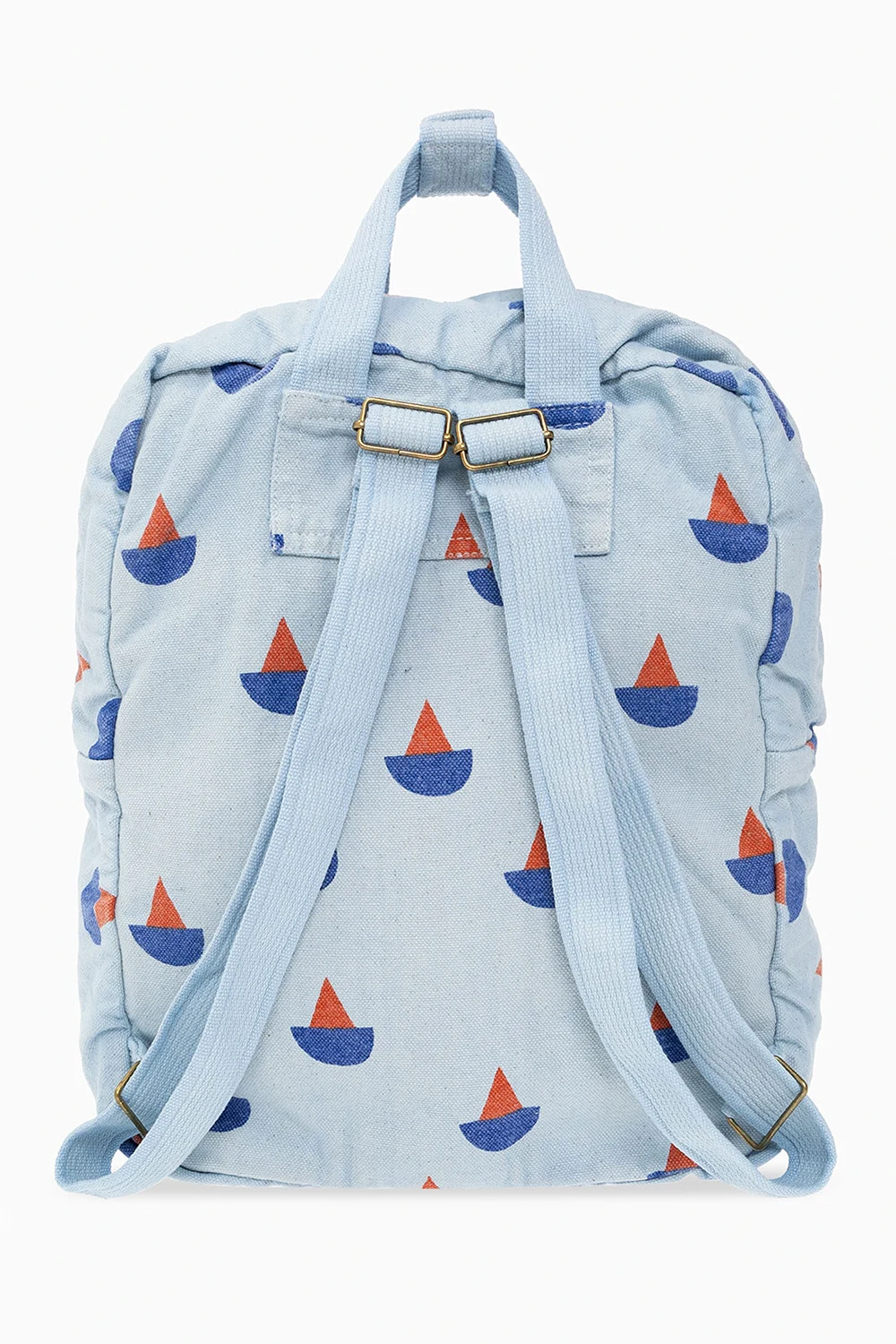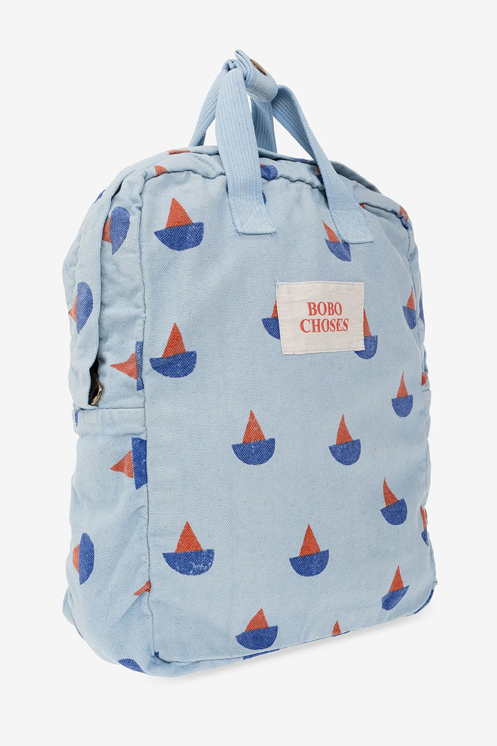 Niebieski plecak Bobo Choses. Wykonany z bawełny. Zapinany na zamek. Ozdobiony naszywką z logo oraz wzorem w kształcie łodzi. Dwie półokrągłe rączki. Szelki z możliwością regulacji długości. Wewnątrz komora oraz wsuwana kieszeń. Metalowe wykończenie w kolorze postarzanego złota.