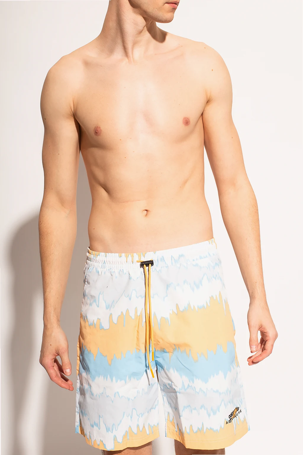 Biało-niebiesko-pomarańczowe szorty kąpielowe ADIDAS Originals. W pasie ściągane trokami. Ozdobione marszczeniami, nadrukowanym wzorem oraz wyszytym logo.