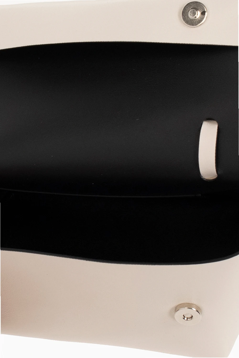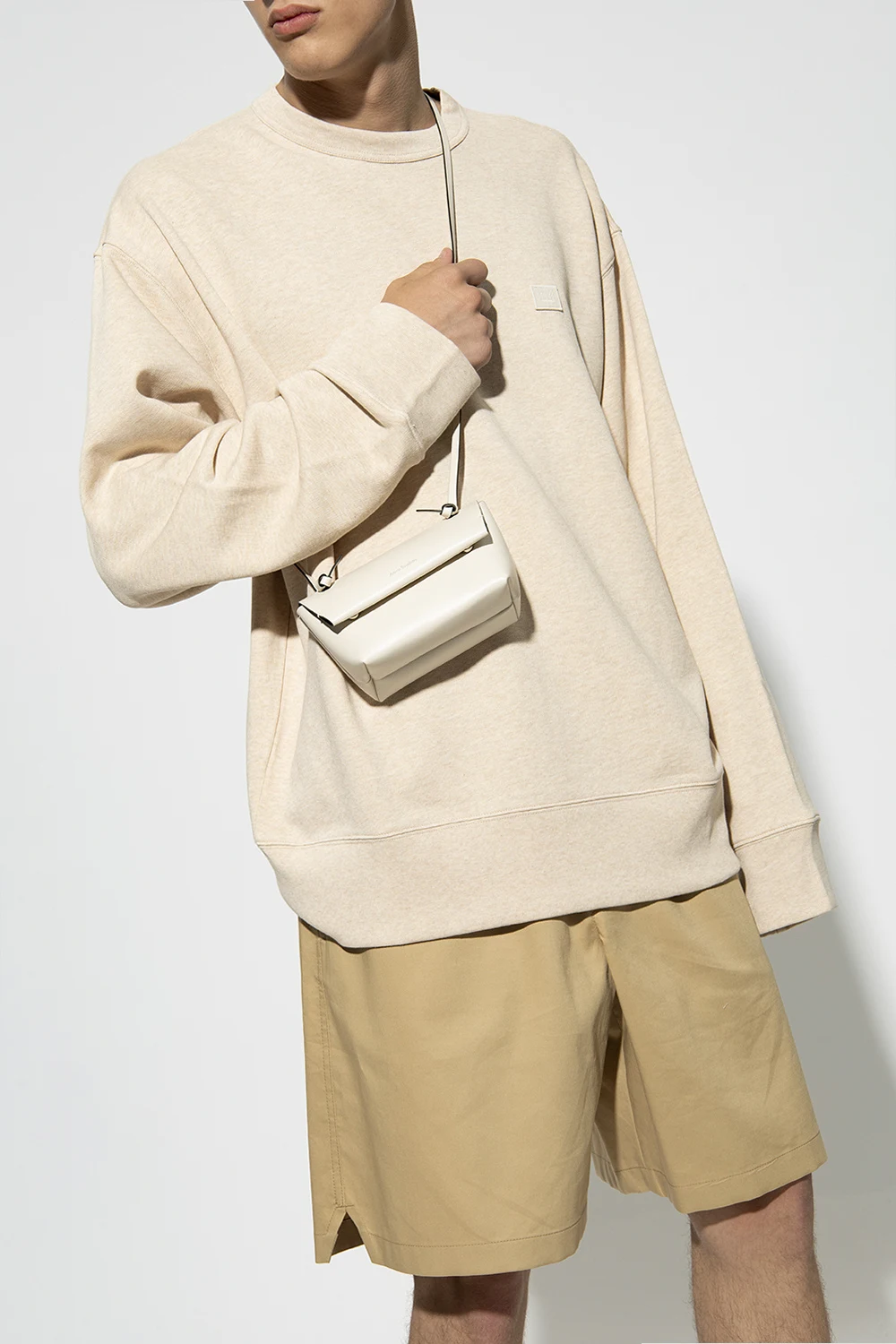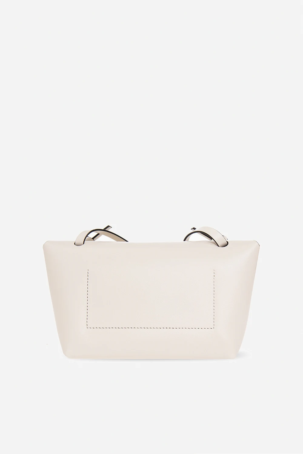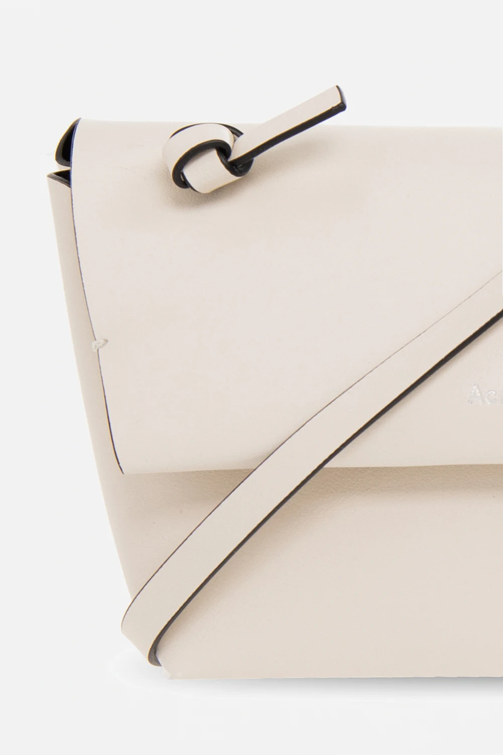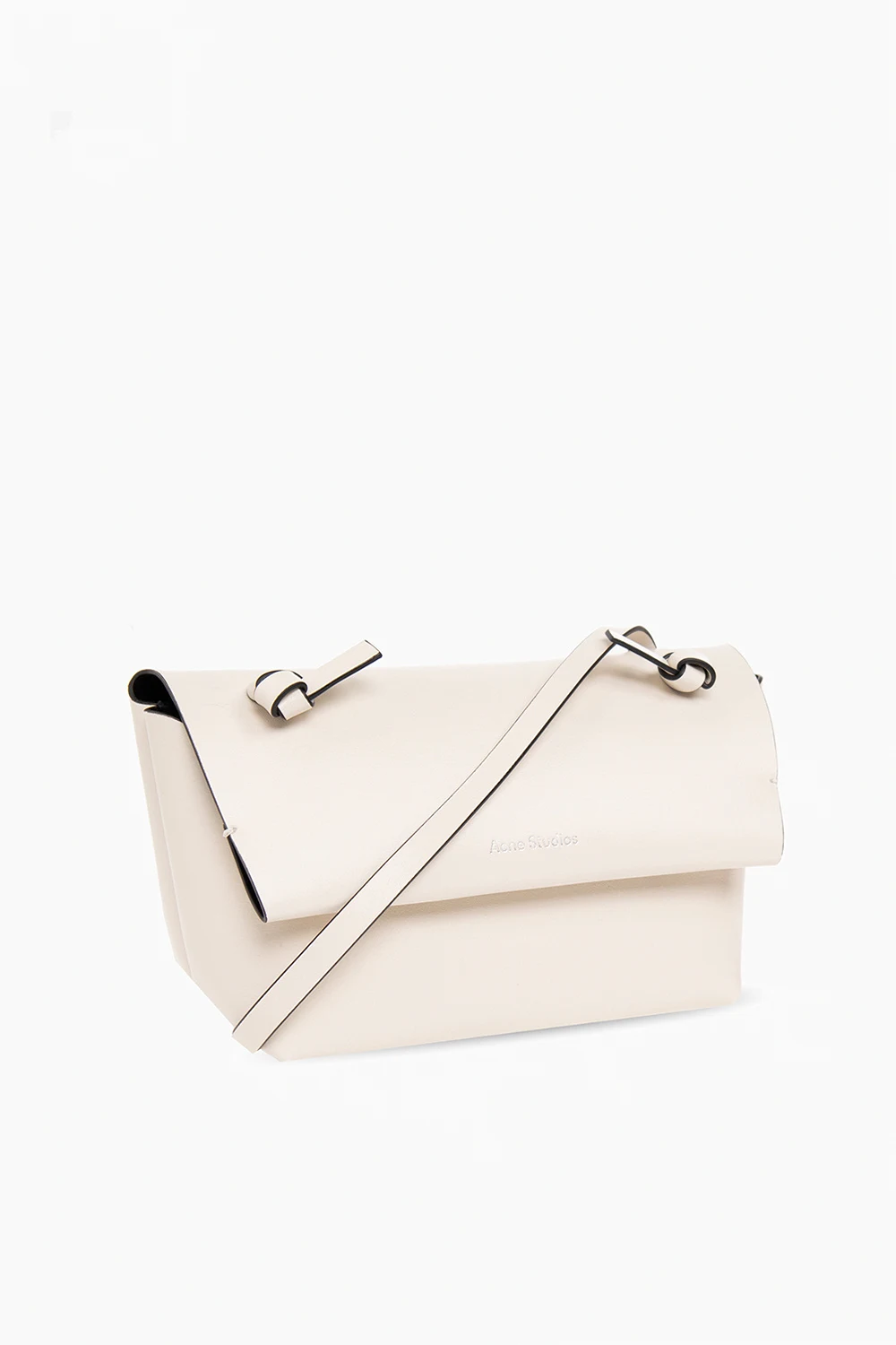 Biała torba na ramię Acne Studios. Wykonana ze skóry. Zamykana na zatrzaski. Z przodu ozdobiona nadrukowanym logo w kolorze srebrnym. Pas na ramię wykończony węzłami. Wewnątrz komora z wsuwaną kieszenią. Metalowe wykończenie w kolorze srebrnym.
