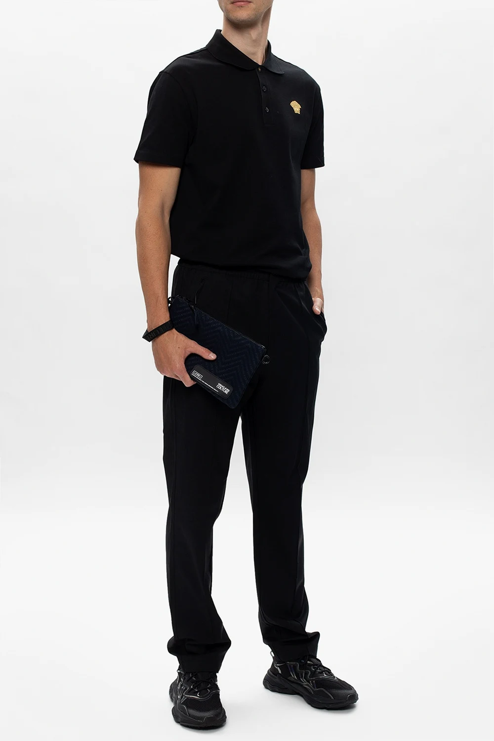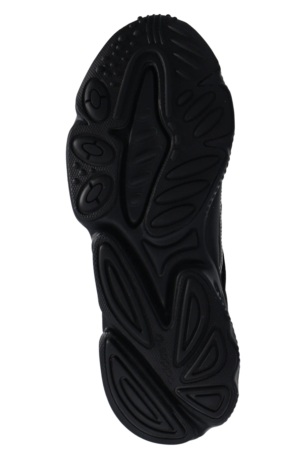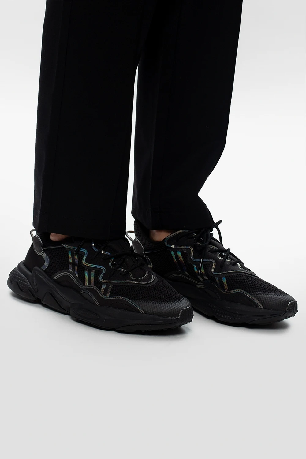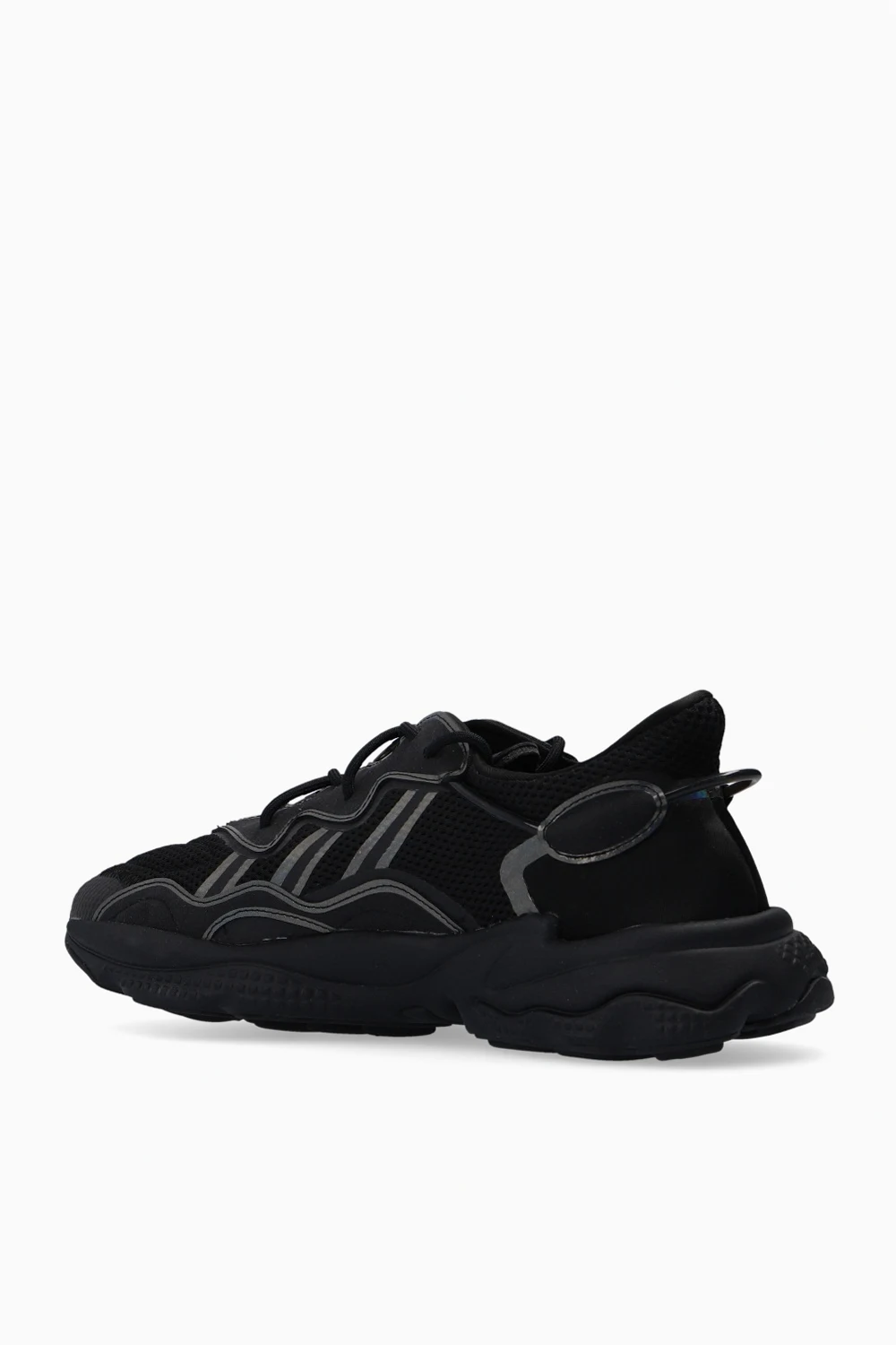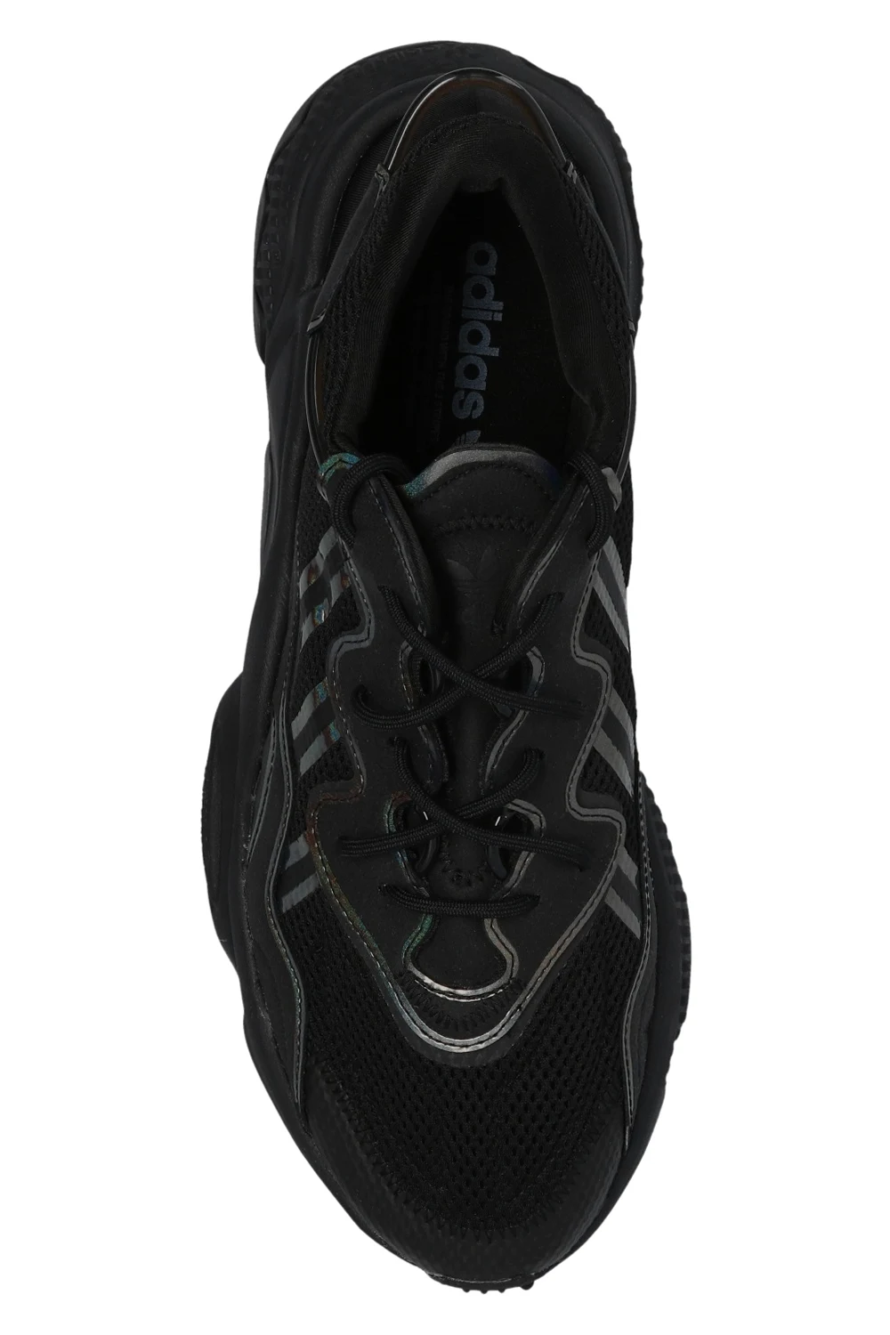 Czarne, sznurowane buty sportowe, model ‘Ozweego’ ADIDAS Originals. Wykonane z siatki. Ozdobione wstawkami w kolorze srebrnym z efektem holograficznym. Z boku charakterystyczne dla marki trzy paski. Amortyzacja Adiprene+ oraz lekka podeszwa środkowa z pianki EVA. Czarna, gumowa podeszwa zewnętrzna.