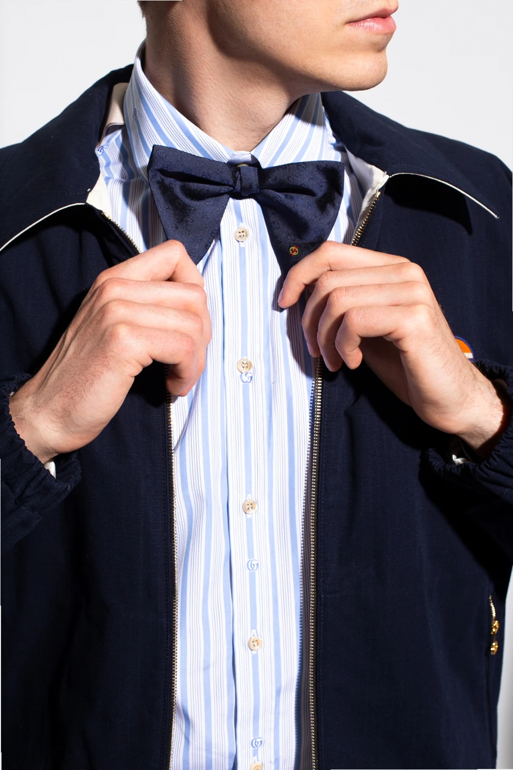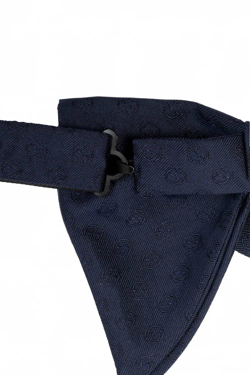 Granatowa mucha Gucci. Wykonana z jedwabiu. Zapinana na haftkę z możliwością regulacji długości. Wyszyty wzór z logo.