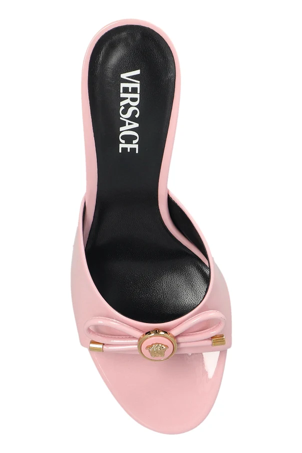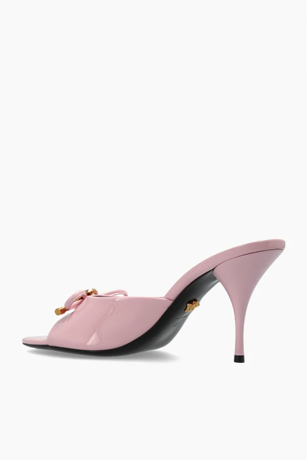 Klapki na obcasie Opera Bow marki Versace to arcydzieło kobiecej elegancji, w którym klasyka spotyka się z nowoczesnością. Niezrównany różowy kolor, połyskująca powierzchnia luksusowej skóry oraz wykwintny fason mule z otwartym noskiem składają się na niezwykły kunszt wykonania.