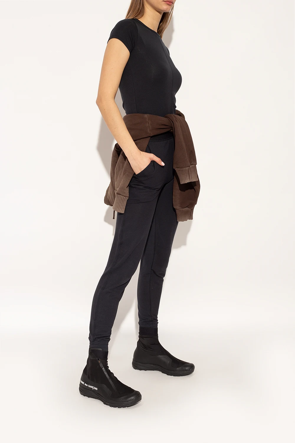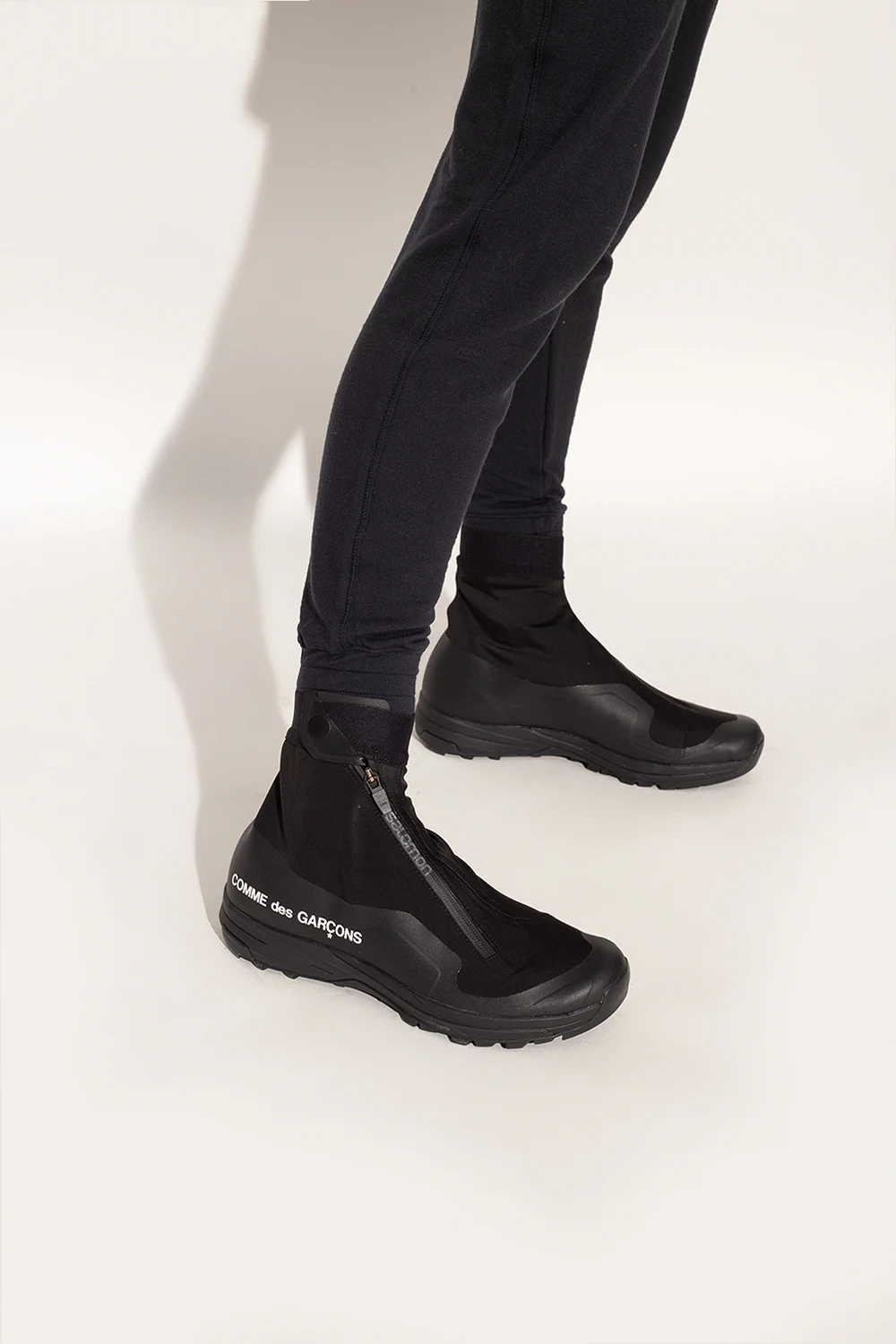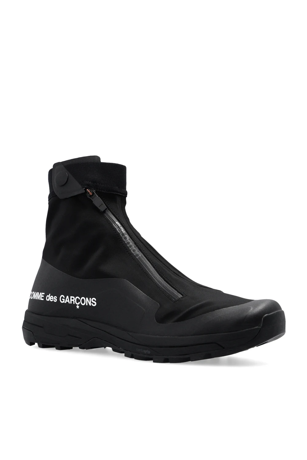 Czarne buty sportowe, model ‘XA-Alpine’ Comme des Garçons x Salomon. Zapinane na zatrzask oraz na zamek z logo. Z boku logo w kolorze białym. Czarna podeszwa z Contagrip® - zapewniającą bezpieczeństwo i przyczepność mieszanką gumy, która oferuje doskonałe właściwości trakcyjne w rozmaitym górskim terenie.