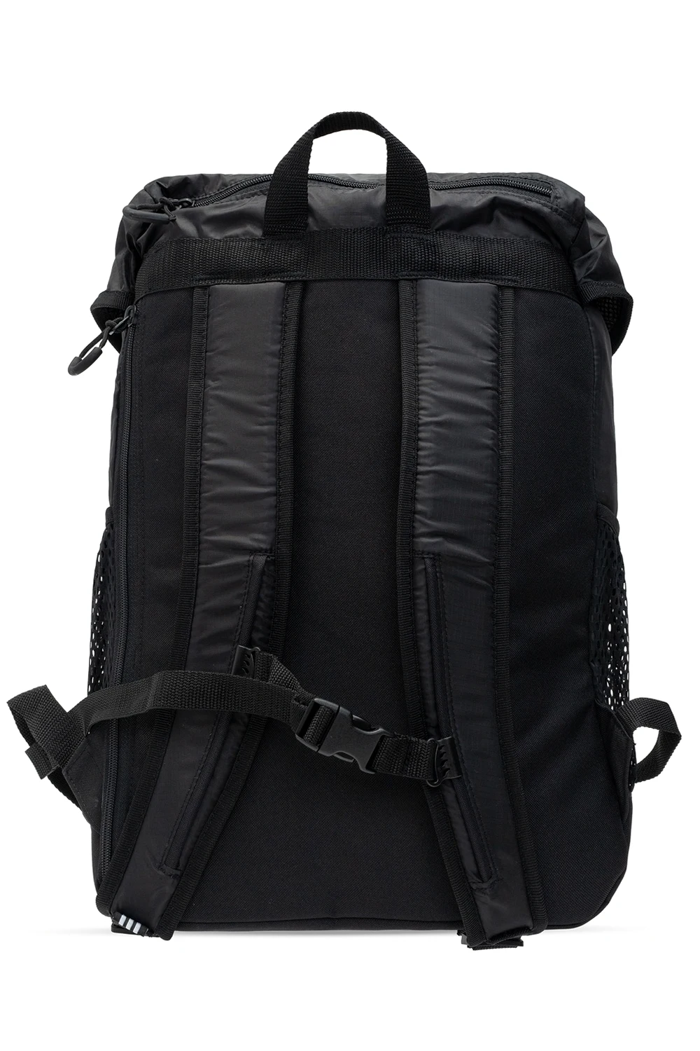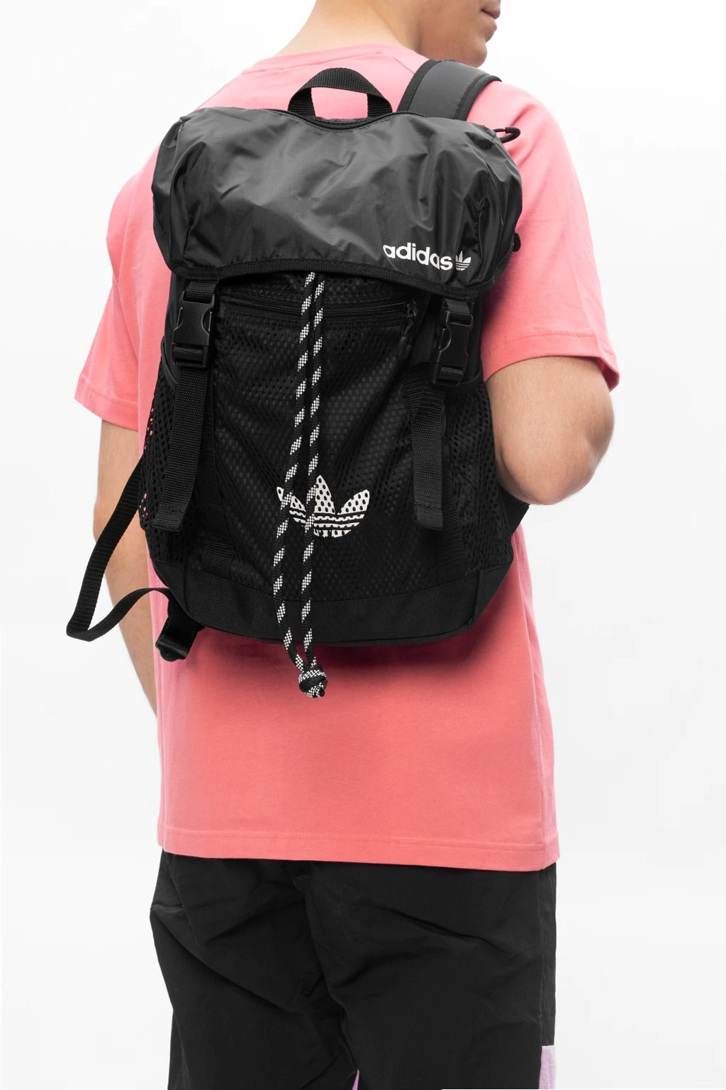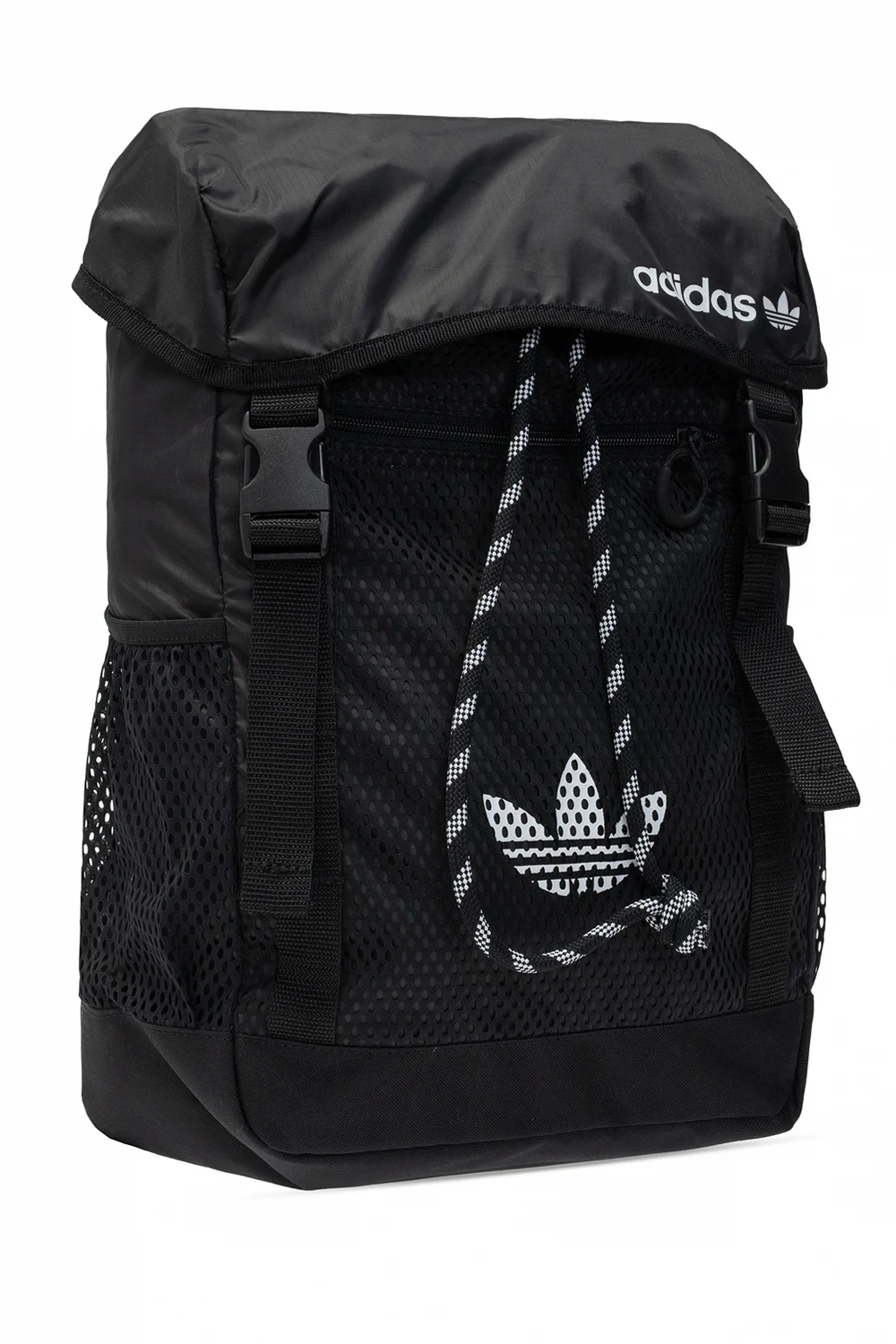 Czarny plecak ADIDAS Originals. Ściągany trokami i zapinany na zatrzaski. Ozdobiony nadrukowanym białym logo. Trzy kieszenie: jedna z przodu zapinana na zamek i dwie wsuwane po bokach. Półokrągła rączka. Regulowane szelki. Wewnątrz komora i trzy wsuwane kieszenie.