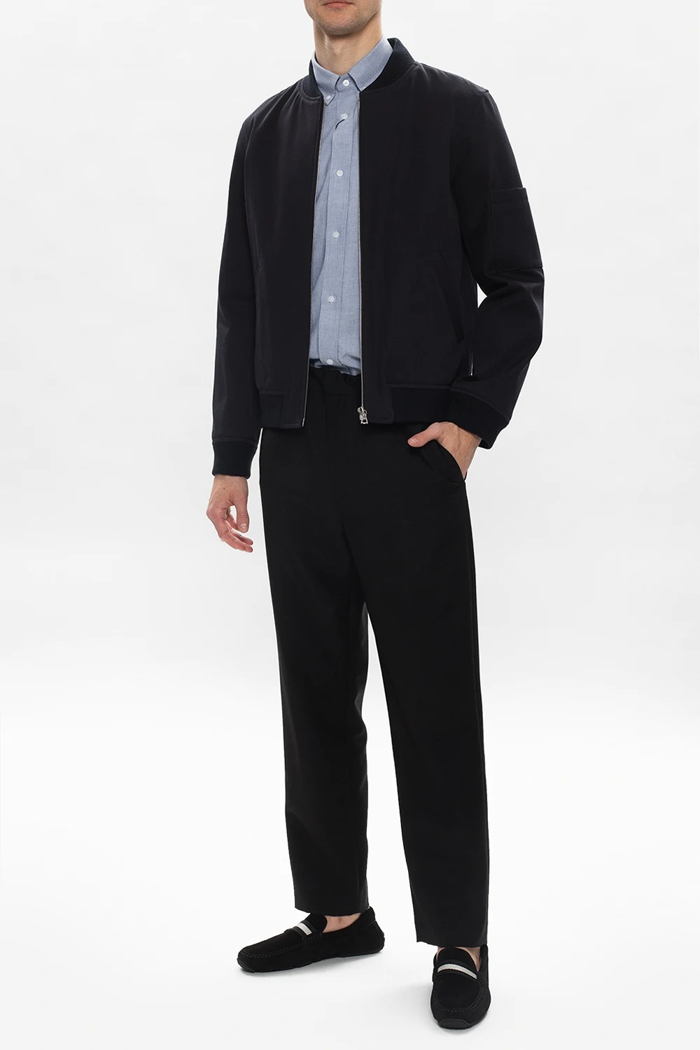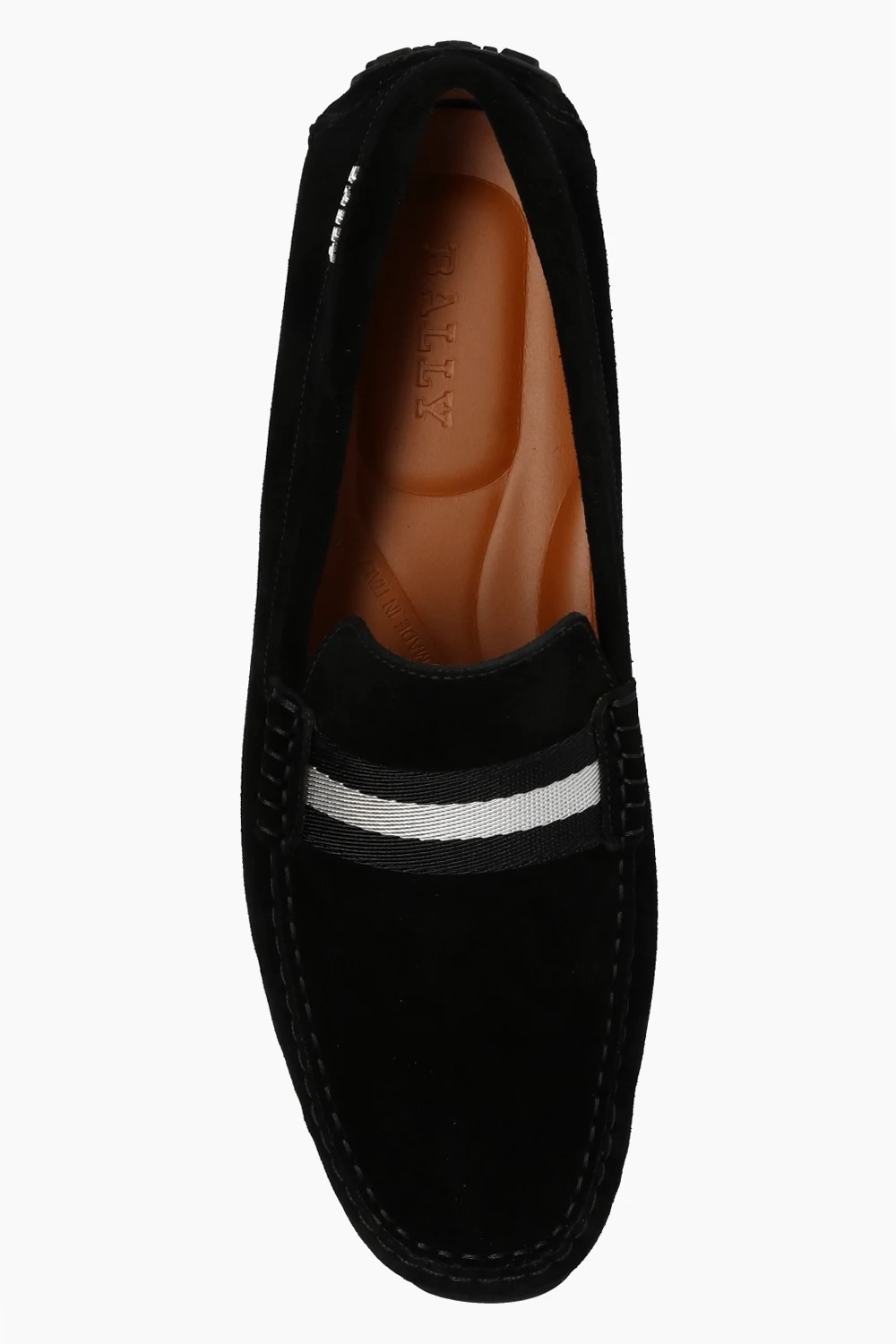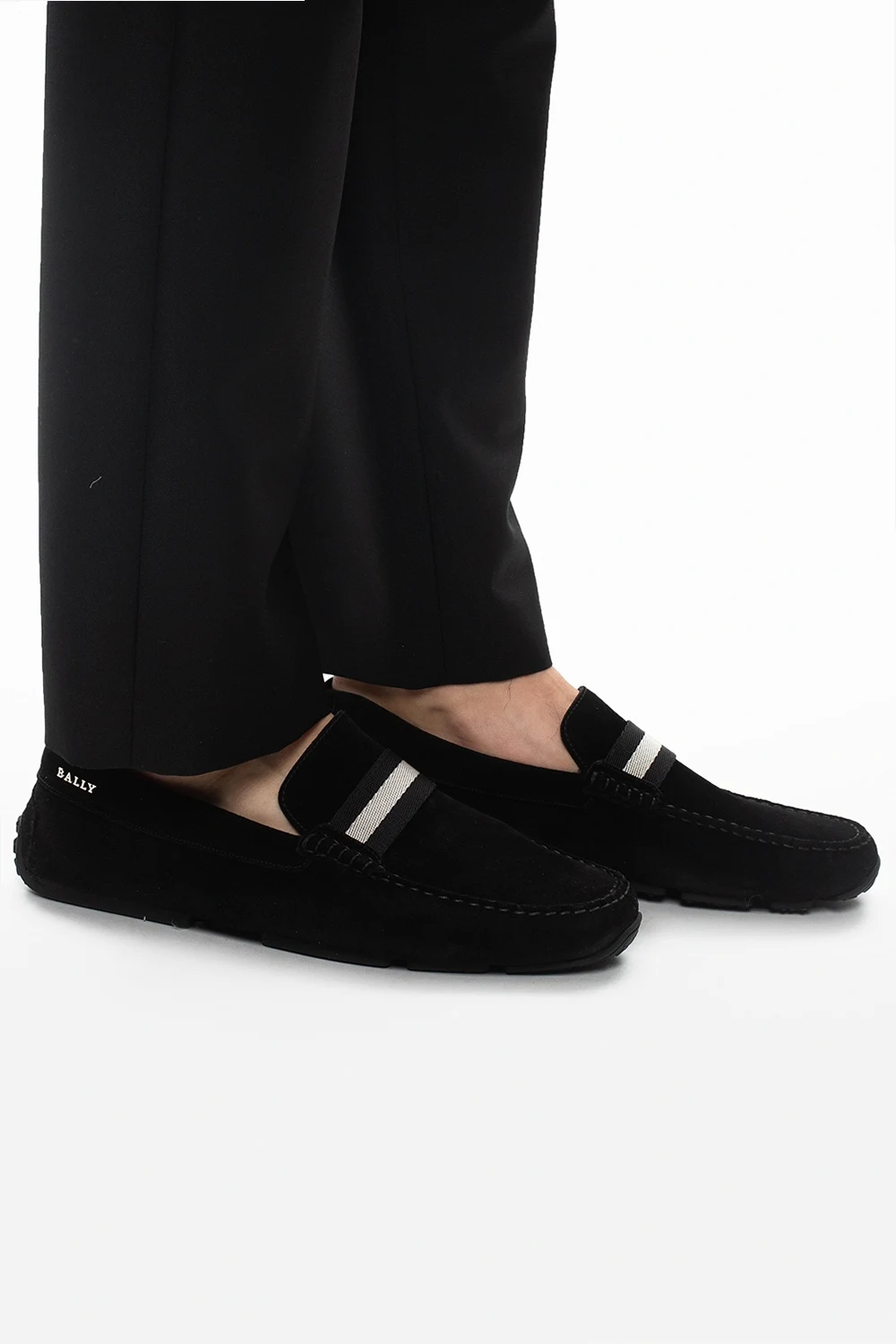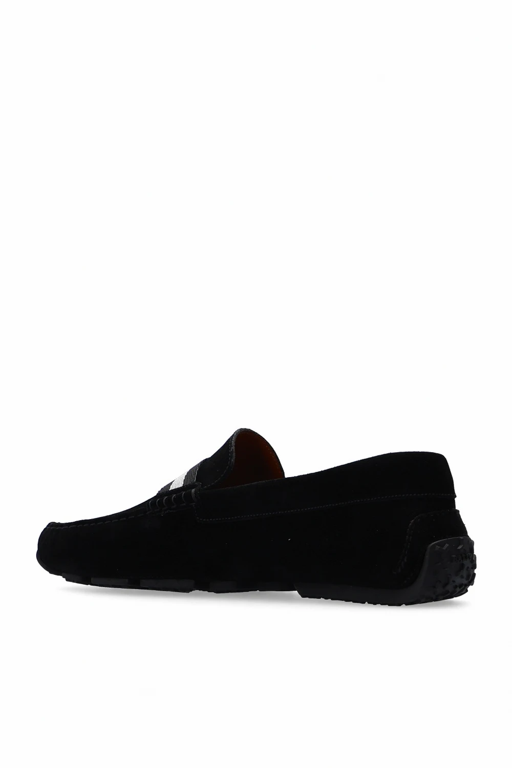 Czarne, zamszowe mokasyny, model ‘Pearce’ Bally. Ozdobione naszytym, rypsowym paskiem oraz elementem z logo. Czarna, gumowa podeszwa.