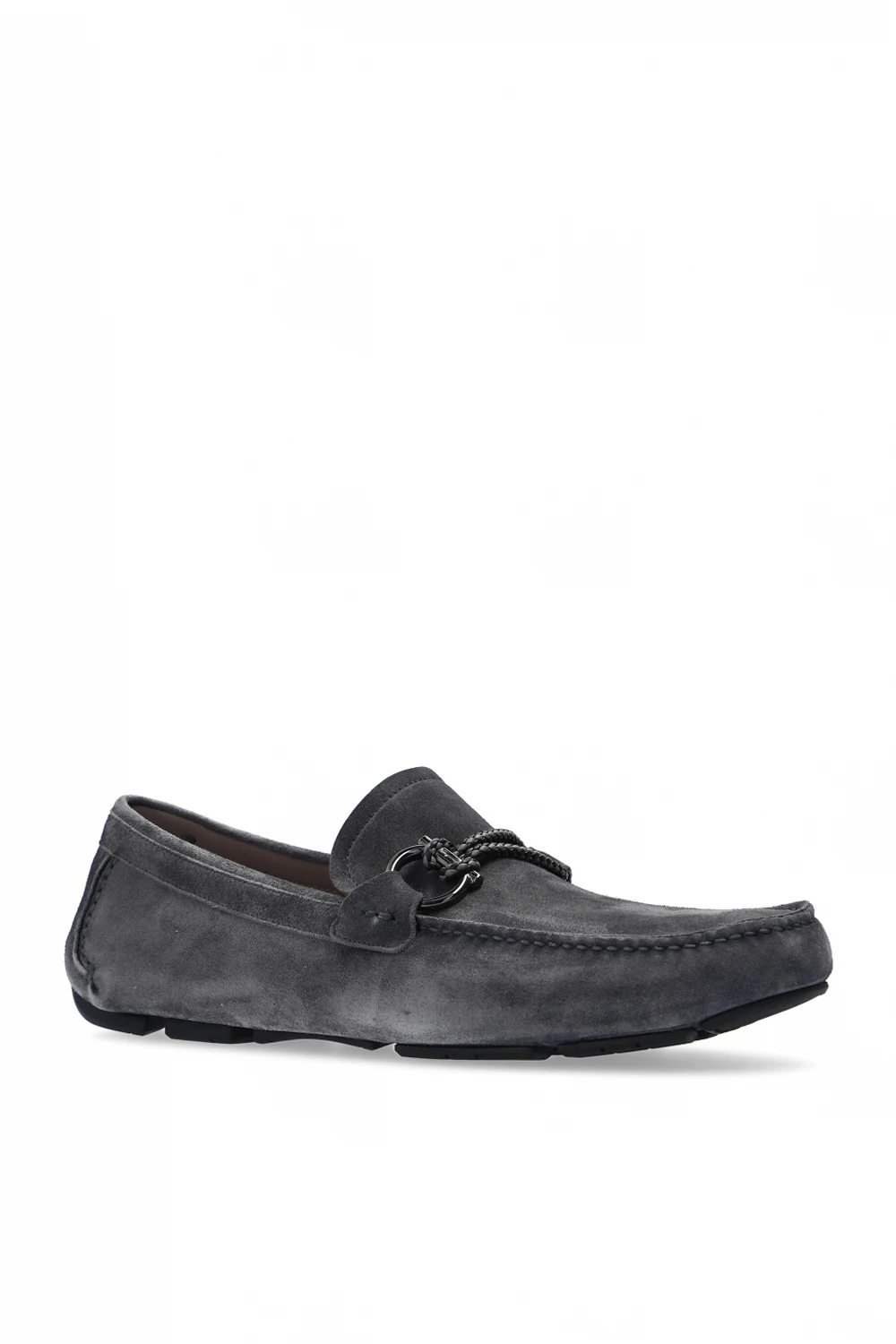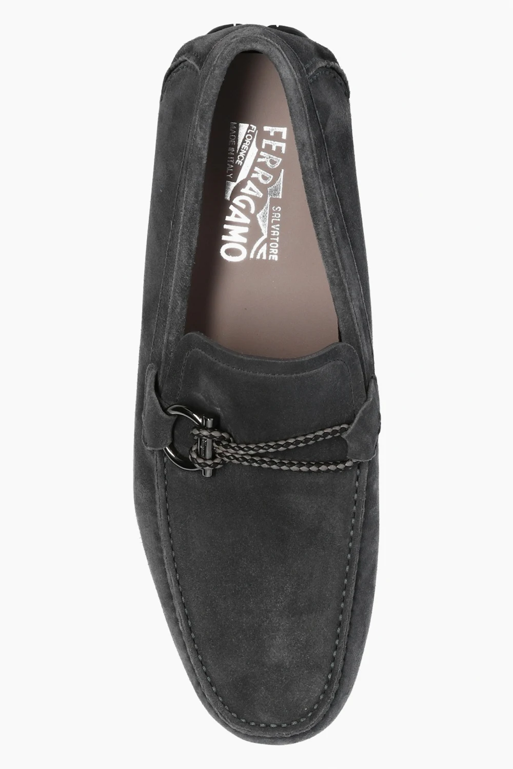 Szare mokasyny, model ‘Raion’ Salvatore Ferragamo. Wykonane z zamszu. Pasek ozdobiony metalową aplikacją w kolorze srebrnym. Czarna, gumowa podeszwa.