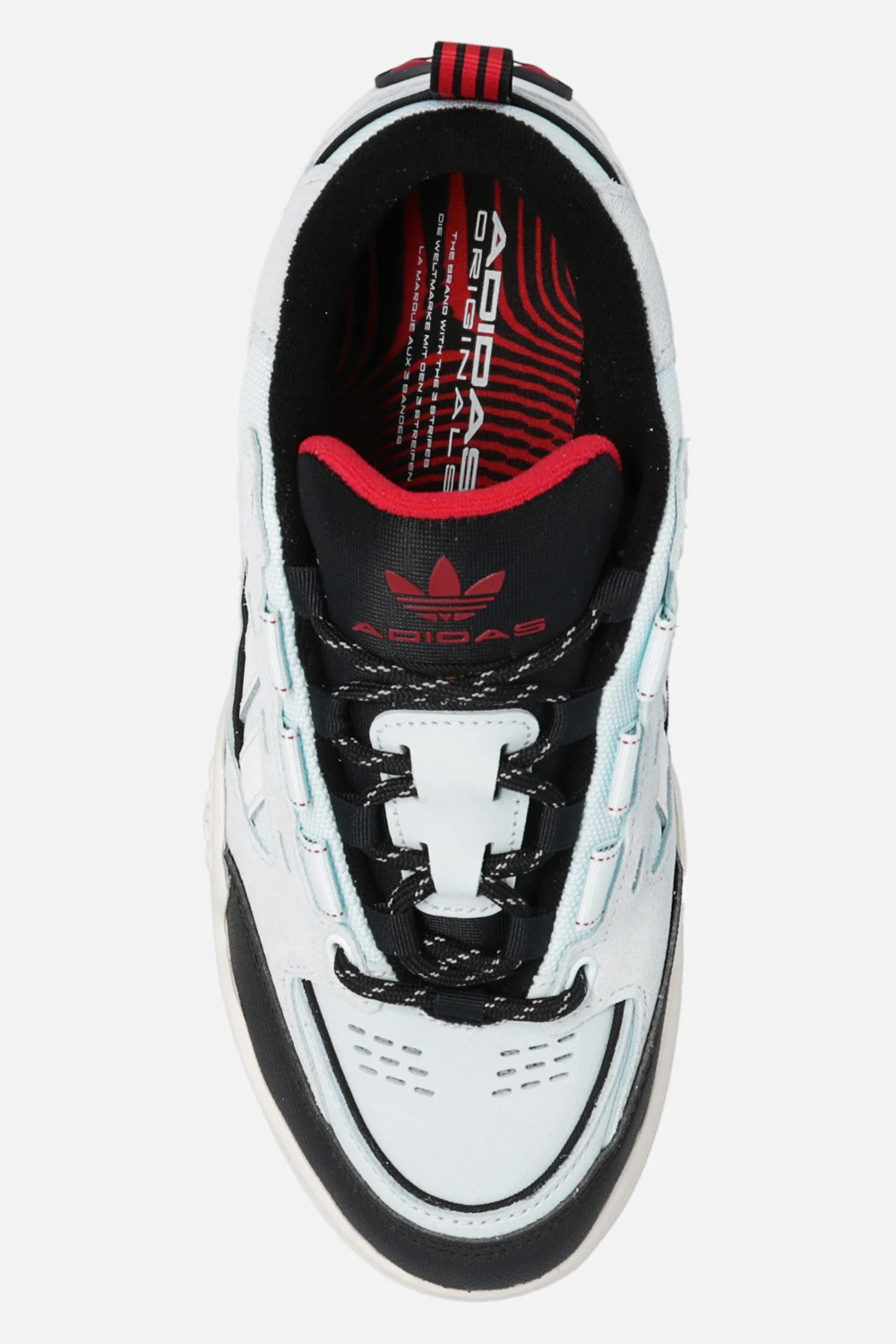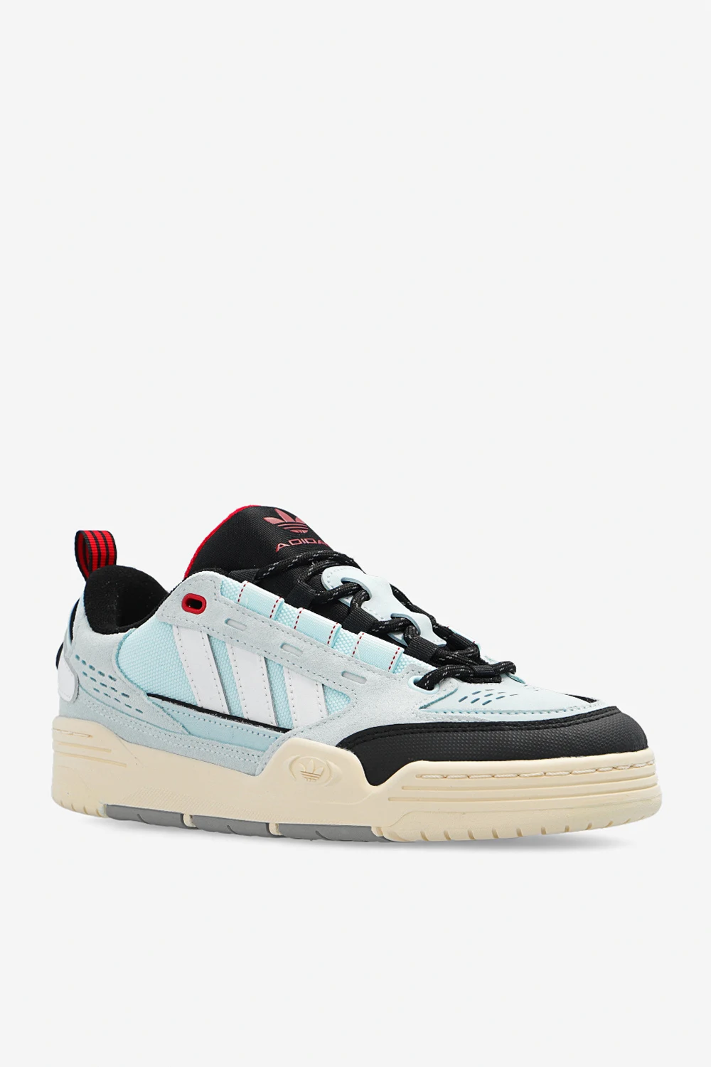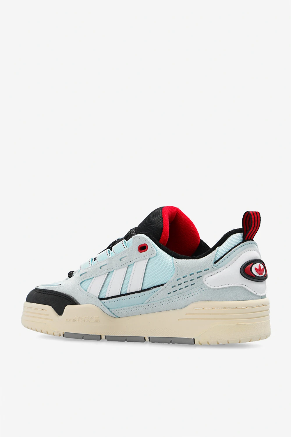 Niebiesko-czarno-białe, sznurowane buty sportowe, model ‘ADI2000’ ADIDAS Originals. Wykonane ze skóry i materiału. Ozdobione logo i trzema charakterystycznymi paskami. Dekoracyjne perforacje. Czerwone wykończenie i detale. Kremowo-szaro-czerwona, gumowa podeszwa. Dołączone wymienne sznurowadła.