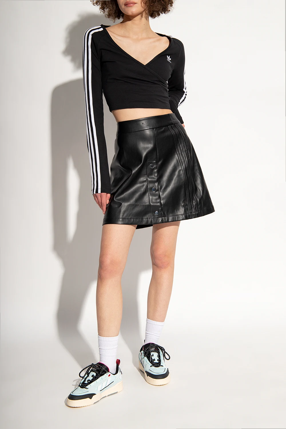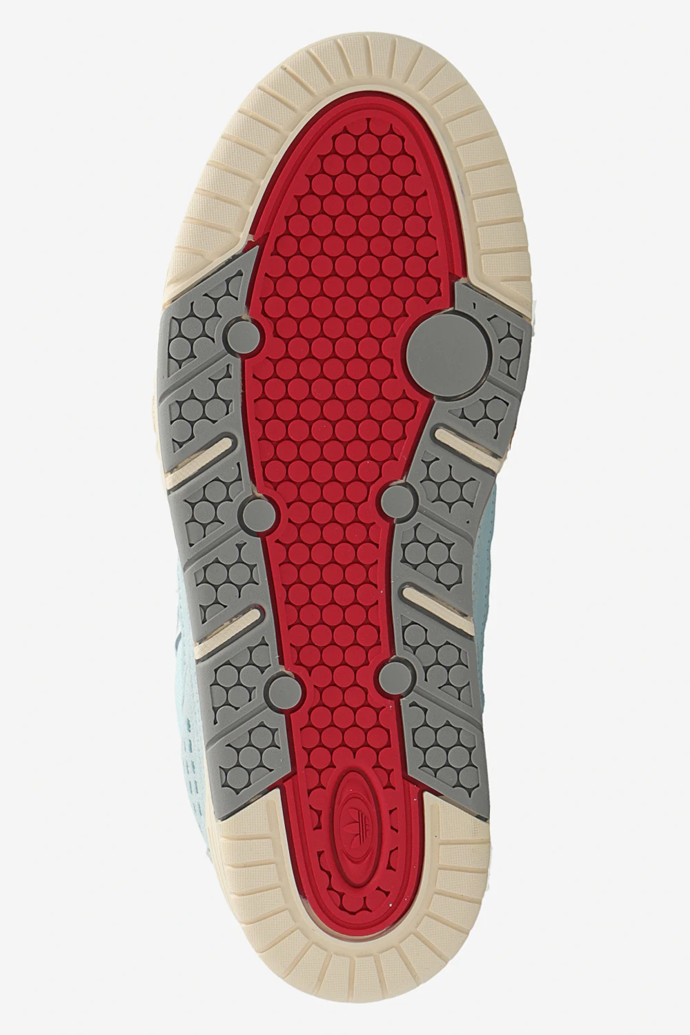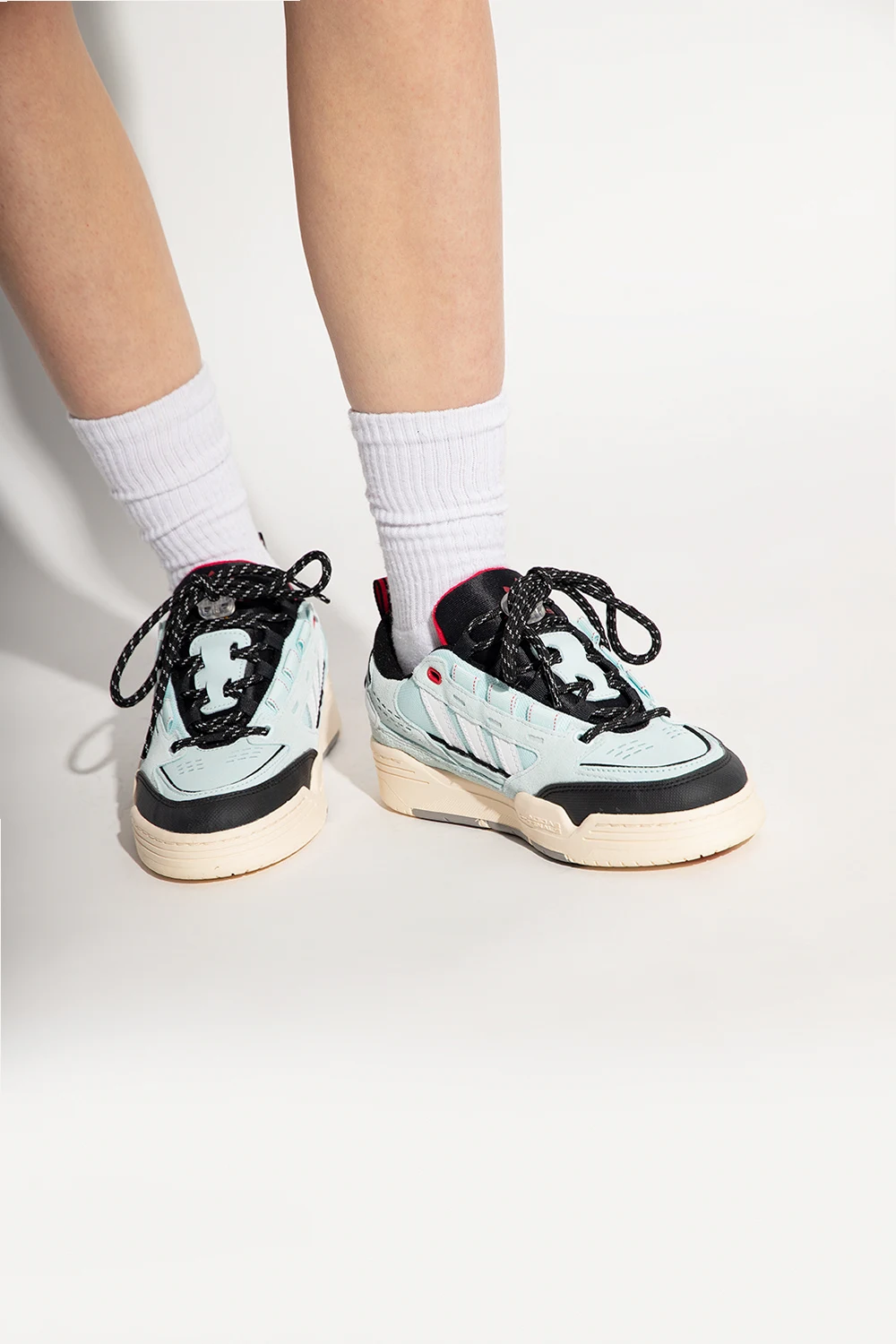 Niebiesko-czarno-białe, sznurowane buty sportowe, model ‘ADI2000’ ADIDAS Originals. Wykonane ze skóry i materiału. Ozdobione logo i trzema charakterystycznymi paskami. Dekoracyjne perforacje. Czerwone wykończenie i detale. Kremowo-szaro-czerwona, gumowa podeszwa. Dołączone wymienne sznurowadła.