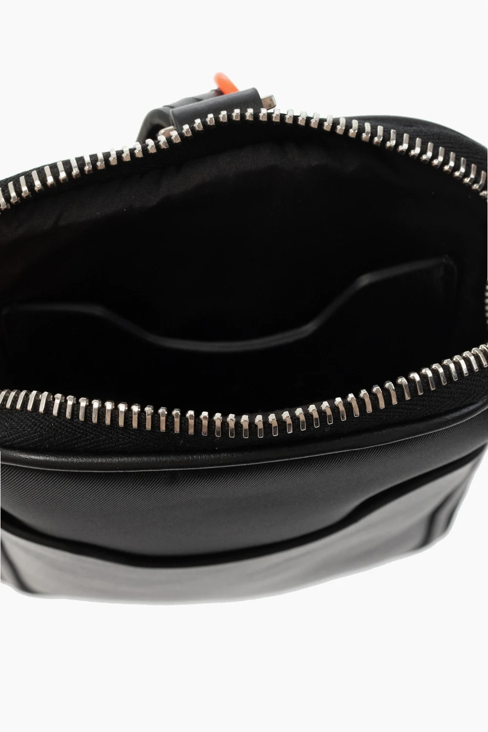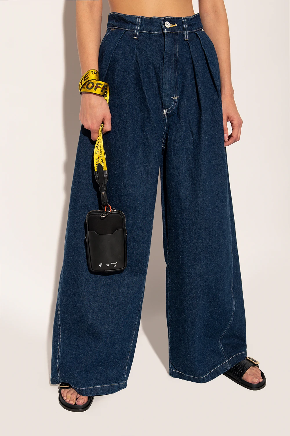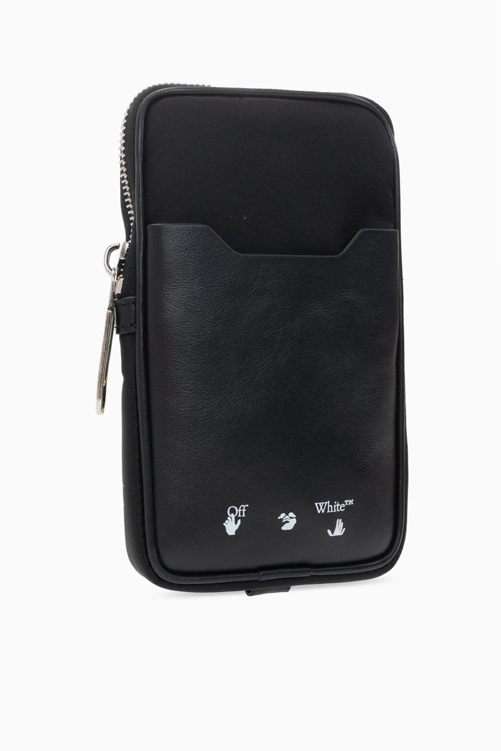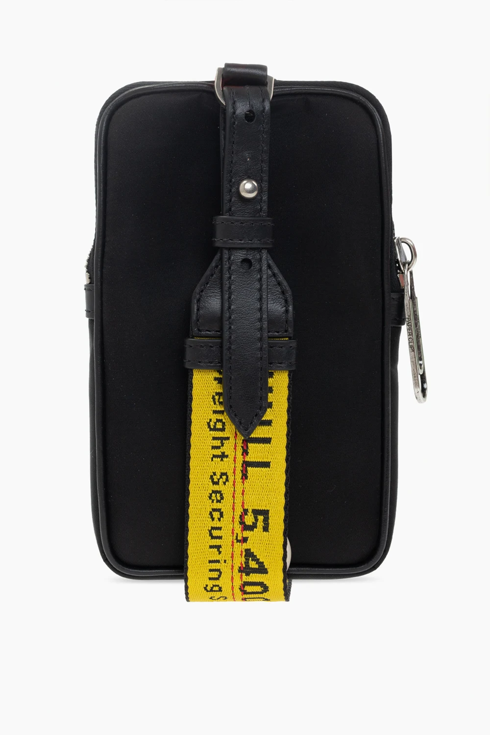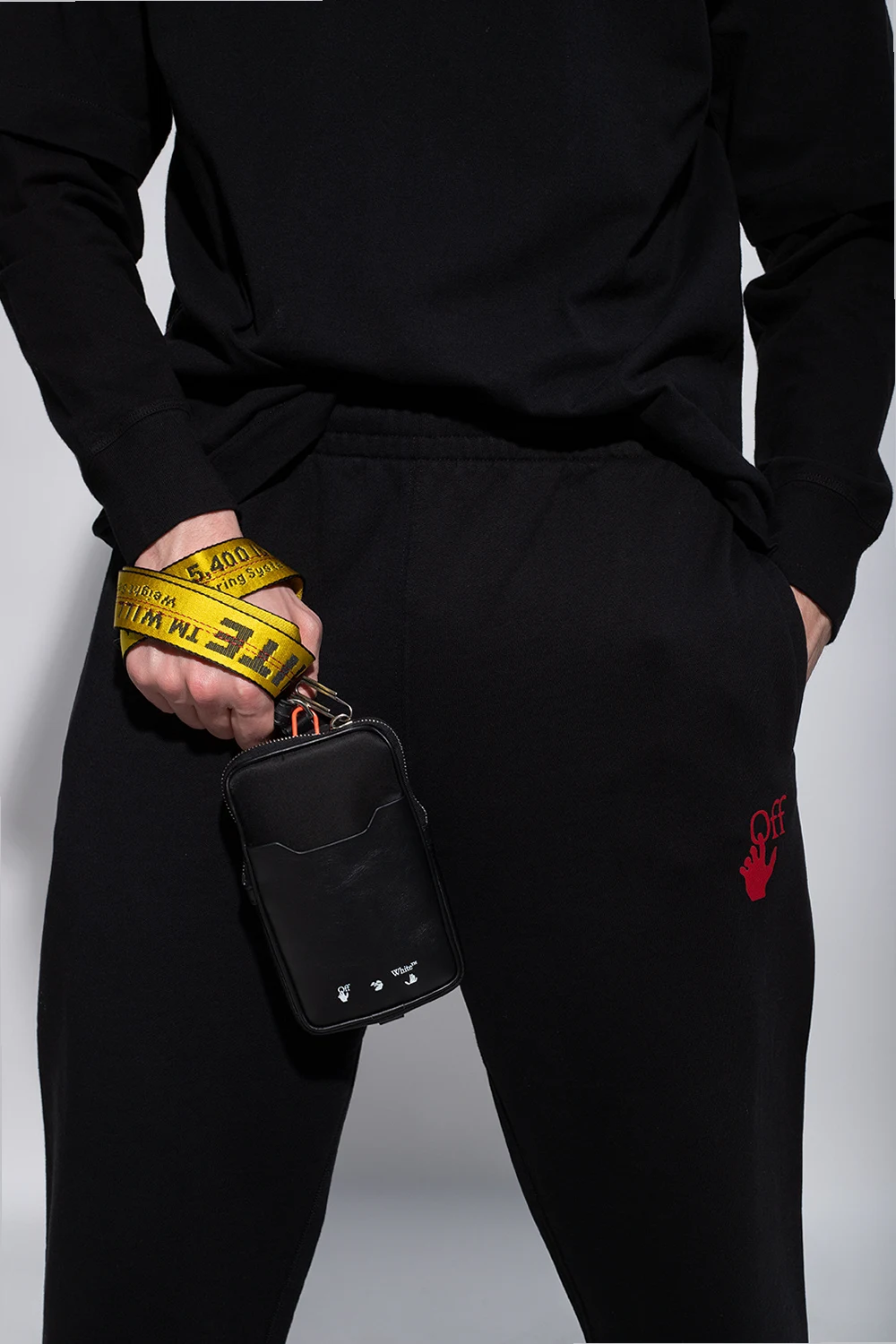 Czarna saszetka Off-White. Zamykana na zamek. Z przodu wsuwana kieszeń oraz nadrukowane logo w kolorze białym. Na dole brelok. Odpinany pasek w kolorze żółtym z logo w kolorze czarnym oraz czerwonymi przeszyciami. Wewnątrz komora i wsuwana kieszeń. Metalowe elementy w kolorze srebrnym.