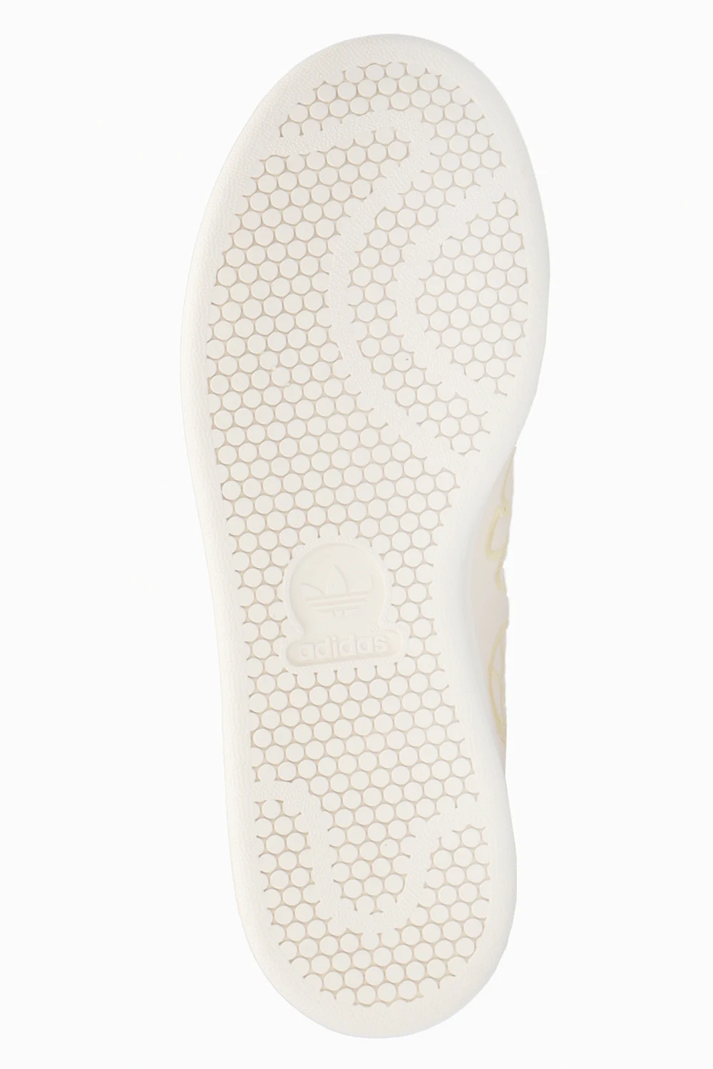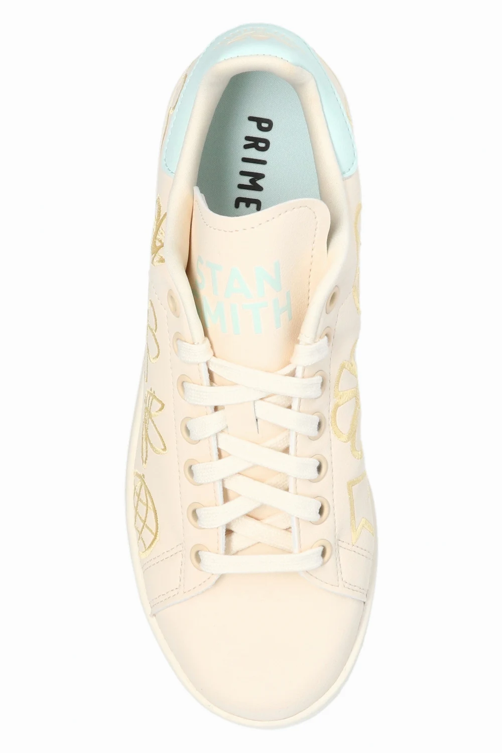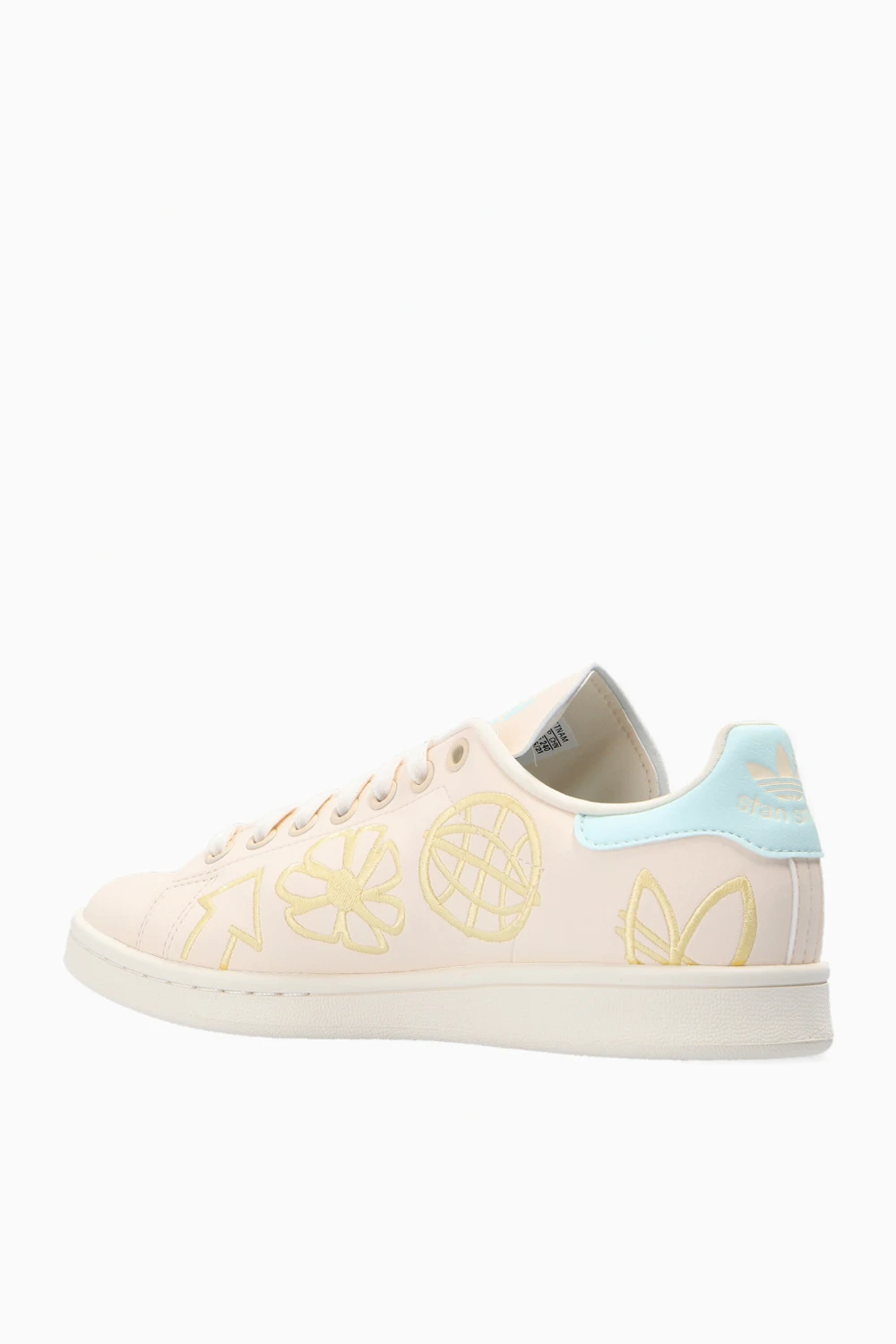 Beżowe, sznurowane buty sportowe, model ‘Stan Smith’ ADIDAS Originals, linia ‘Primegreen’. Wykonane z wegańskiego materiału imitującego skórę. Wyszyty jasnoróżowy wzór. Z tyłu jasnoniebieska wstawka. Kremowa, gumowa podeszwa.