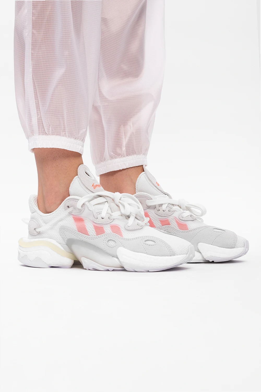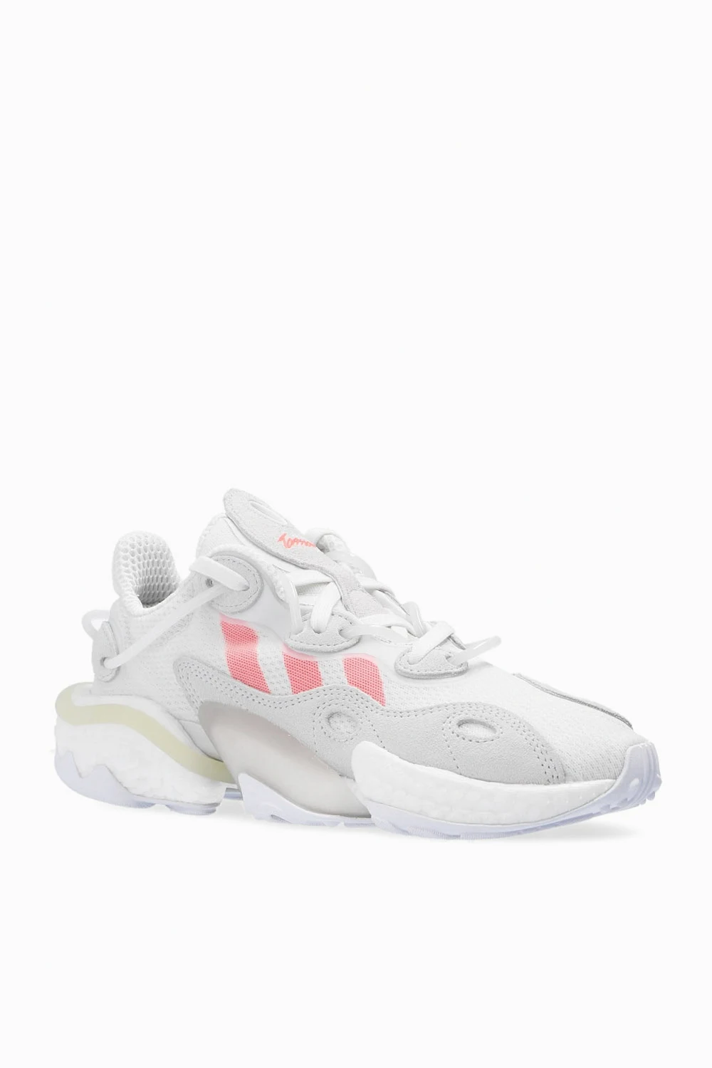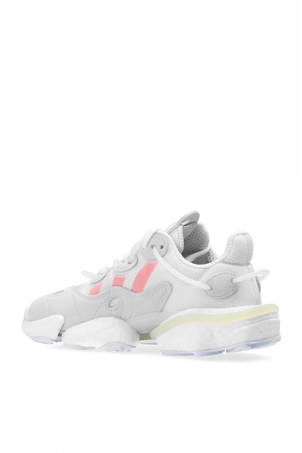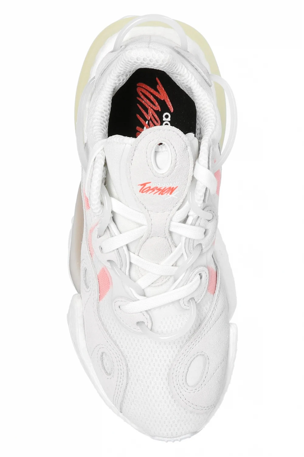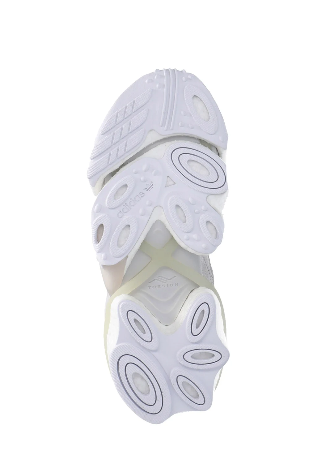 Beżowo-białe, sznurowane buty sportowe, model ‘Torsion X W’ ADIDAS Originals. Wykończone zamszem. Na języku nadruk z logo. Po bokach charakterystyczne dla marki trzy paski. Dołączone transparentne, gumowe sznurowanie. Podeszwa środkowa z amortyzującymi wstawkami z pianki Boost. Kremowa, gumowa podeszwa.
