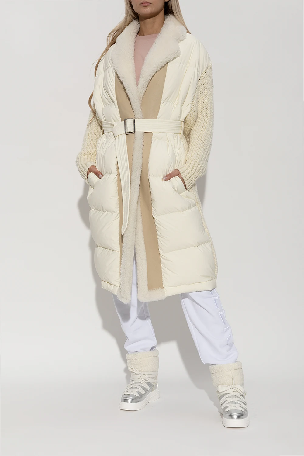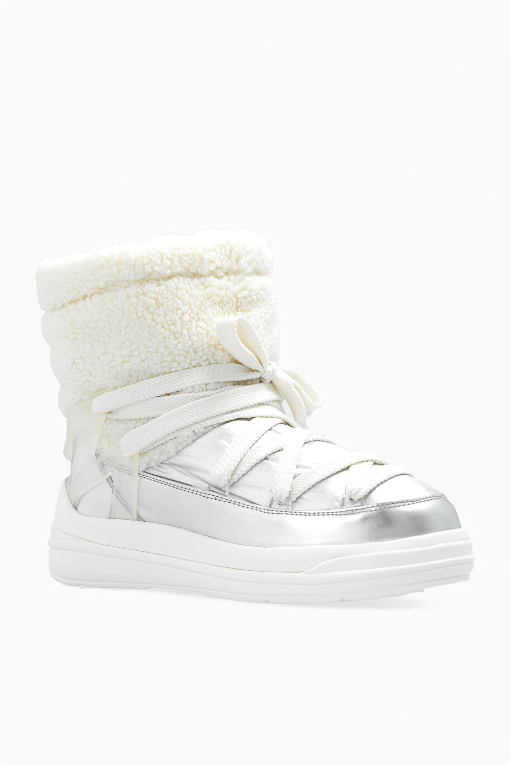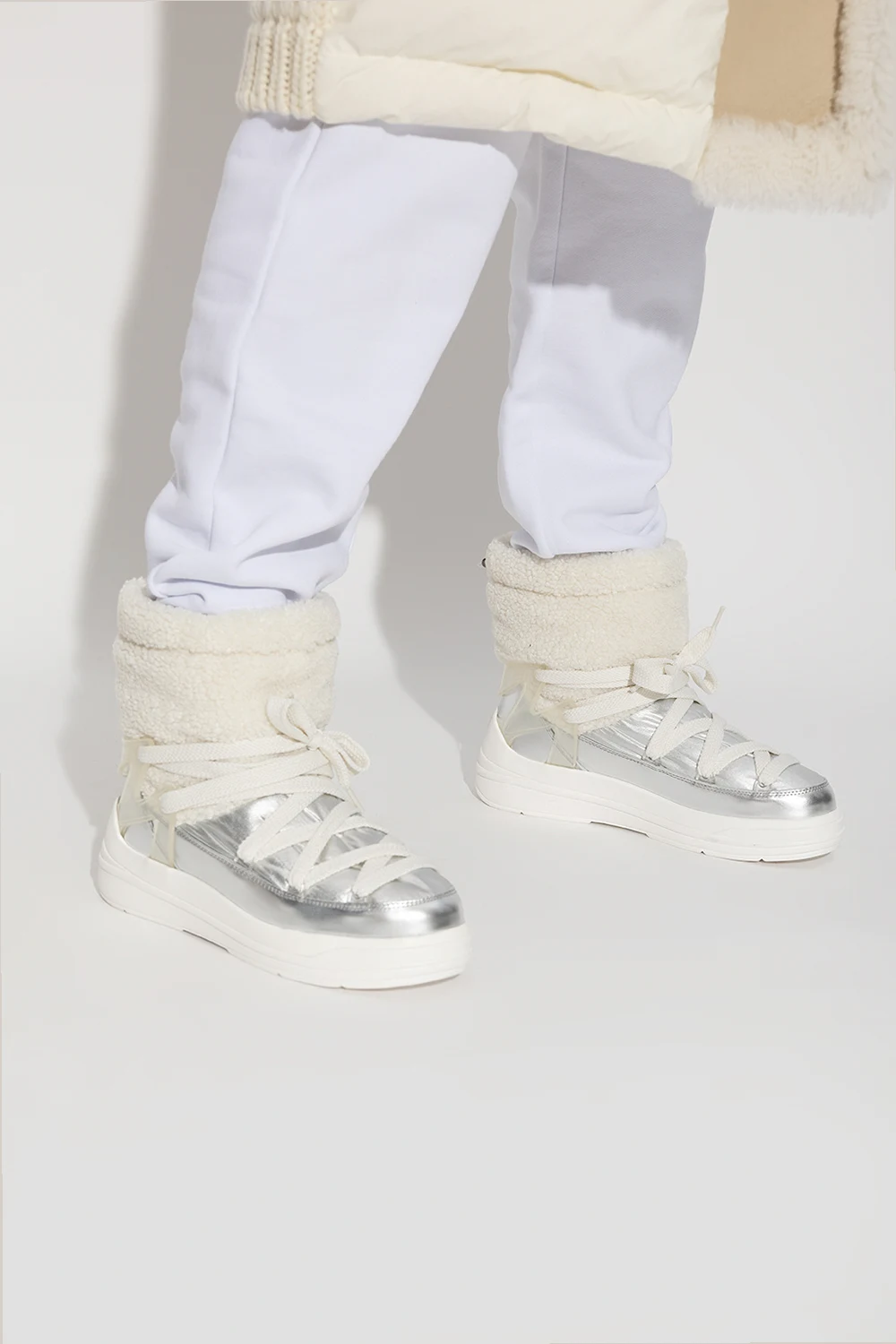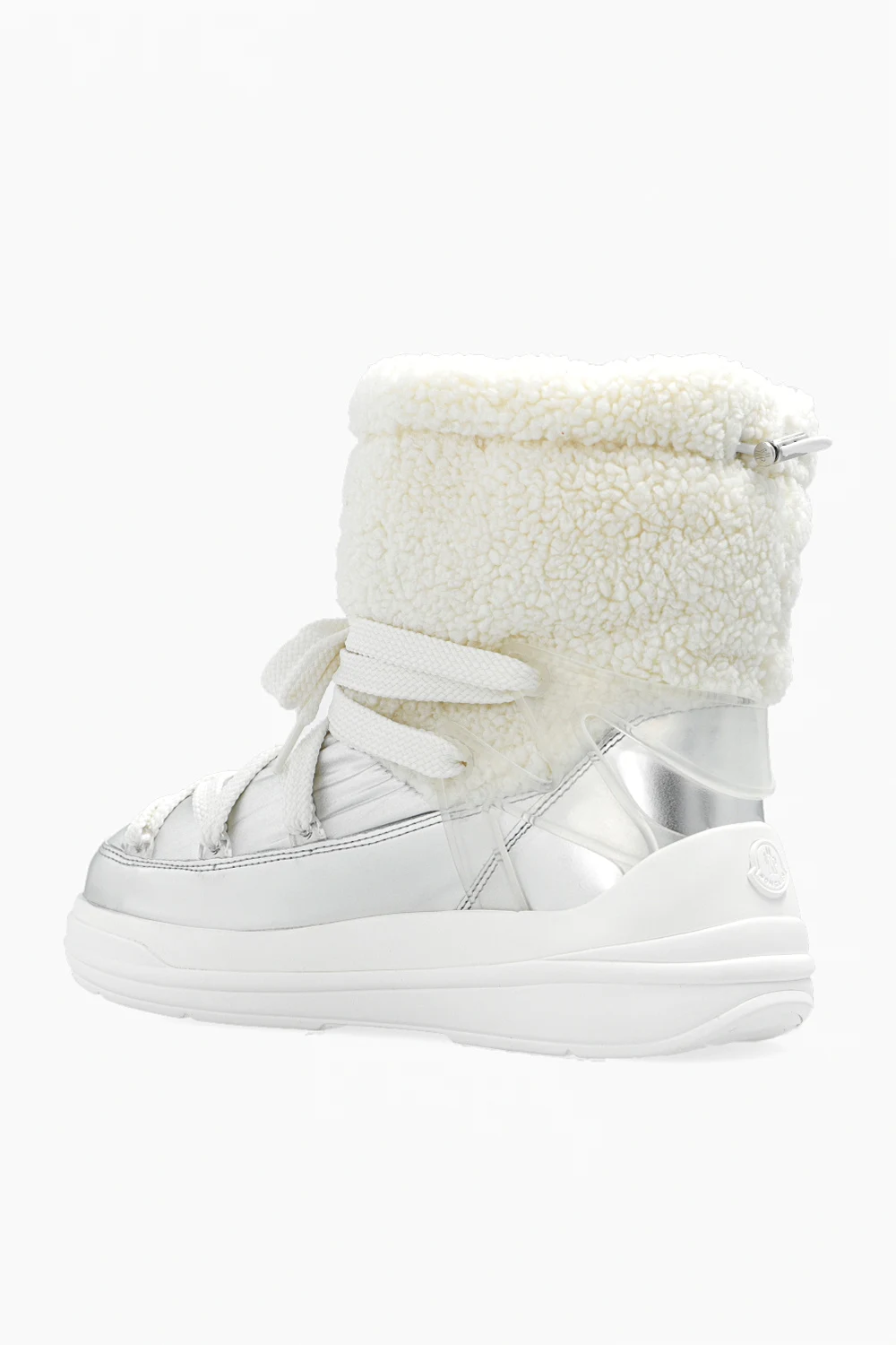 Śniegowce w kolorze biało-srebrnym, model ‘Insolux M’ Moncler. Wykonane ze skóry o metalicznym wykończeniu oraz imitacji futra. Wzmocnione wodoodporną membraną. Ściągane z tyłu trokami i wiązane z przodu. Ozdobione wypukłym logo oraz gumową, transparentną wstawką. Podeszwa środkowa z pianki EVA. Biała podeszwa zewnętrzna wykonana z TPU.