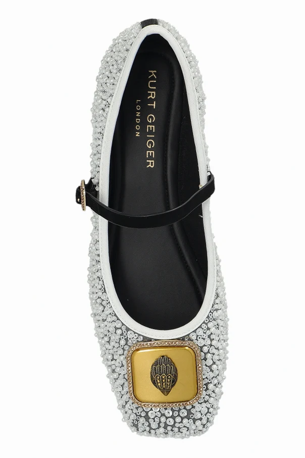 Niezwykłe wrażenie potęguje złota, kwadratowa aplikacja z motywem projektanta, którą umieszczono na przodzie baleriny. Czarne, delikatne paski z metalową sprzączką dodają nuty kontrastu i wyrafinowania, podkreślając wyjątkowy charakter produktu. Wnętrze ozdobiono nadrukiem złotą czcionką, świadczącym o autentyczności wyrobu Kurt Geiger London .