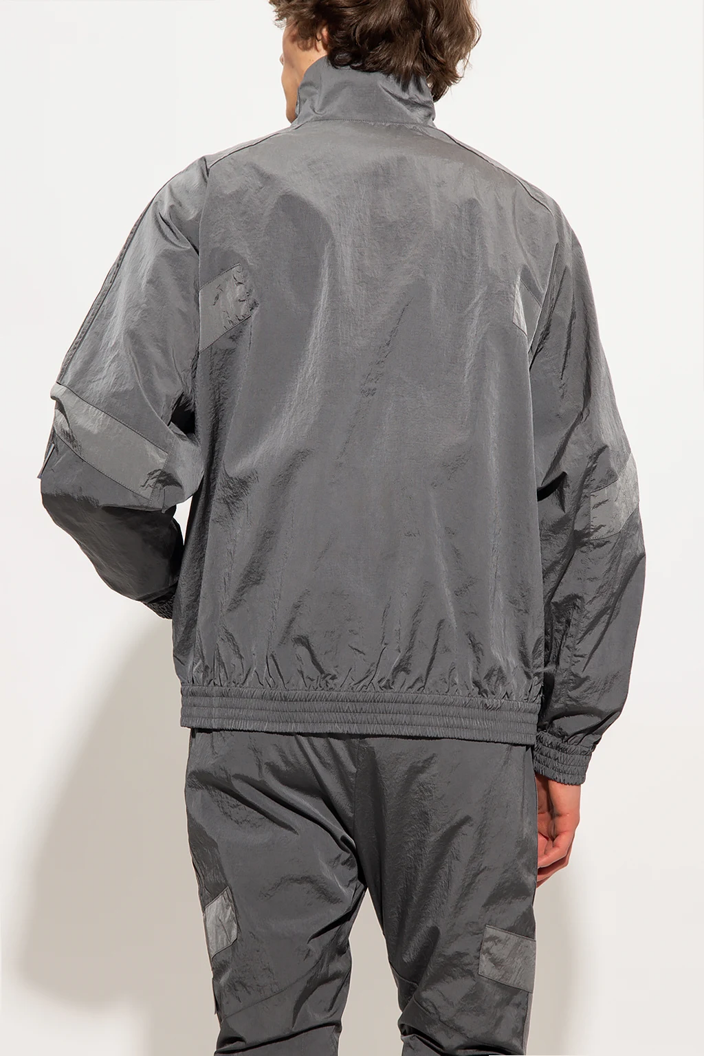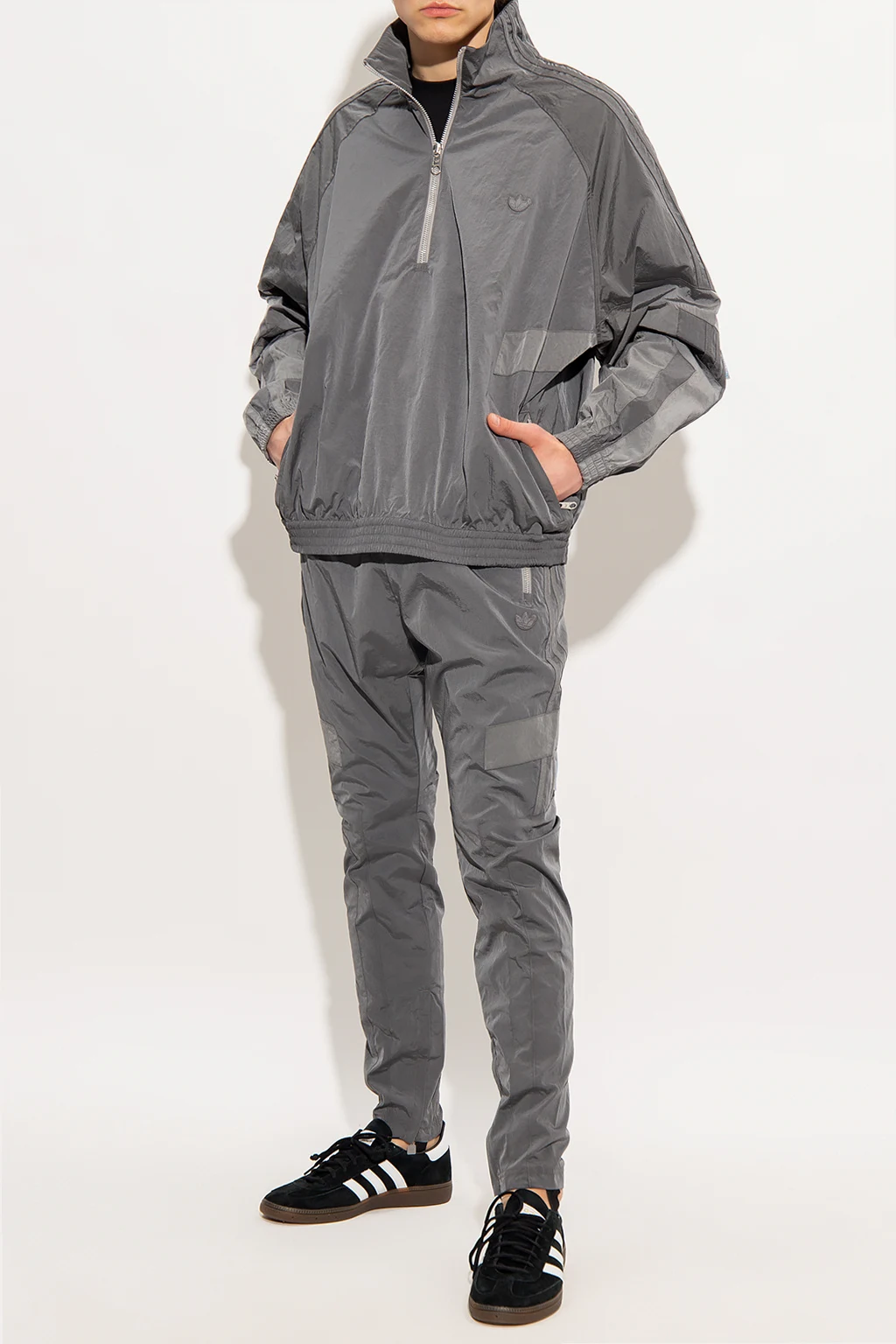 Szara kurtka ortalionowa w stylu ‘vintage’ ADIDAS Originals, kolekcja ‘Blue Version’, linia ‘End Plastic Waste’. Inspirowany sportem, a jednocześnie wyprzedzający trendy model czerpie inspirację z dresu ‘Aloxie’ - popularnego w latach 90., wyróżniającego się kontrastowymi panelami w sportowym stylu. W tej wersji wykonany z wysokiej jakości tkaniny typu ‘ripstop’ o delikatnym połysku z trwałą, wodoodporną powłoką ‘DWR’. Luźny krój ze stójką, zapinany na krótki zamek. Z przodu naszywka z logo ‘Trefoil’. Ozdobiona naszytymi panelami oraz charakterystycznymi dla marki trzema paskami. Dwie kieszenie na zamek. Długie rękawy oraz dół wykończone ściągaczami.